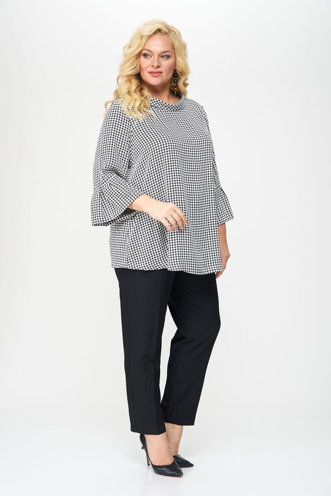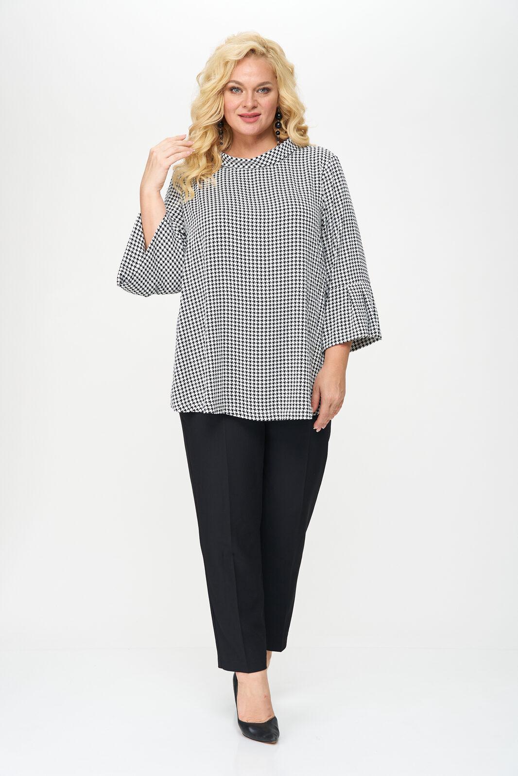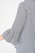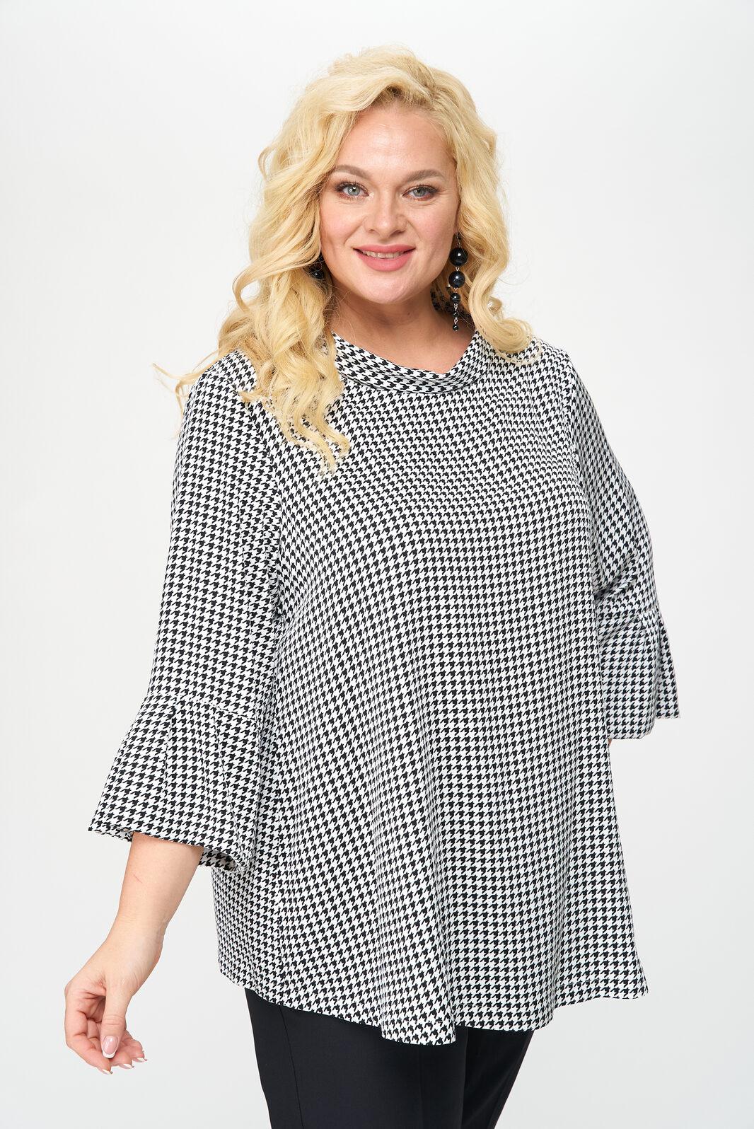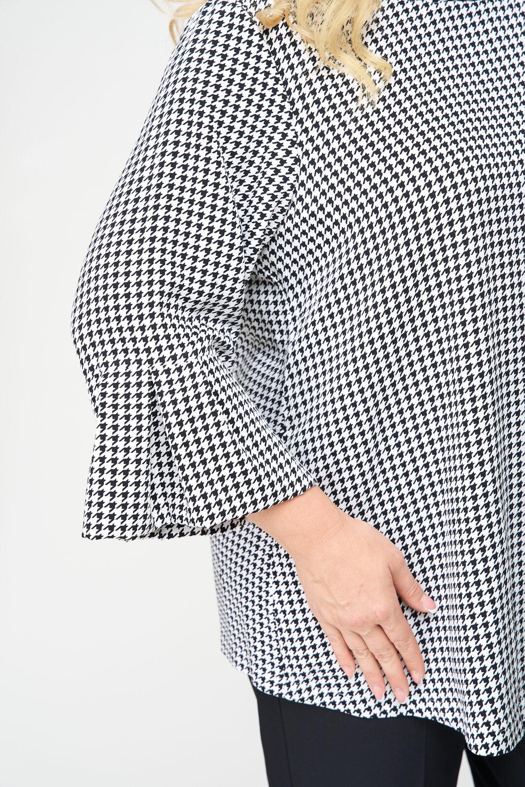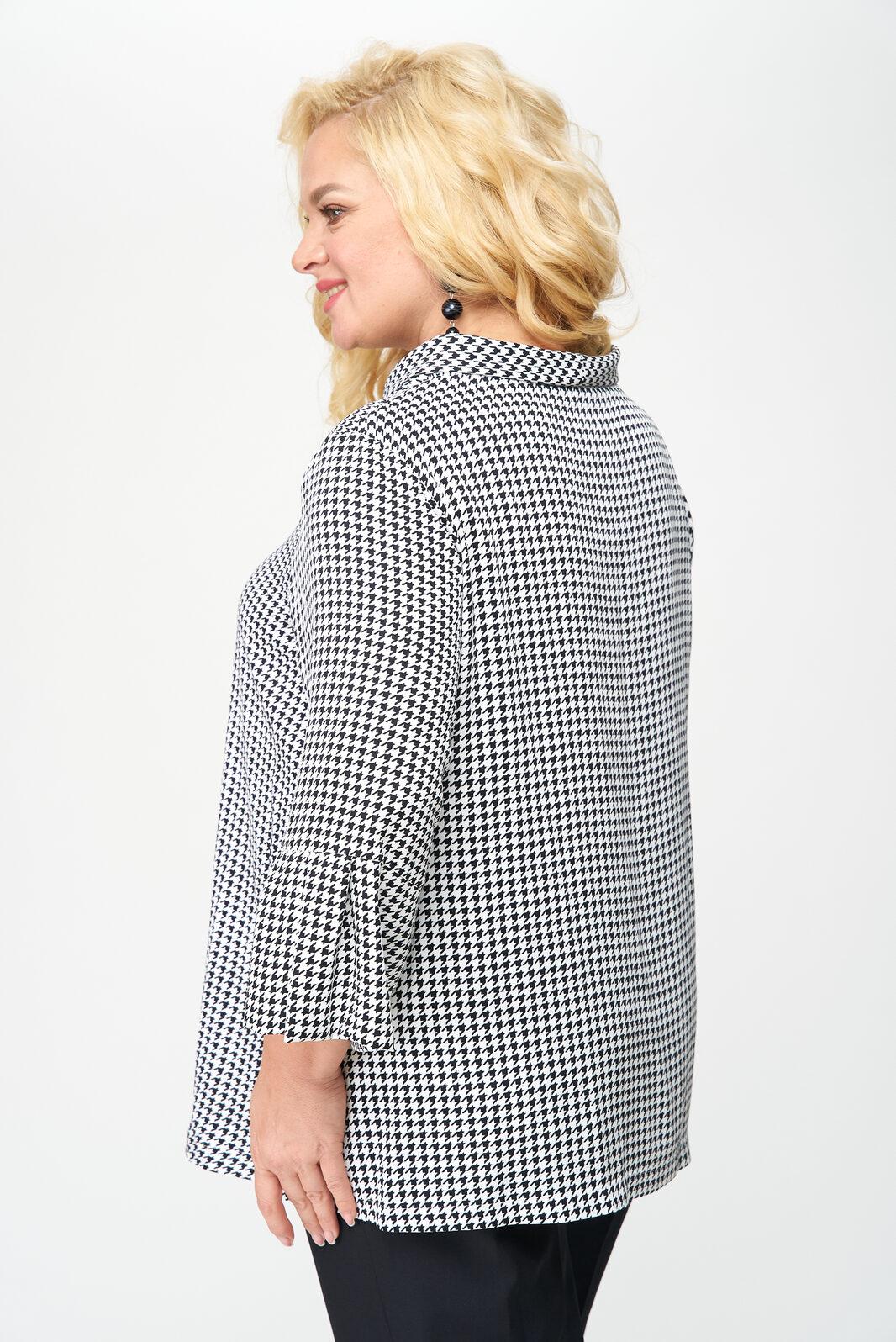 Блуза женская выполнена из плательной ткани, рисунок гусиная лапка, А-образного силуэта, с незаметной асимметрией по низу, между спинкой и передней частью. Рукав втачной, длина – три четверти. По низу рукава манжет с мягкими складками в стиле оригами. Горловина овальной формы, оформлена мягкой стойкой.