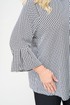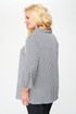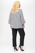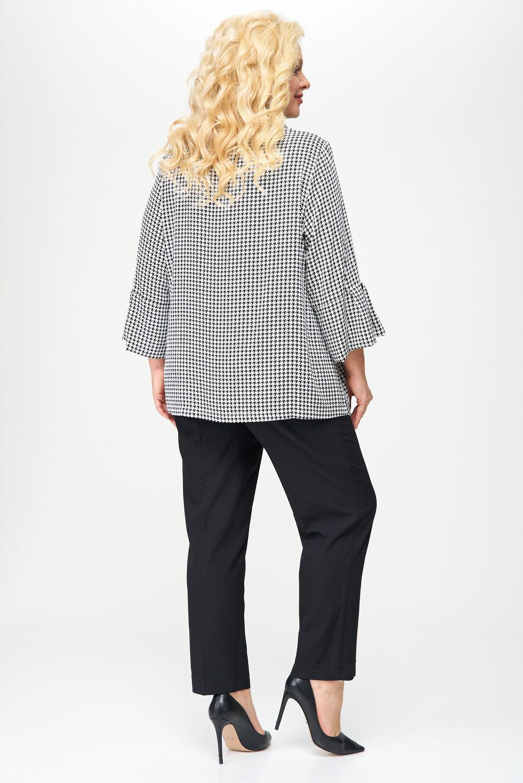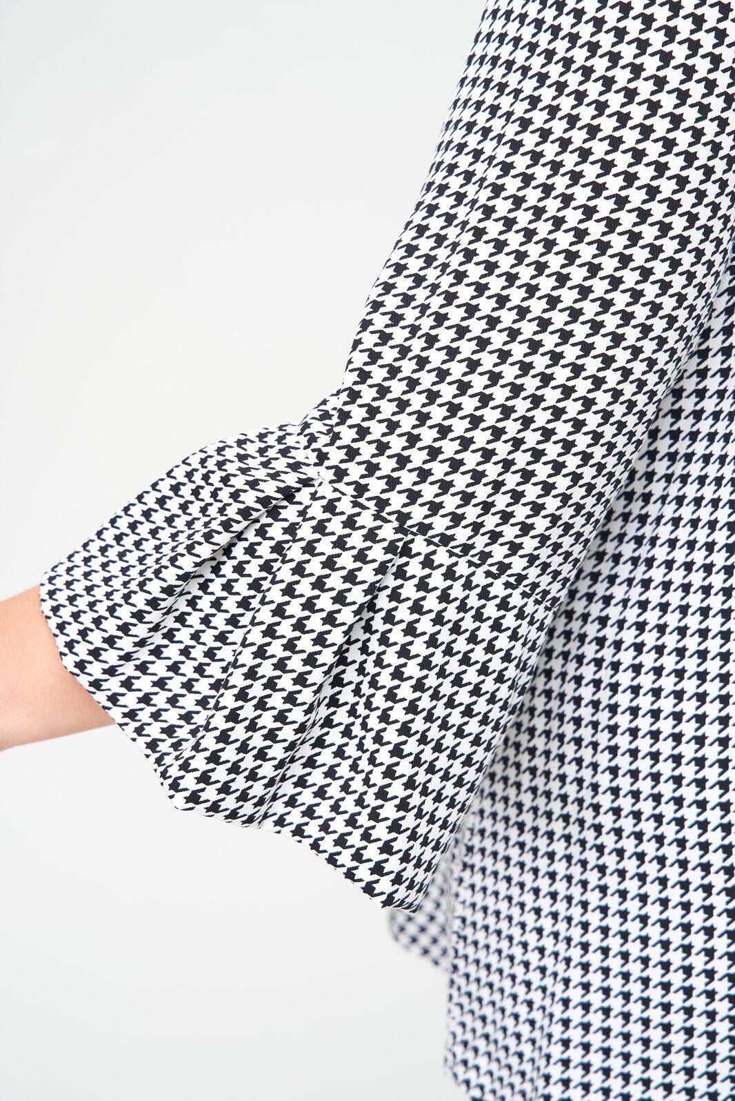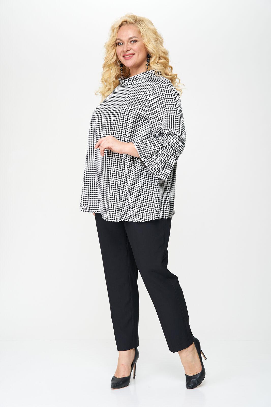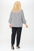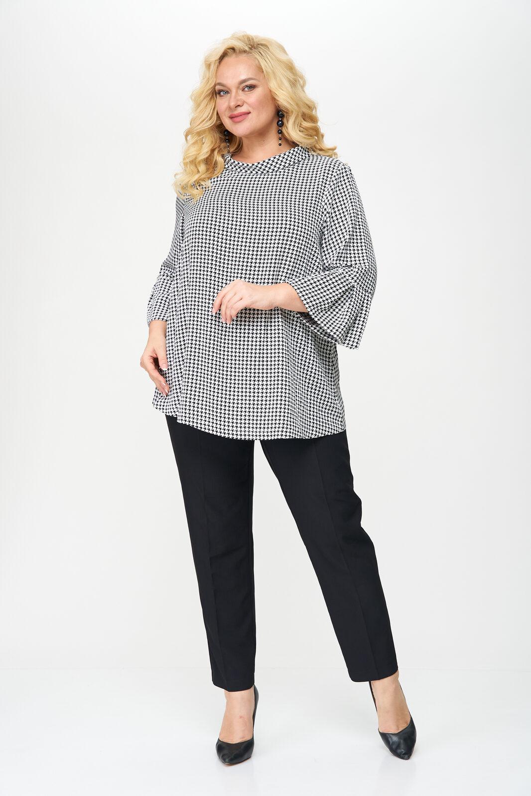 Блуза женская выполнена из плательной ткани, рисунок гусиная лапка, А-образного силуэта, с незаметной асимметрией по низу, между спинкой и передней частью. Рукав втачной, длина – три четверти. По низу рукава манжет с мягкими складками в стиле оригами. Горловина овальной формы, оформлена мягкой стойкой.