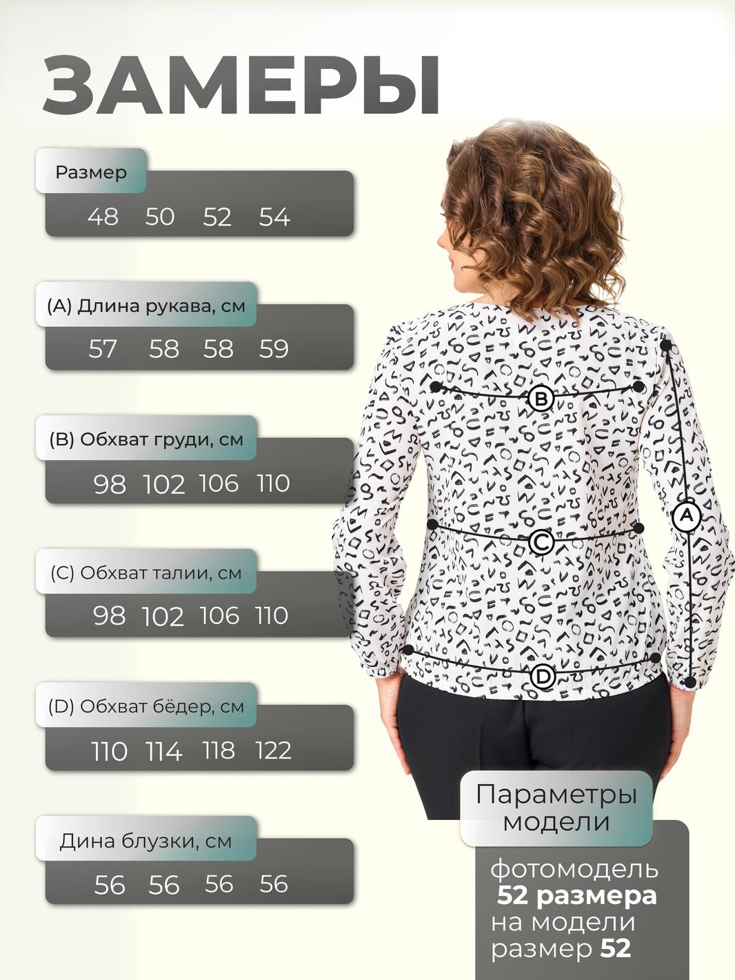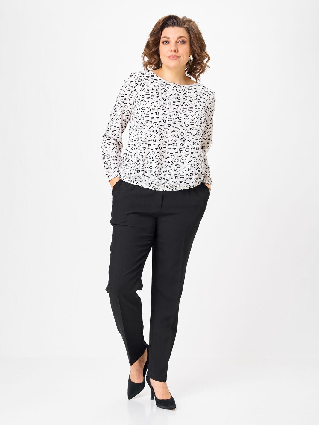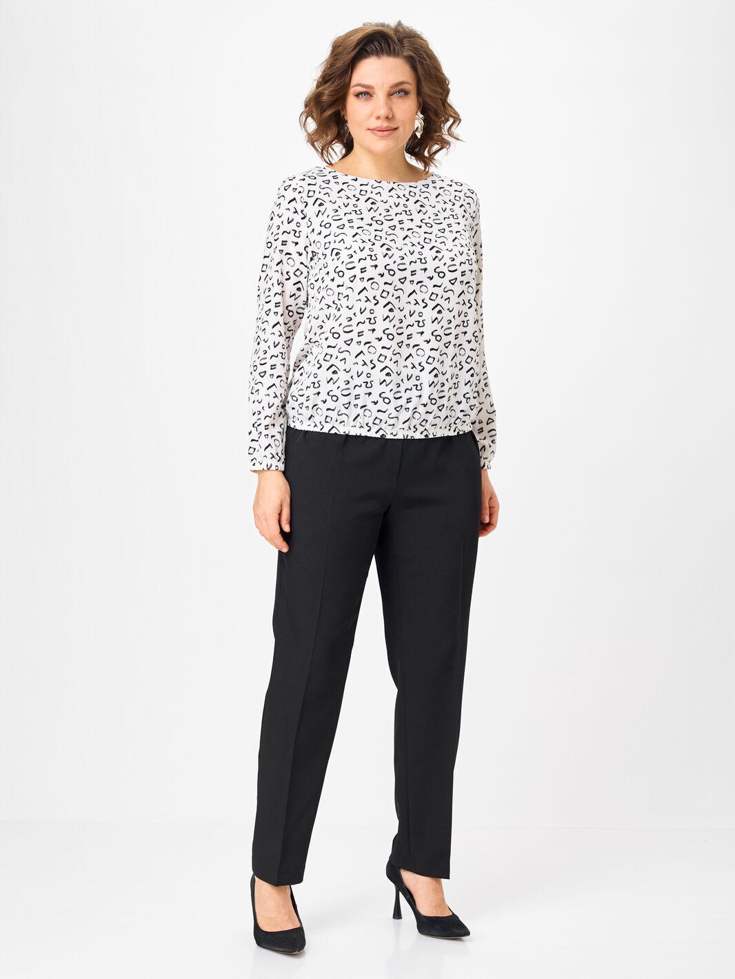 • Универсальность 365: Белый фон с ярким черно-белым принтом делает блузу базовой, но не скучной. Она отлично смотрится в классическом образе с черными брюками (как на фото), в офисе под жакет, на прогулке с джинсами или на праздничном ужине. Подходит для любого сезона.