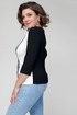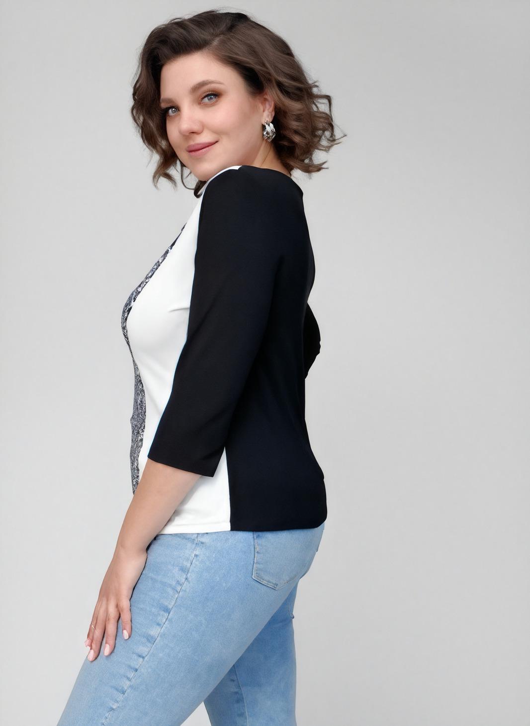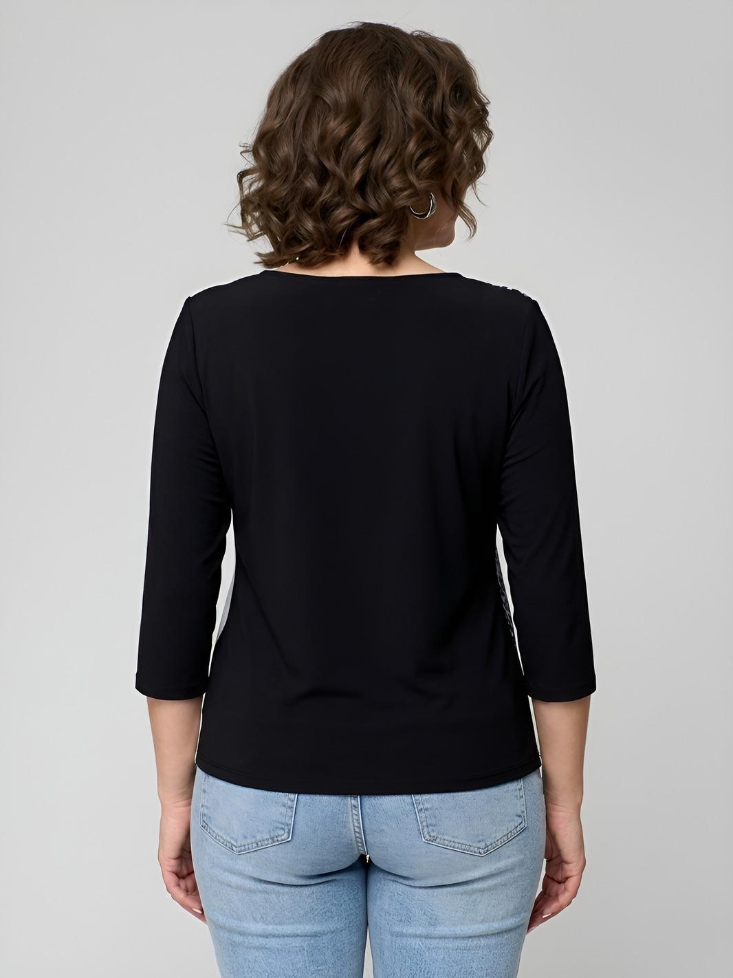 • Цельнокроеные рукава: Отсутствие плечевого шва в сочетании с эластичностью ткани гарантирует идеальную посадку на руки любой полноты. Рукав длиной 3/4 открывает запястья, добавляя образу легкости.