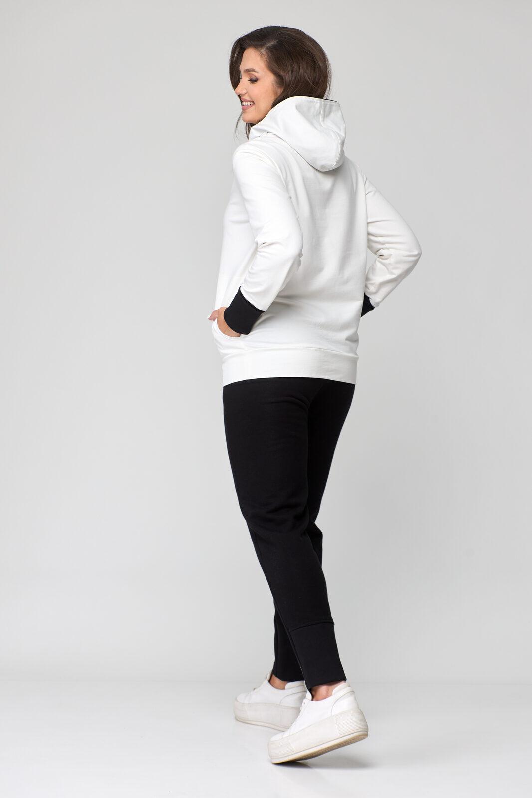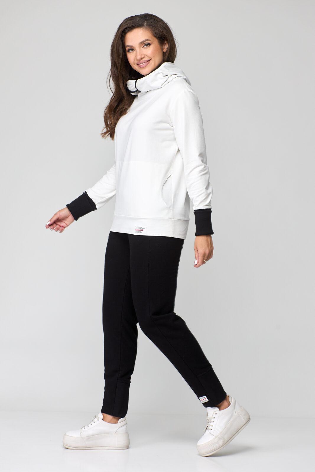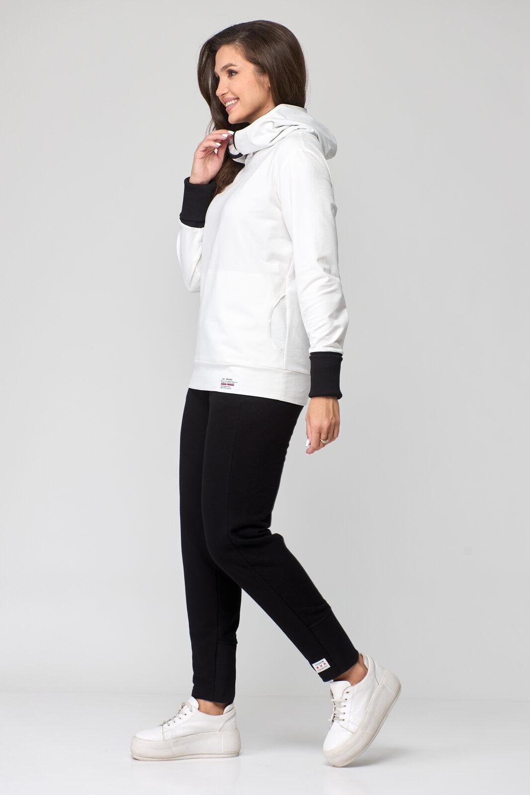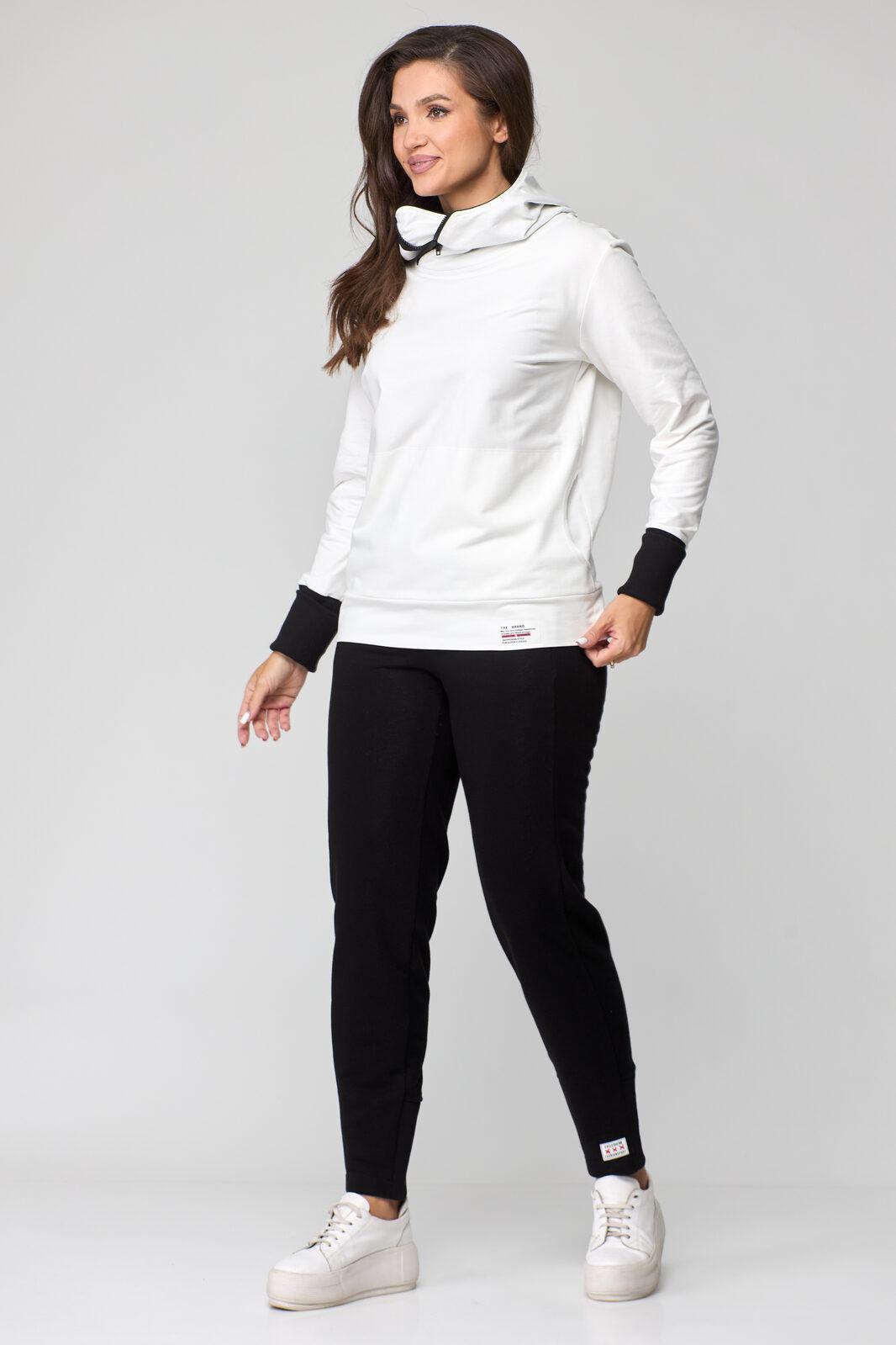 В свитшоте по переду фигурные карманы-кенгуру. В горловине – капюшон на подкладке из трикотажной вискозы, типа ассасин с центральной фигурной вставкой. По переду застежка на декоративную контрастную молнию в цвет брюк (трактор).
