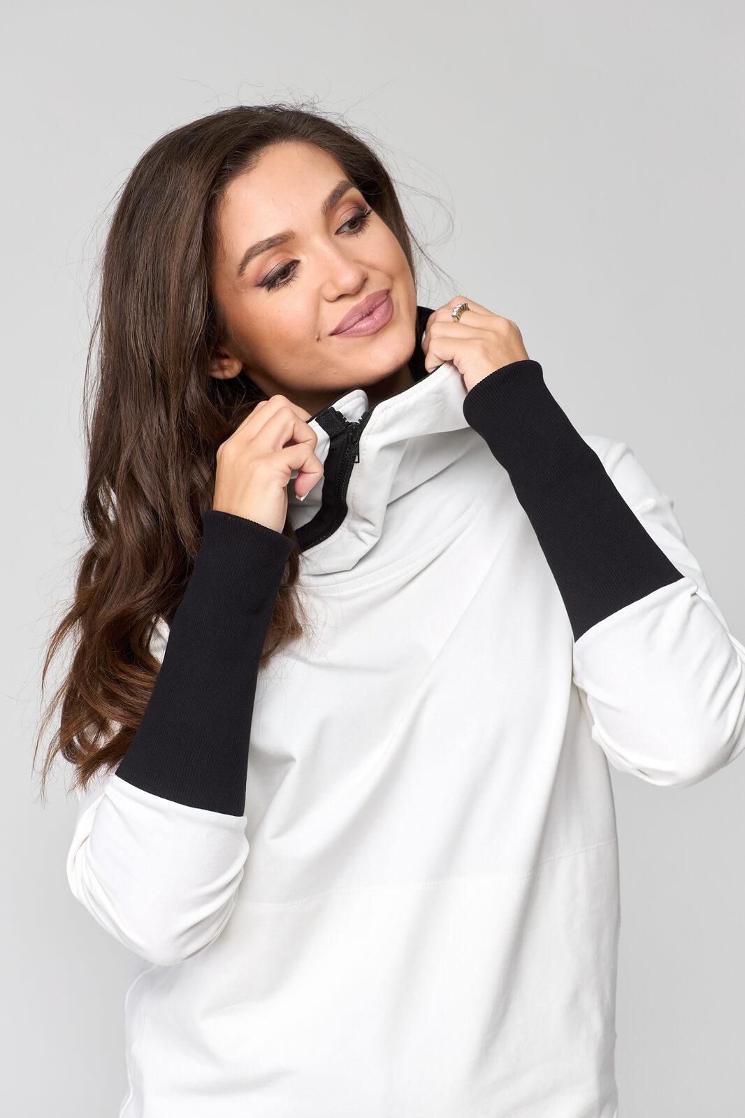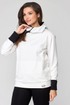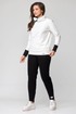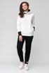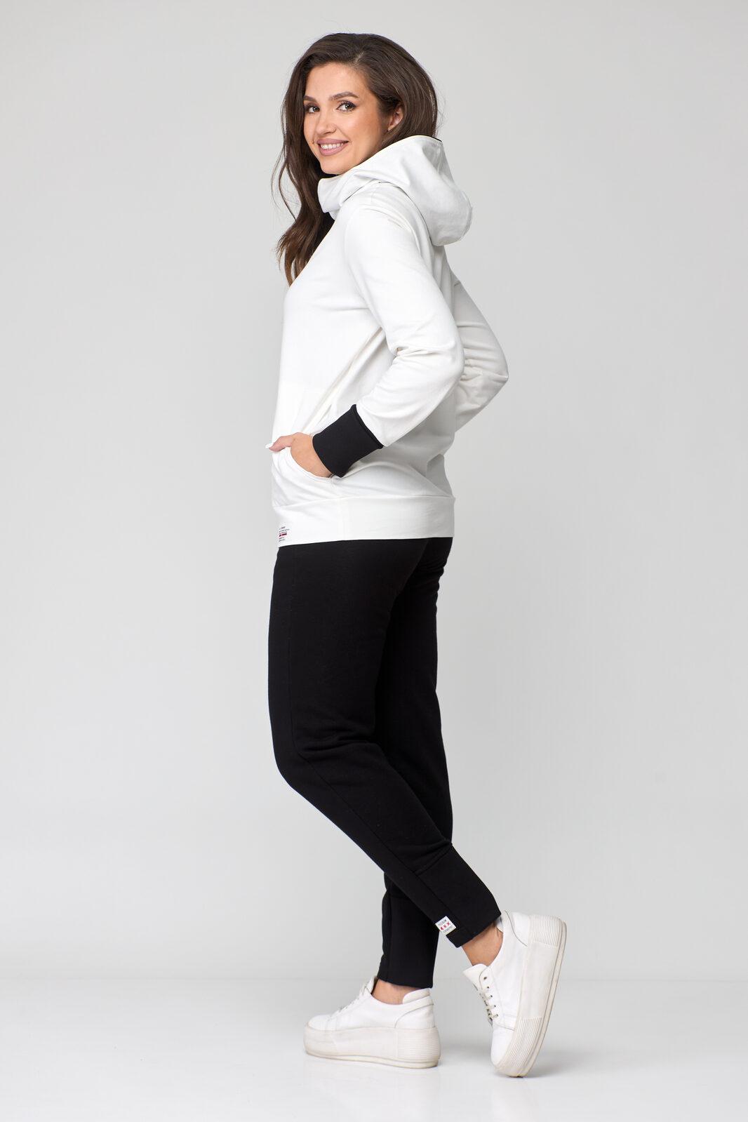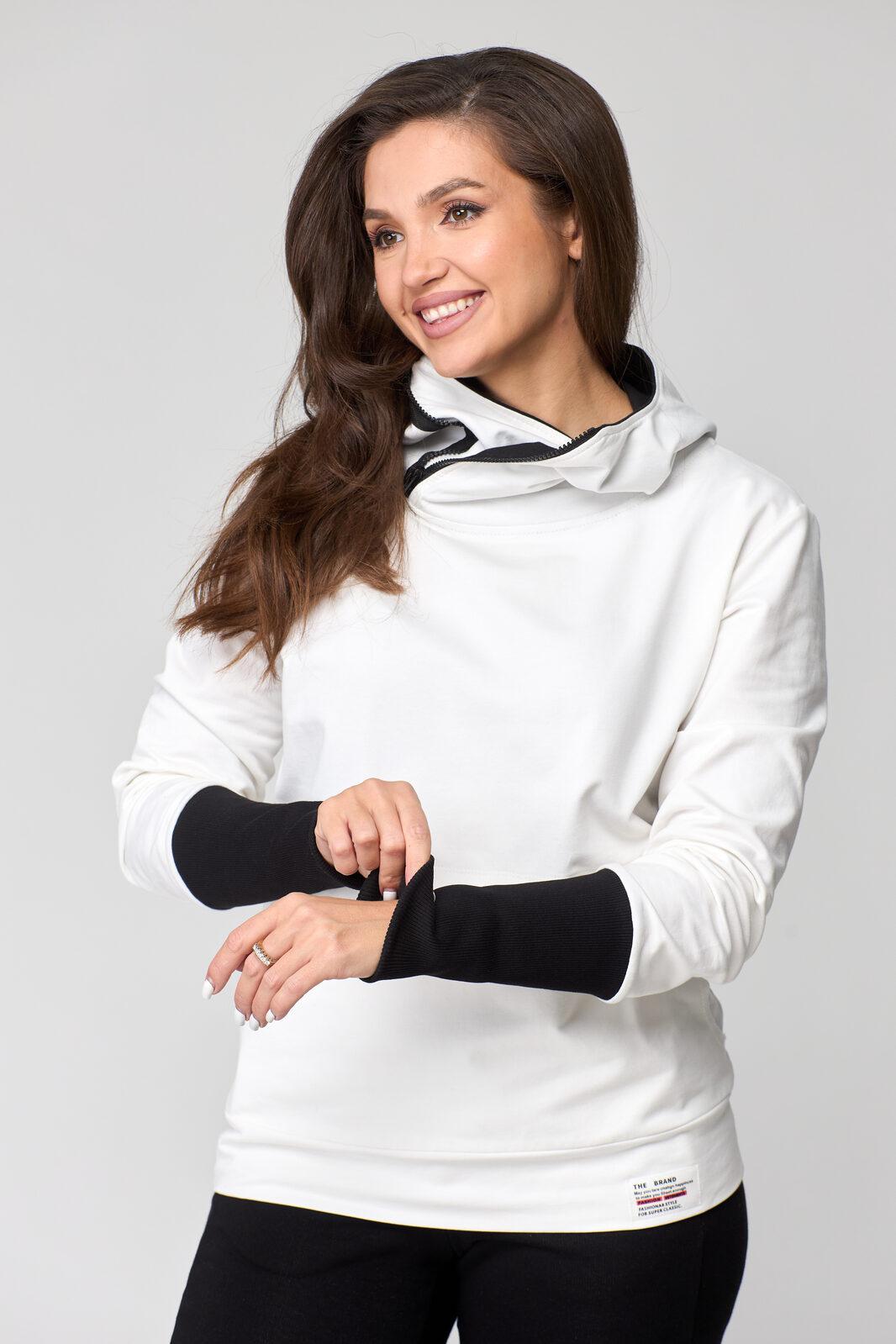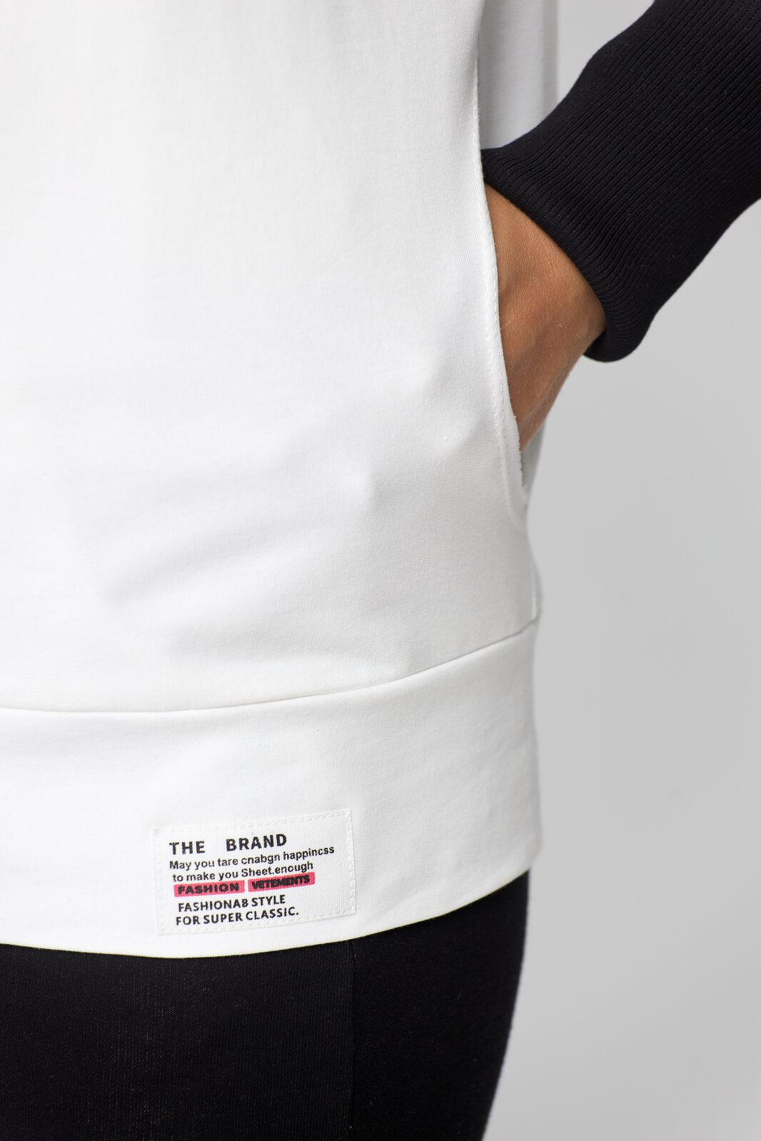 В свитшоте по переду фигурные карманы-кенгуру. В горловине – капюшон на подкладке из трикотажной вискозы, типа ассасин с центральной фигурной вставкой. По переду застежка на декоративную контрастную молнию в цвет брюк (трактор).