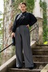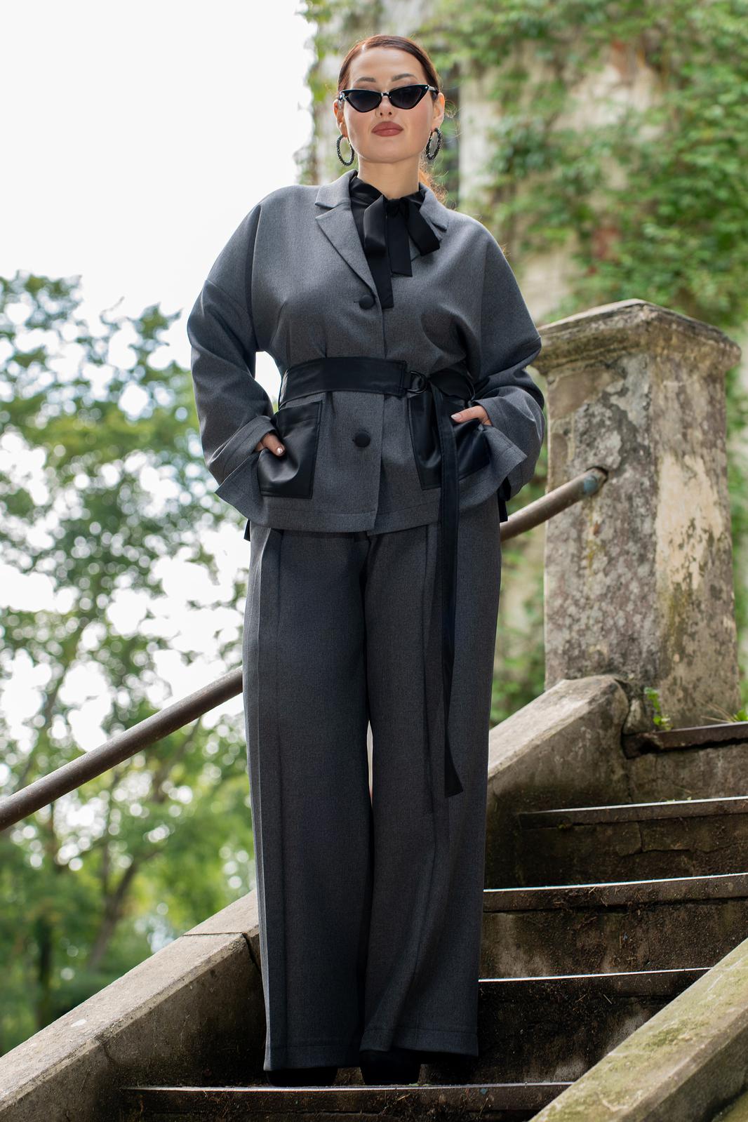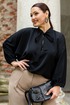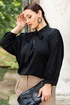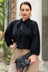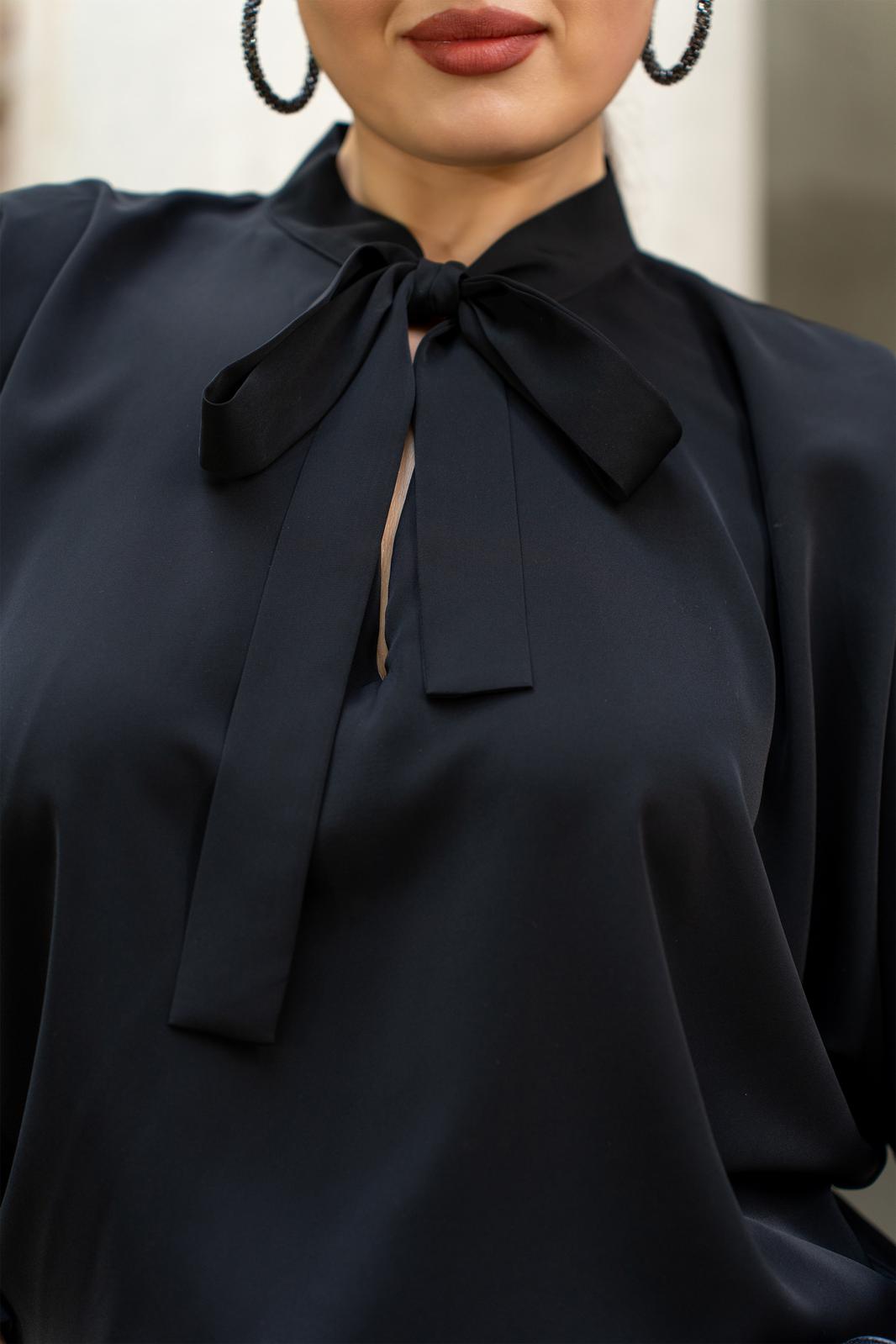Элегантная женская блузка черного цвета, выполненная в стиле летучая мышь, идеально подойдет как для торжественного мероприятия, так и для повседневной носки. Блузка со стойкой-завязкой, добавляющими изысканности образу. Цельнокроеные рукава с застежкой на петлю и пуговицу.Асимметричный низ блузки спереди короче, сзади длиннее, что придает дополнительный стиль. Эта блузка станет изысканным дополнением к вашему гардеробу.