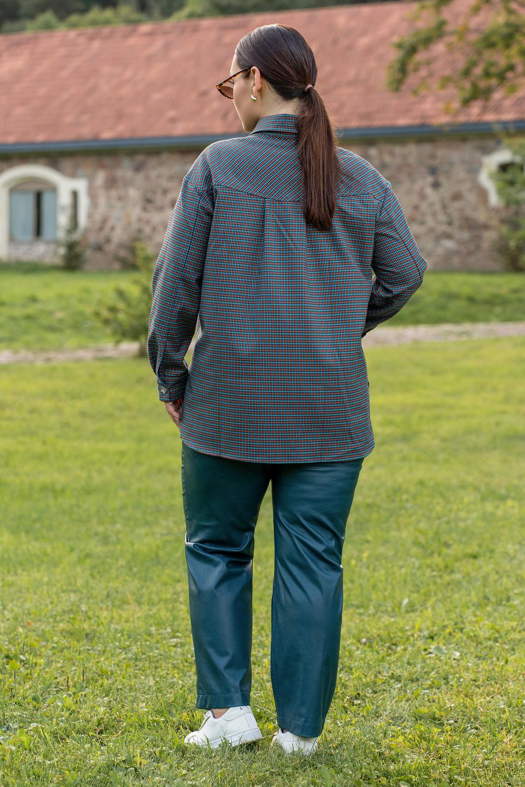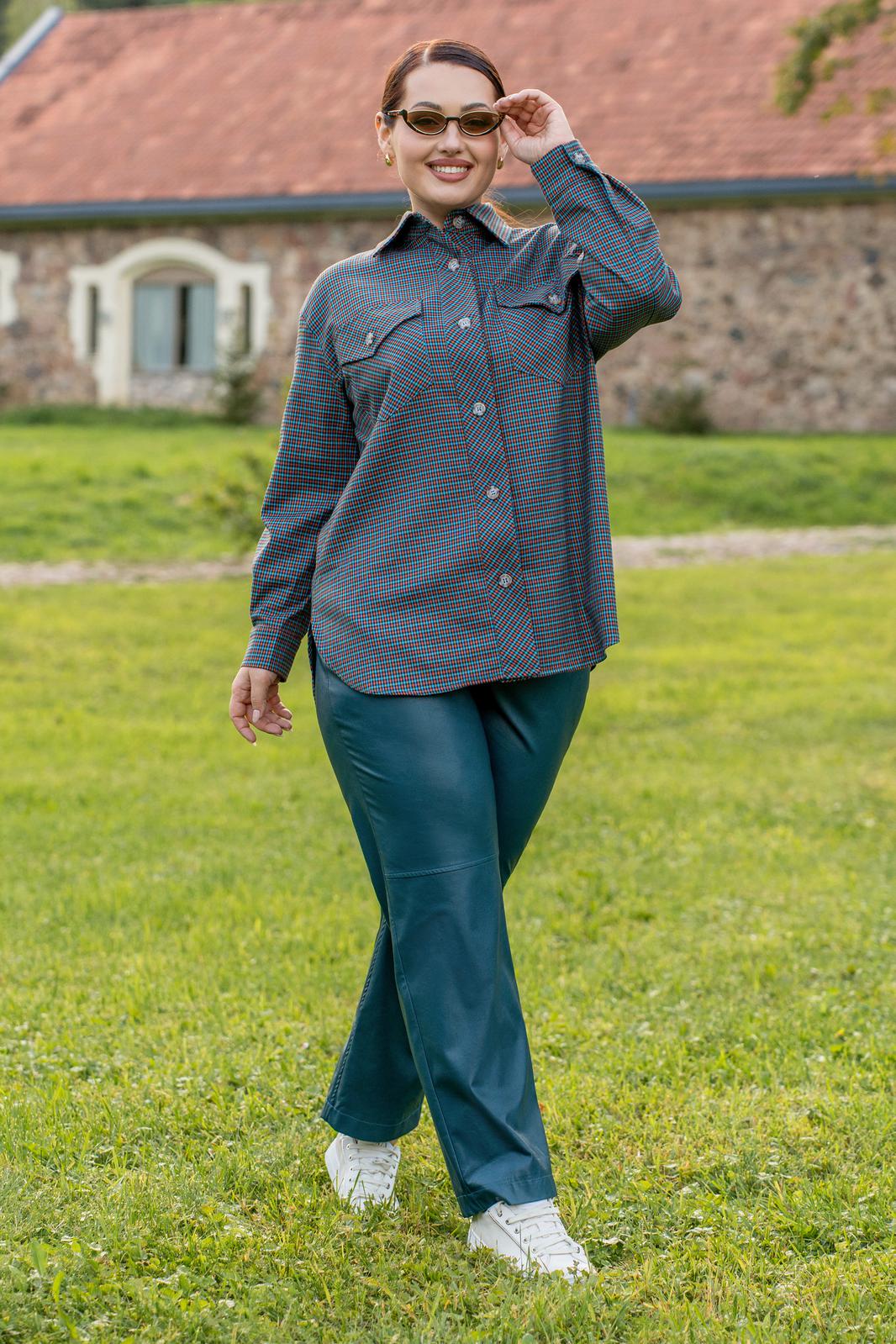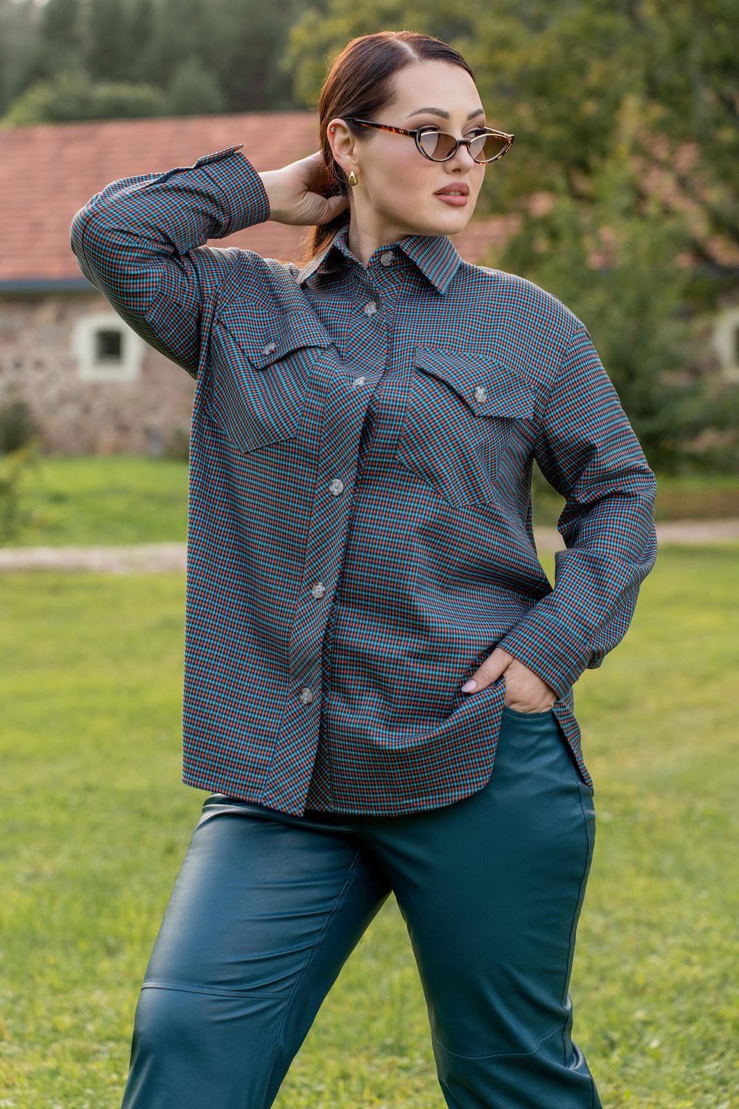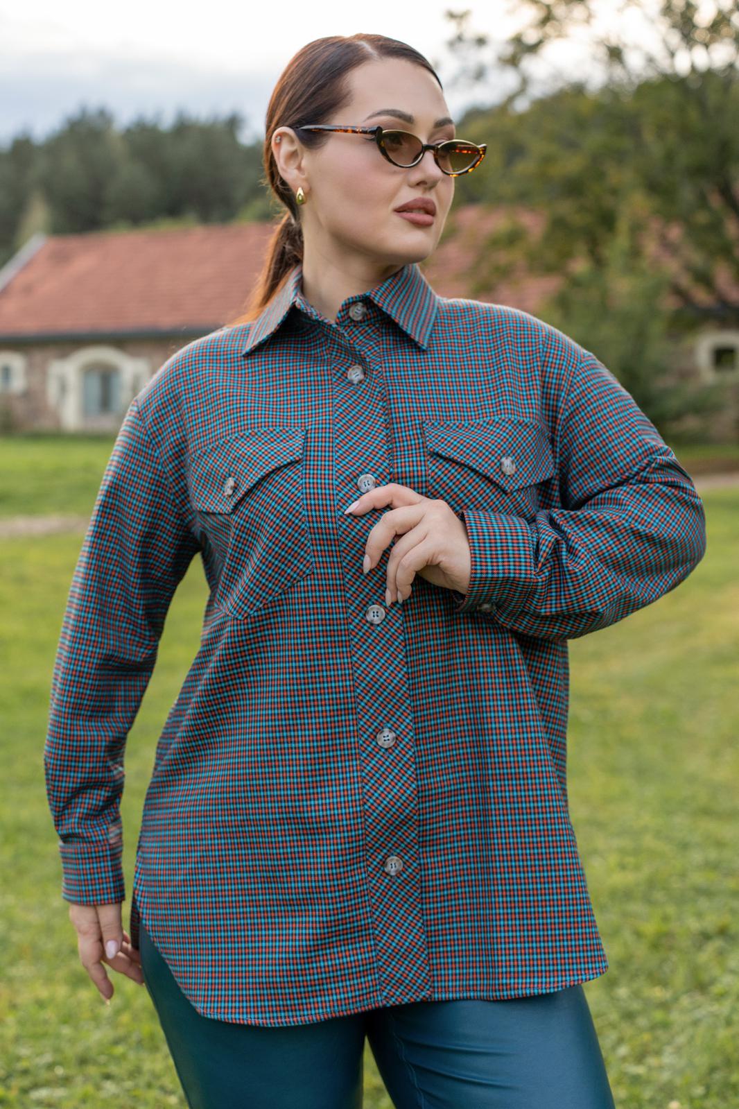 Рубашка из мягкой ткани прямого силуэта с центральной бортовой застёжкой на петли и пуговицы, воронитк стояче-отложной, полочка с нагрудыми накладными карманами застёгивающиеся на петлю и пуговицу. Спинка с отрезной фигурной кокеткой, со складкой по центру. низ фигурный. рукава втачные двухшовные с притачной манжетоЙ застёгивающейся на петли и пуговицы.