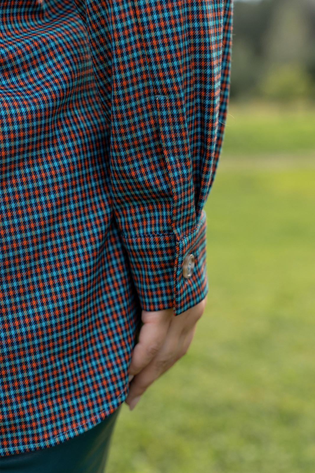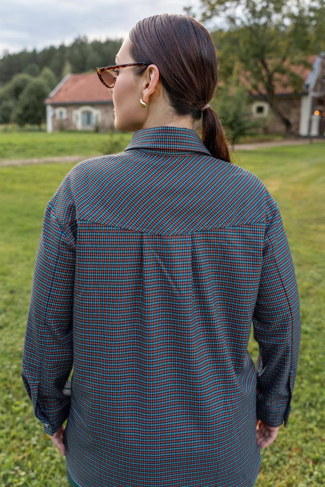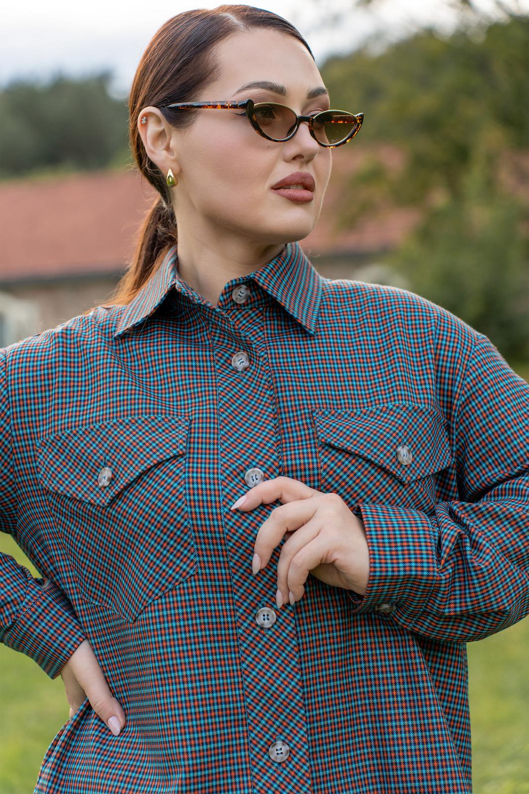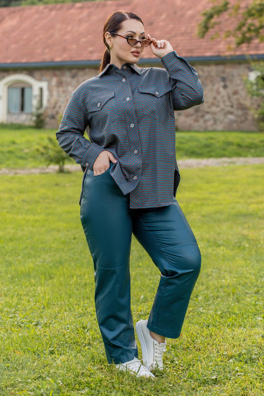 Рубашка из мягкой ткани прямого силуэта с центральной бортовой застёжкой на петли и пуговицы, воронитк стояче-отложной, полочка с нагрудыми накладными карманами застёгивающиеся на петлю и пуговицу. Спинка с отрезной фигурной кокеткой, со складкой по центру. низ фигурный. рукава втачные двухшовные с притачной манжетоЙ застёгивающейся на петли и пуговицы.