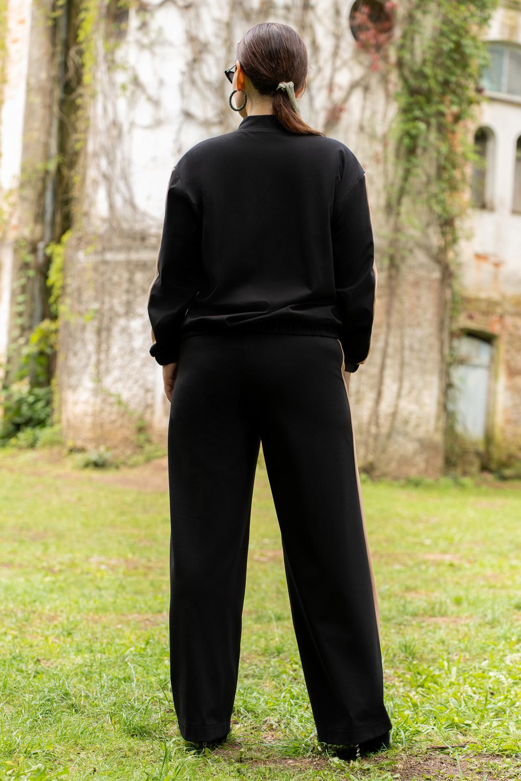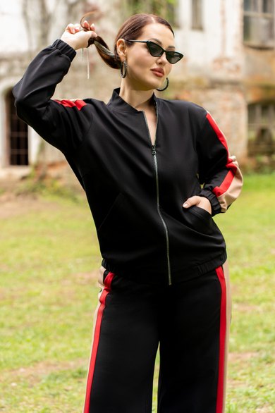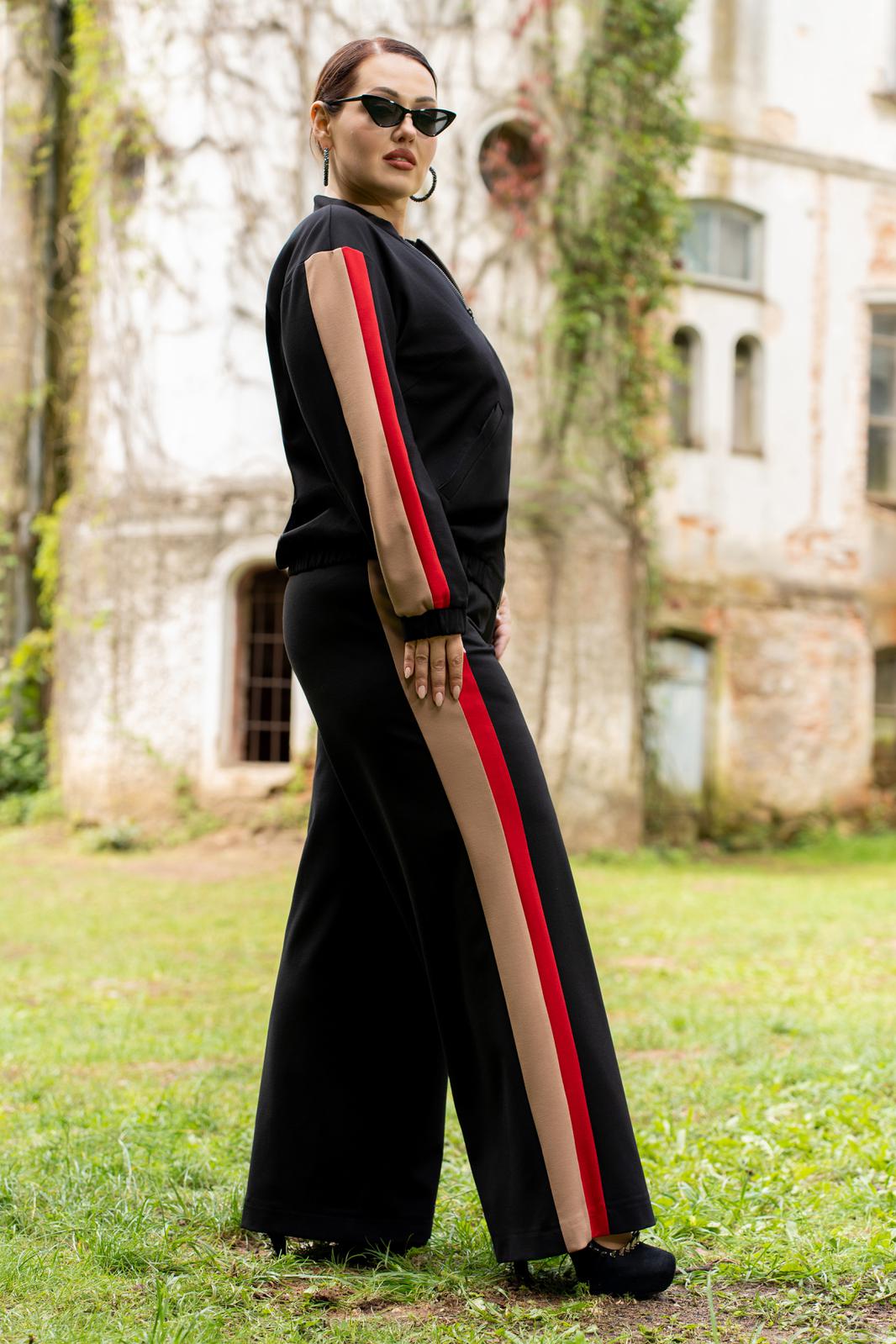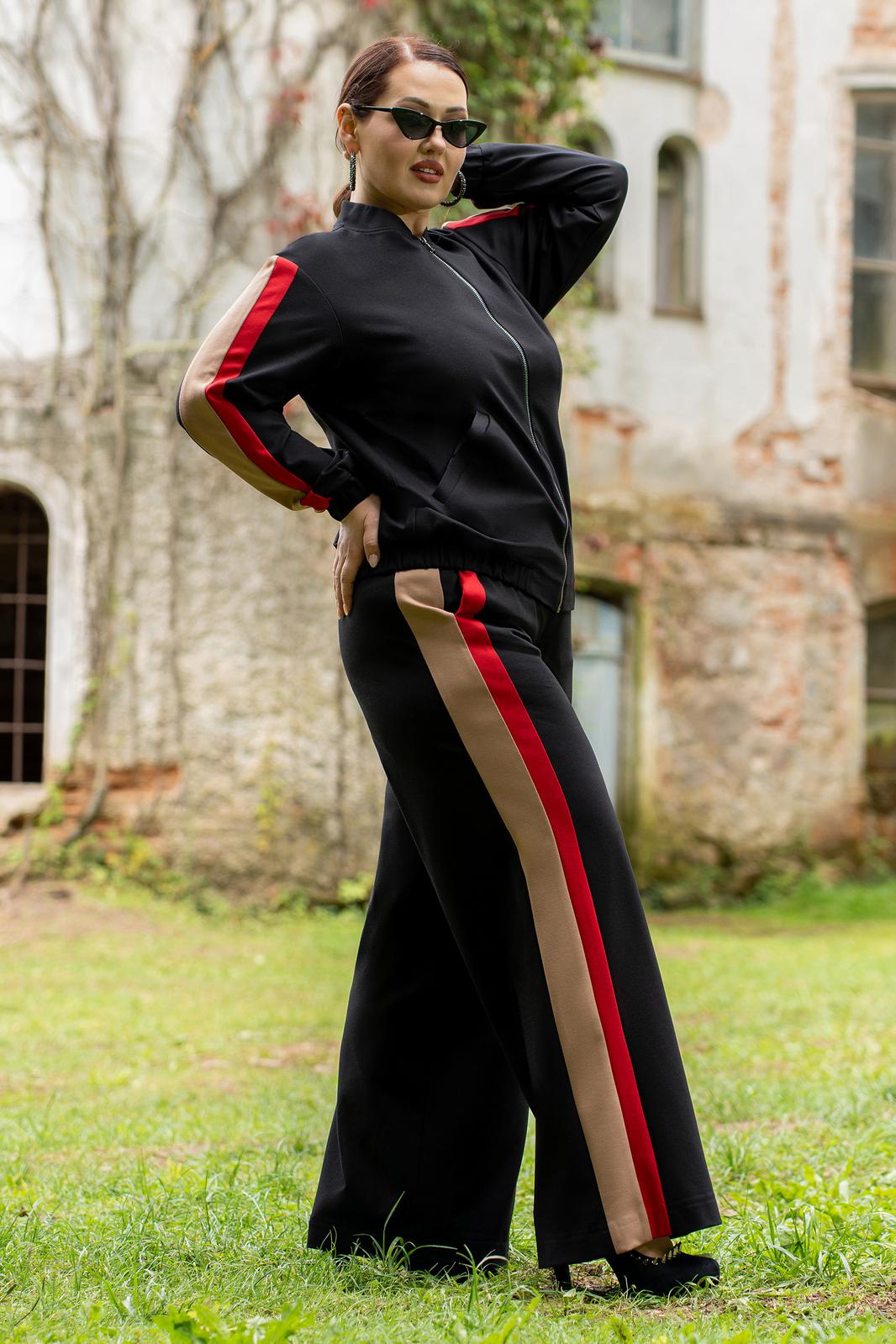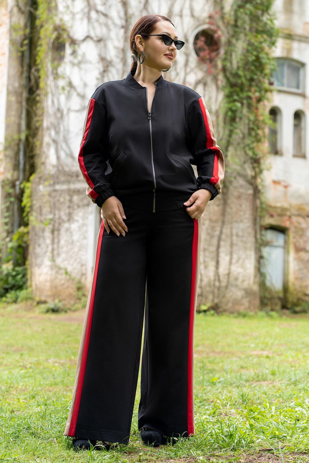 Костюм женский брючный состоящий из бомбера ,брюк. Модный соременный бомбер из премиум трикотажа, с центральной бортовой застёжкой на тесьму-молнию. Горловина круглой формы со стойкой. По низу, и по низу рукавов обработаны манжеты с эластичной резинкой, на полочках прорезные карманы с листочками и отделочными строчками. Рукава втачные со вставками по центру рукавов, по низу с притачной манжетой с эластичной резинкой. Спинка цельная. Брюки женские прямого кроя, на притачном поясе по переду и с резинкой по спинке. Передние половинки с карманами в швах. Брюки по боковым швам со вставкой из конрастной ткани. По передней вставке пояса обработа ны шлёвки и декоративная подвеска.