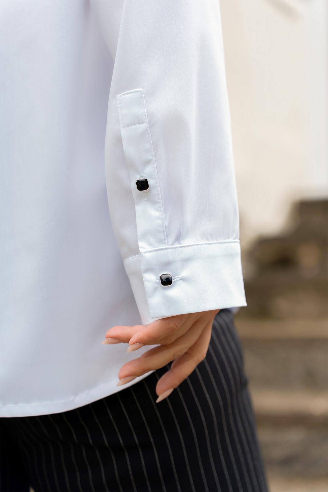Костюм классика:белая рубашка и брюки из классический костюмной полоски. Рубашка женская выполнена из хлопоковый ткани, с отложным воротником на стойке, с центральной застёжкой на петли и пуговицы. полочки с нагрудными вытачками с накладными карманами к клапанами, застёгивающиеся на петли и пуговицы, рукава рубашечного кроя, с притачными манжетами, застёгивающиеся на петли и пуговицы. спинка цельная, по бокам обработаны разрезы. галстук из экокожи с декоративными бантиками,регулируются с помощью застёжки. По боковым швам обработаны разрезы и шлёвки под пояс.Брюки прямого лаконичного силуэта, из классическое костюмной полоски, по переду пояс вставка со шлёвками, по спинке пояс с эластичной резинкой. Брюки с боковыми наклонными карманами. Брюки со стрелками.