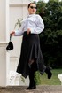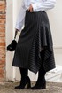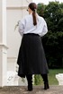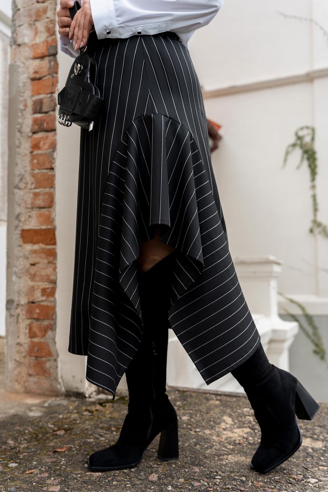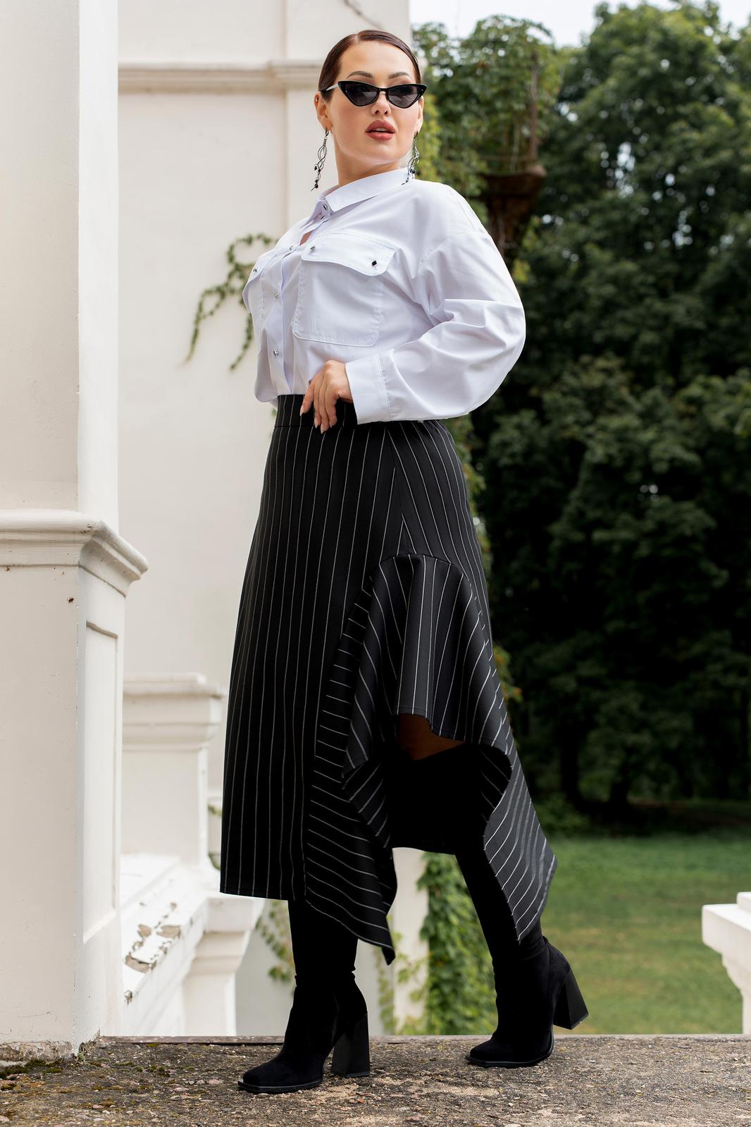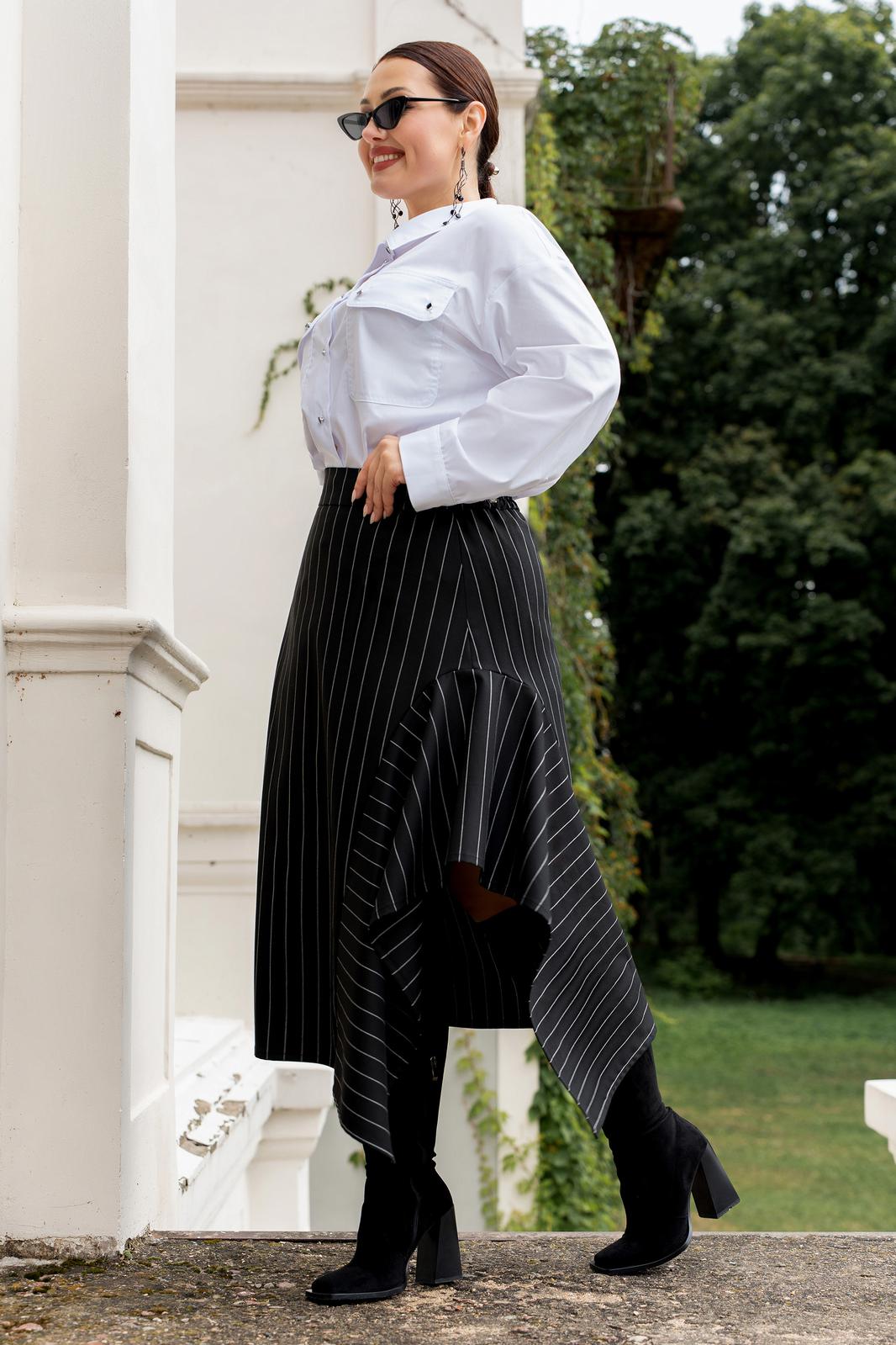Комплект юбка, рубашка и галстук. Рубашка женская выполнена из хлопоковый ткани, с отложным воротником на стойке, с центральной застёжкой на петли и пуговицы. полочки с нагрудными вытачками с накладными карманами к клапанами, застёгивающиеся на петли и пуговицы, рукава рубашечного кроя, с притачными манжетами, застёгивающиеся на петли и пуговицы. спинка цельная, по бокам обработаны разрезы. Юбка женская асиметричного кроя, из классической костюмной полоски, по переду пояс вставка, по спинке пояс с эластичной резинкой.