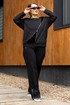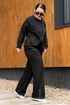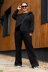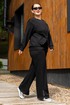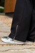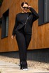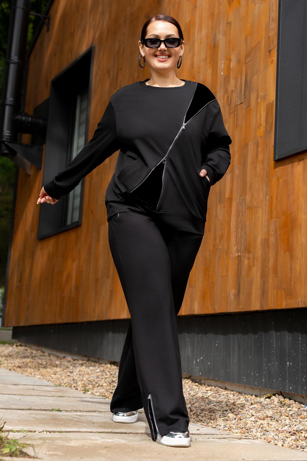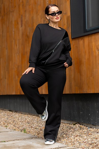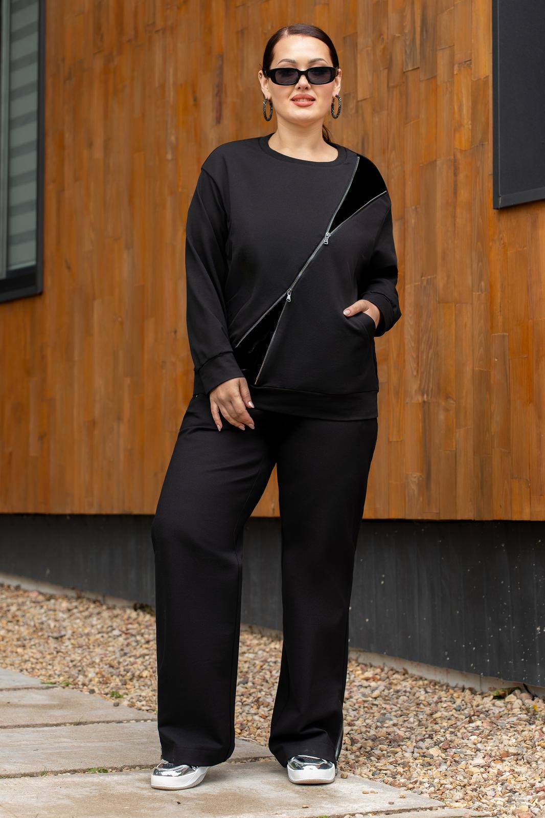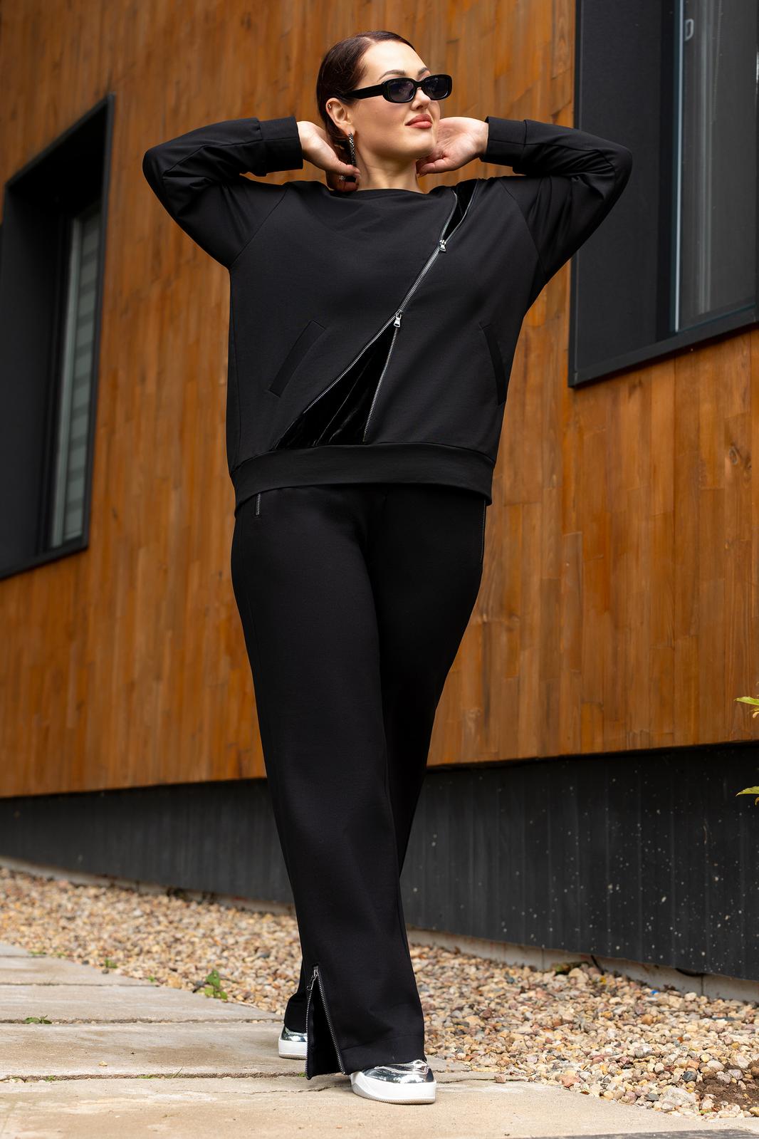 Костюм женский джемпер и брюки из трикотажа. Джемпер прямого кроя с вставками из отделочной ткани и молнией, полочка с прорезными карманами.Джемпер с притачными рукавами и манжетами. Брюки женские прямого силуэта, пояс на резинке.Боковые карманы на молниях.По низу брюк обработаны разрезы на молниях.