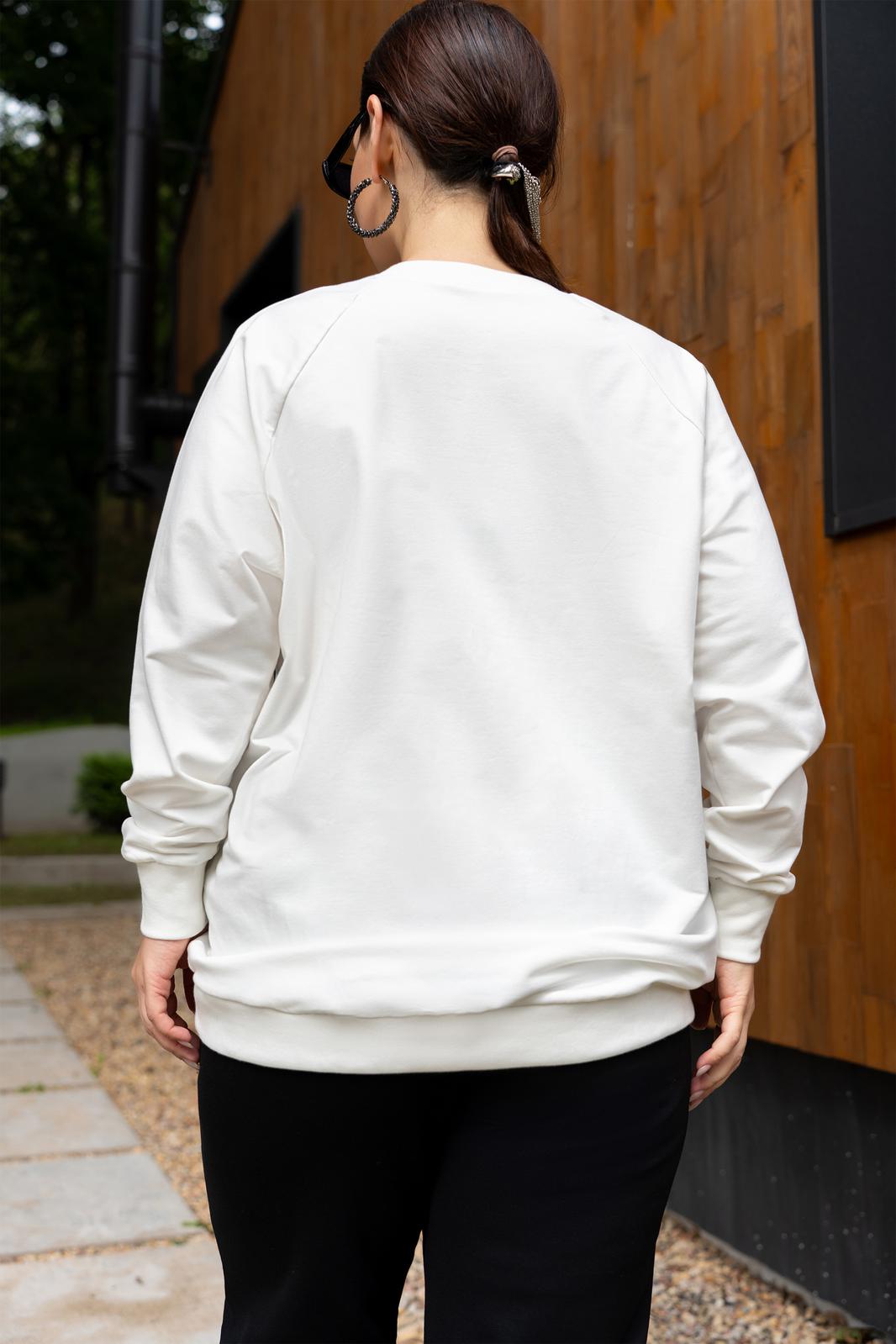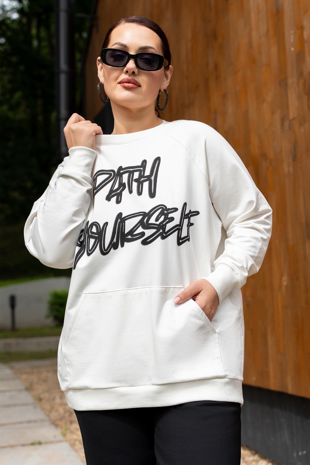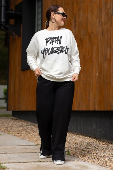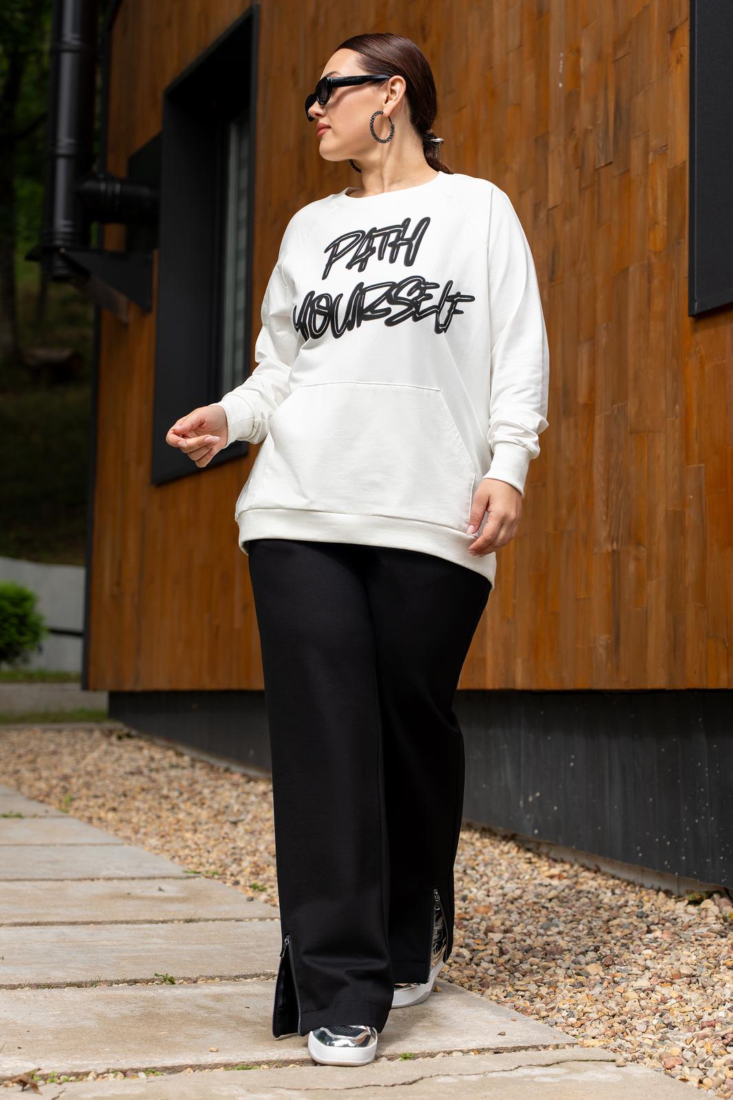 Костюм женский джемпер и брюки из трикотажа. Брюки женские прямого силуэта, пояс на резинке.Боковые карманы на молниях.По низу брюк обработаны разрезы на молниях.Джемпер прямого кроя с дизайнерской печатью , полочка с накладным карманом.Джемпер с притачными рукавами и манжетами.