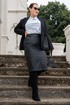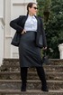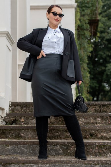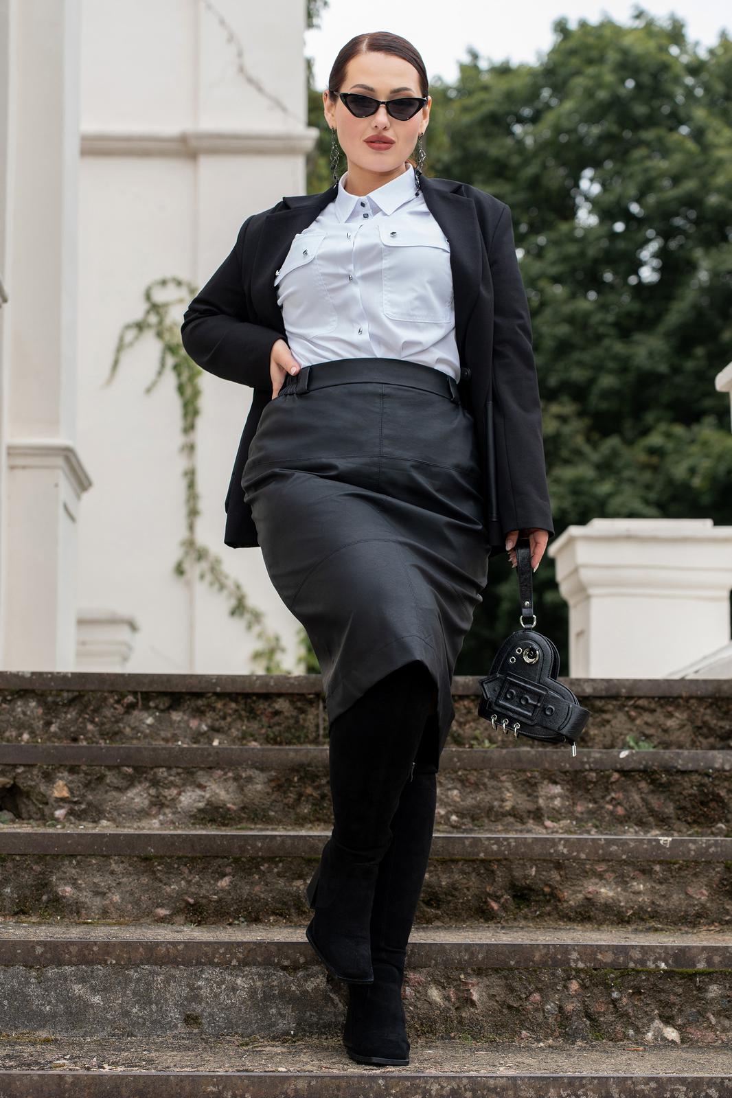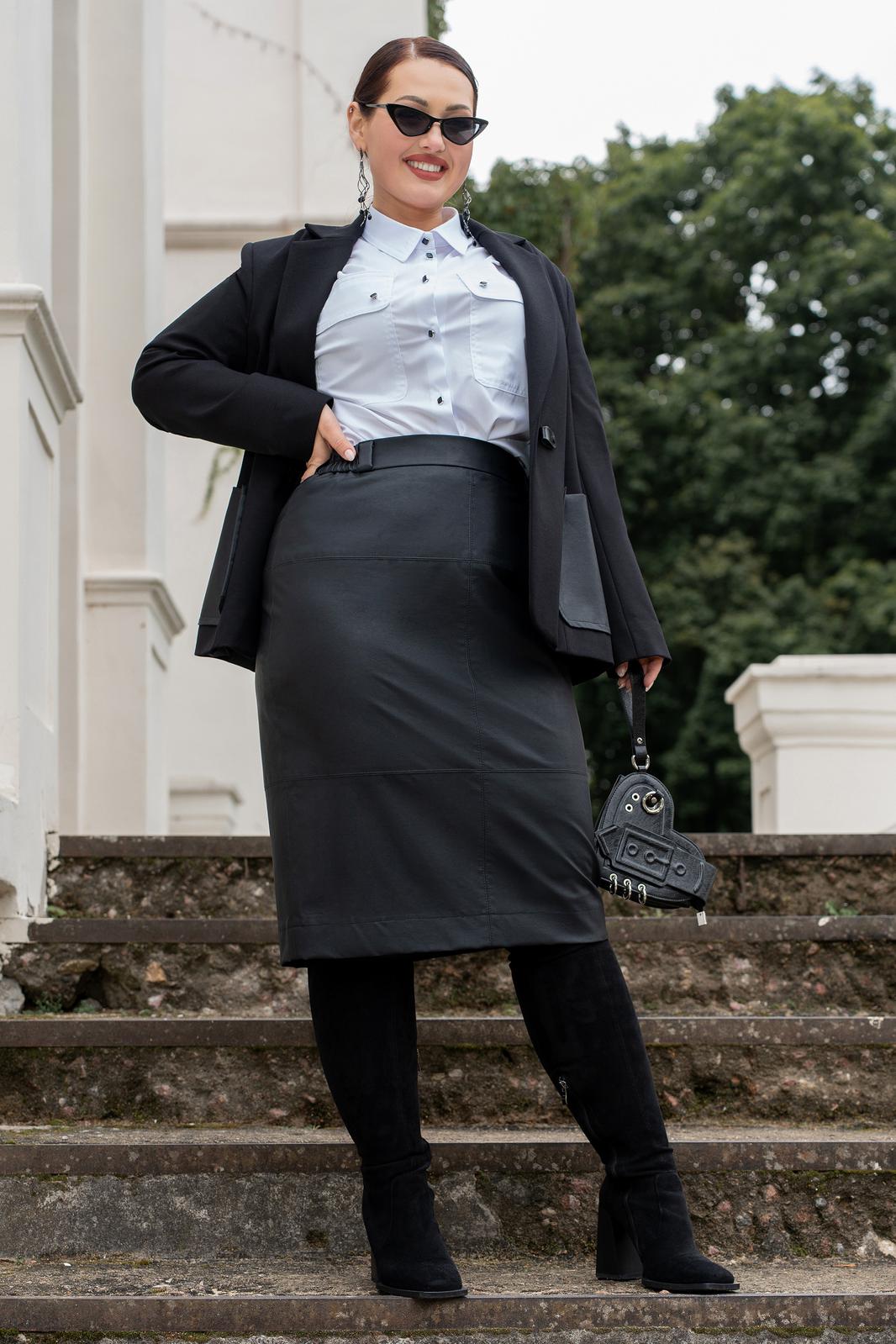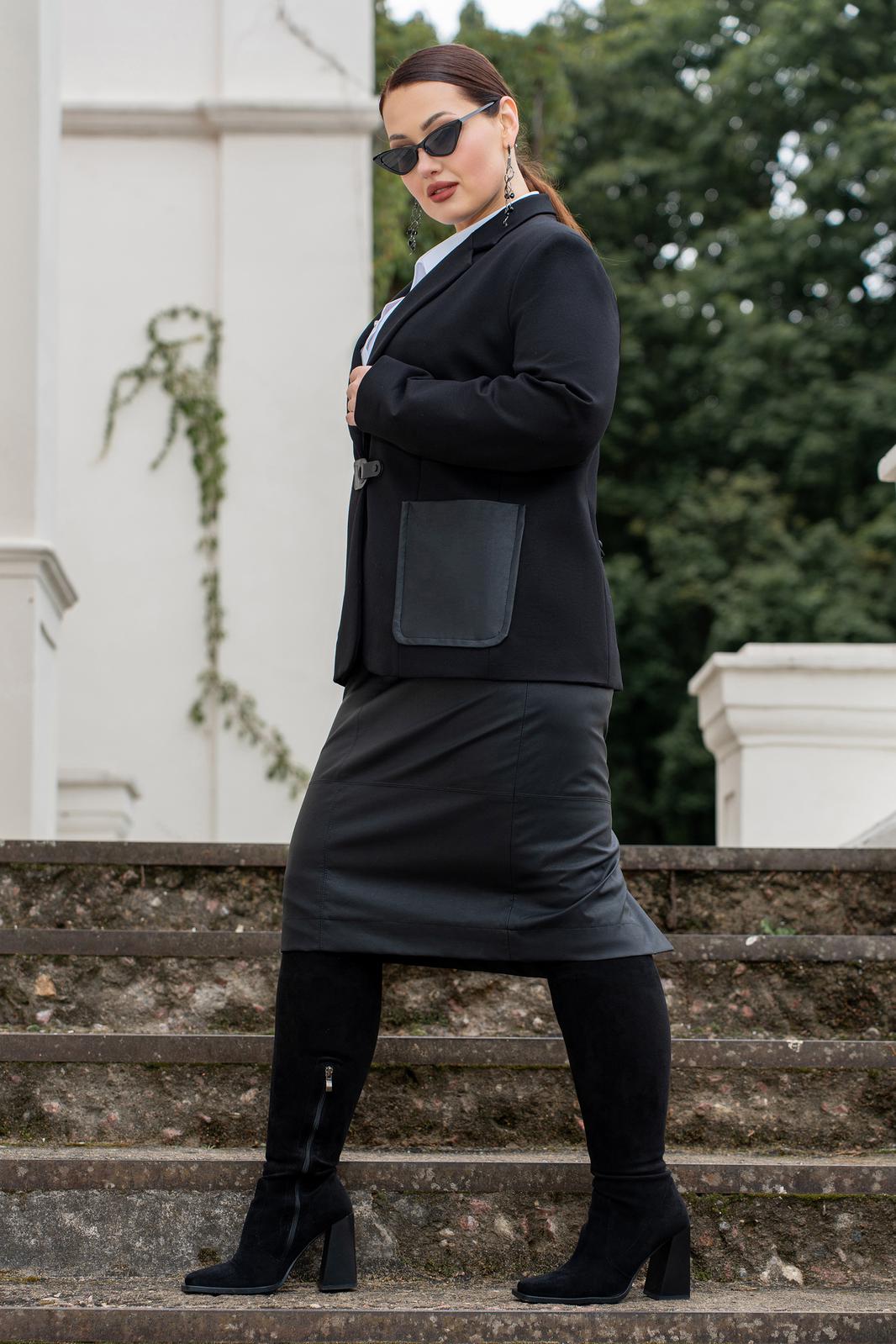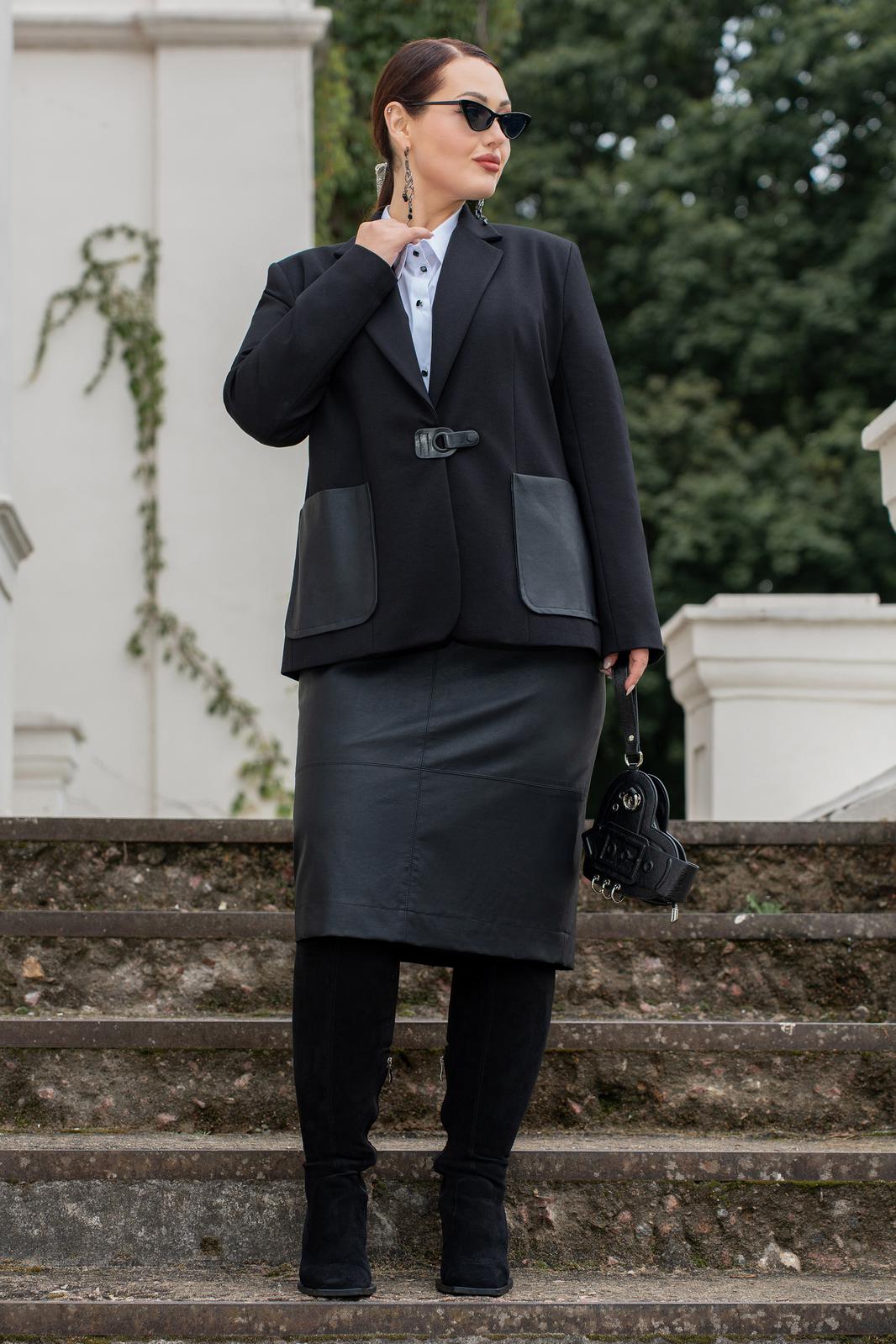 Костюм женский жакет на подкладке и юбка из экокожи на подкладке.Жакет женский прямого силуэта с V- вырезом горловины, с воротником пиджачного типа, на подкладке. Полочка с накладными карманами, с центральной бортовой застёжкой на клеванту. Спинка асиметричная с декоративным карманом в рамку. Жакет с плечевыми накладками. Жакет с втачными двухшовными рукавами. Жакет на подкладке. Юбка прямого силуэта, на поясе (по спике в поясе резинка) застёгивающимся на петлю и пуговицу, на подкладке. Юбка из качественной эко кожи, с горизонтальными подрезами по переду и по спинке, с отделочными строчками по подрезам, по спинке в среднем шве обработана потайная молния и по низу отлетная шлица.