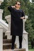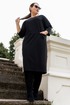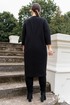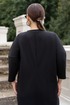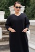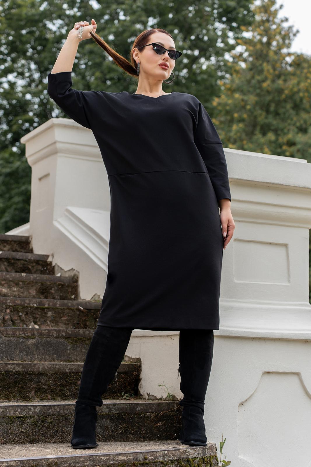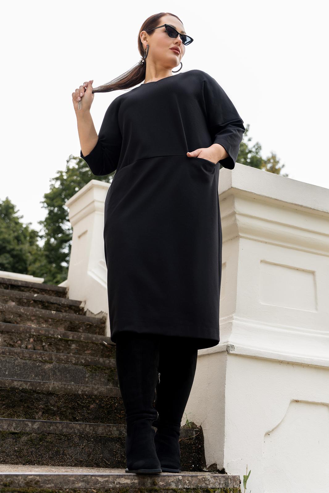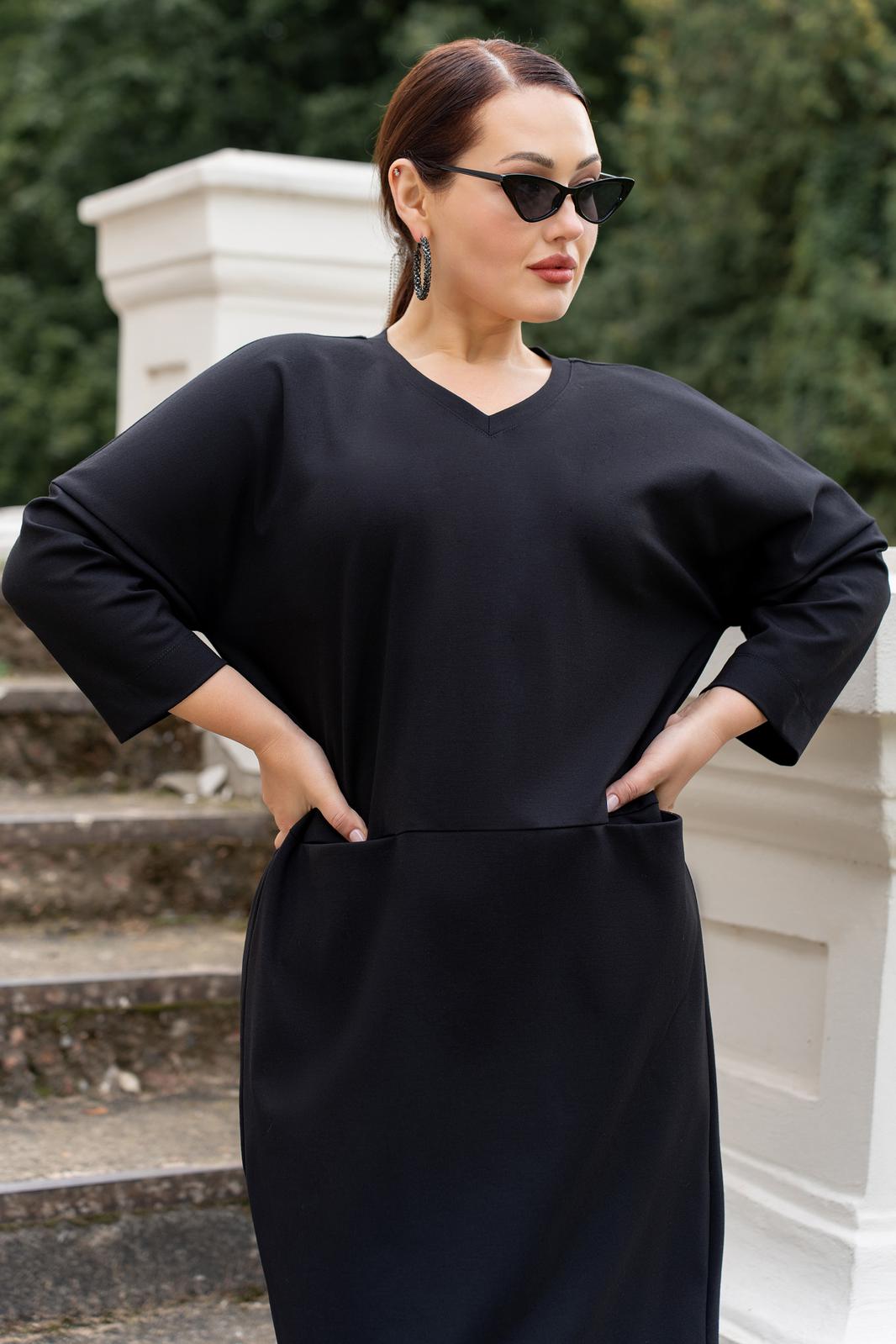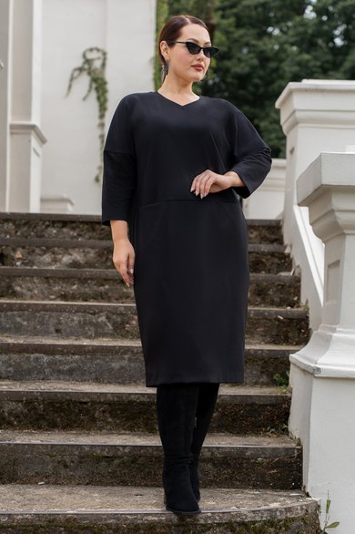Платье выполнено из премиуального трикотажа, свободного силуэта,с V-образным вырезом горловины, со спущеным плечом, рукава 7/8. по полочке горизонтальный подрез в котром обработаны карманы. Спинка со средним швом. Горловина обработана бейкой.