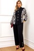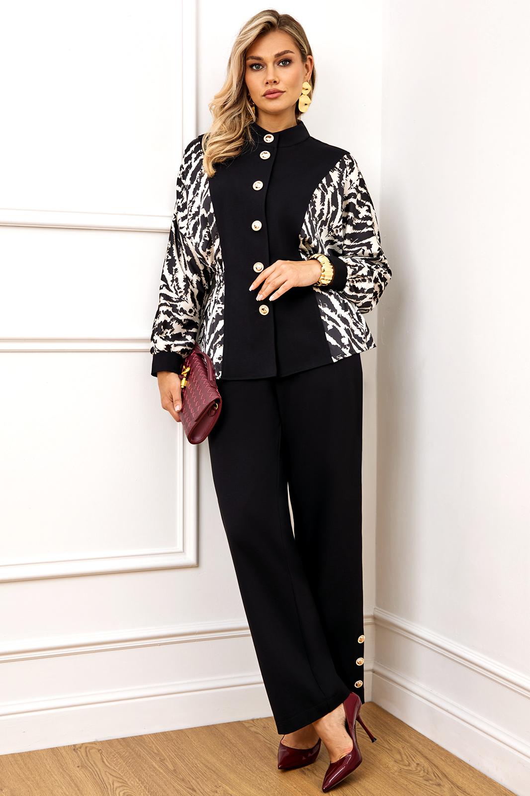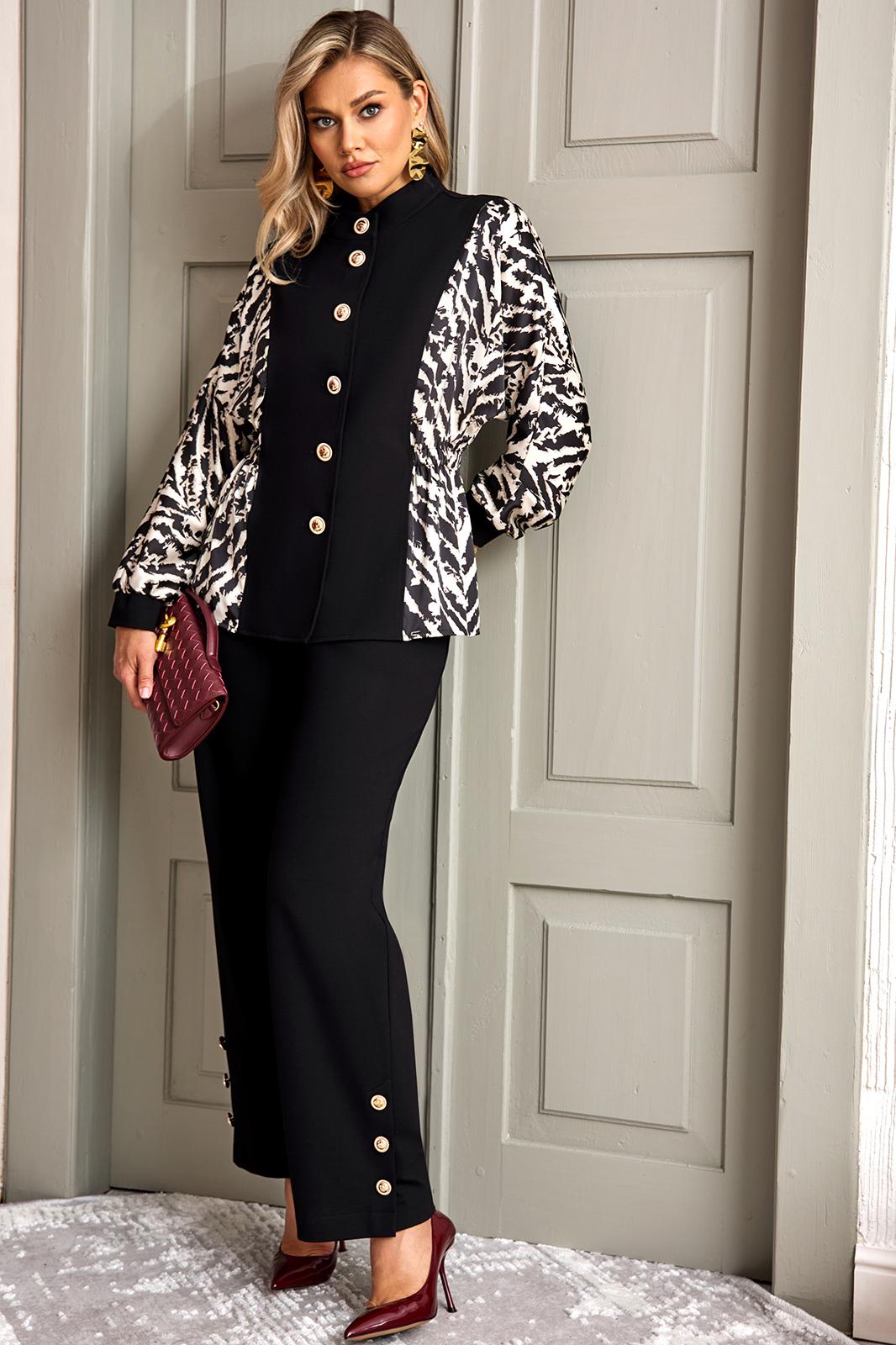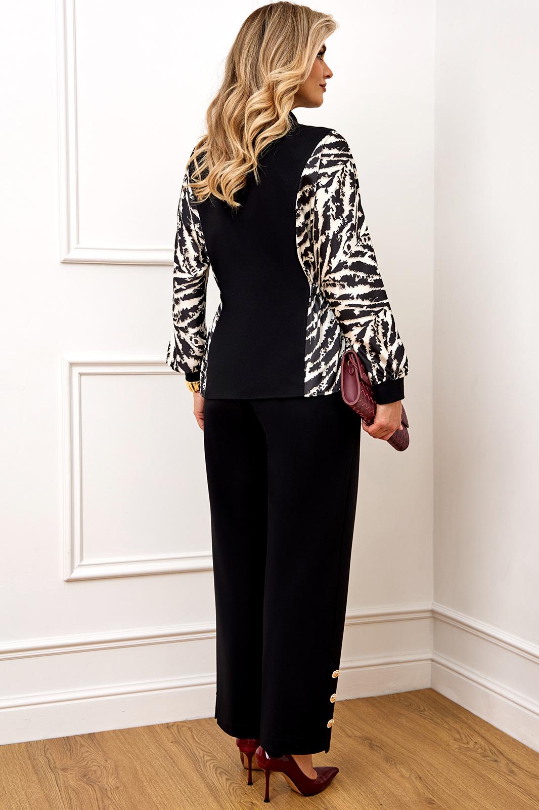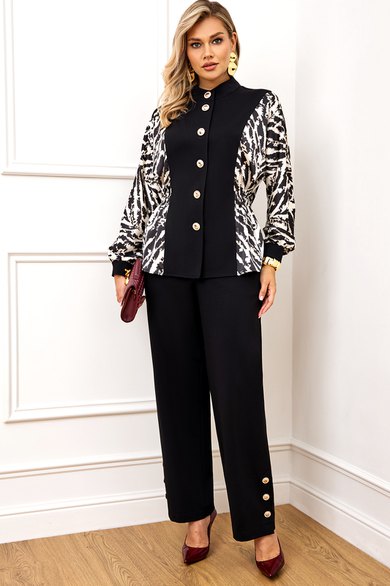 Стильный комплект, состоит из блузы и брюк. Блуза полуприлегающего силуэта, выполнена из высококачественной трикотажной ткани, рукав и бочек выполнены из атласной ткани с модным дизайнерским принтом. Блуза с горловиной стойкой и застёжкой по переду на пуговицы. Рукав полной длины, выполнен в стиле летучая мышь, с манжетой из однотонного трикотажа. На талии по бокам блуза с резинкой. Все элементы блузы создают неповторимый образ, модель невероятно стройнит. Брюки выполнены из высококачественного трикотажа, на поясе, по спинке на резинке, по переду с застежкой на пуговицу и молнию. В боковых швах брюк функциональные карманы. По бокам брюк снизу шлица, декорированная пришивными пуговицами.