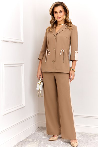 Стильный комплект, состоит из жакета и брюк. Жакет прямого силуэта, выполнен из высококачественной ткани Диагональ с добавлением вискозы. Жакет без подкладки, по переду с застежкой на 3 пуговицы и завязкой кулисой, что дает возможность придать жакету приталенность или наоборот свободность. Рукав жакета втачной, длиной 3/4, с манжетой и патой с застежкой на две пуговицы. По боккам жакет со вставкой из осной ткани светлого цвета и разрезами, что придает модели особый стиль и шарм. Брюки прямые, выполнены из высококачественной ткани Диагональ с добавлением вискозы, на поясе, по переду с застежкой на пуговицу и молнию, по спинке с резинкой. По бокам брюки со вставкой из осной ткани светлого цвета (имитация лампаса), что придает модели особый стиль и шарм. В боковых швах функциональные карманы.
