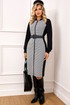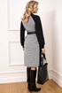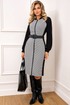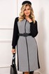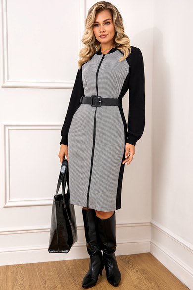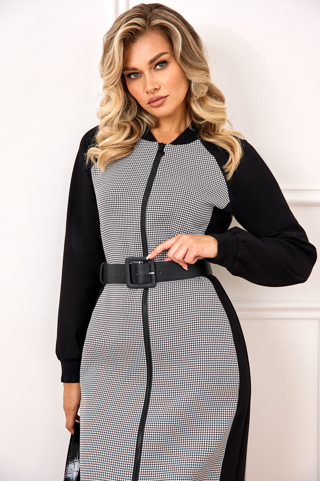 Стильное женское платье, выполнено из двух видов ткани — костюмно-плательная ткань, с добавлением вискозы и модным принтом черно-белая гусиная лапка и отделкой из черного трикотажа премиум качества. За счет комбинирования двух видов ткани, платье невероятно стройнит и вытягивает силуэт на фигуре. Платье по переду с застежкой на молнию (длина молнии 100 см). Горловина платья и манжета рукава с отделкой из трикотажного довяза, что придает модели особый шарм. Рукав платья полной длины. Платье без подкладки. В комплекте идет съемный кожаный пояс, который прекрасно дополняет полный образ платья.