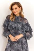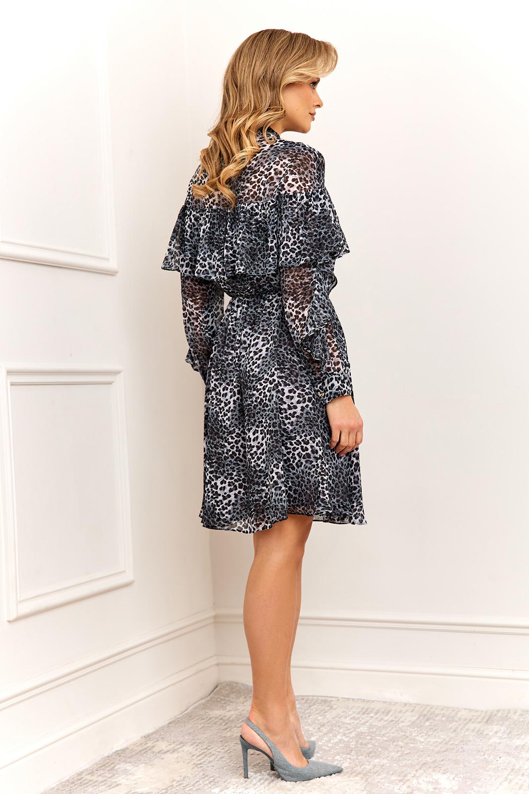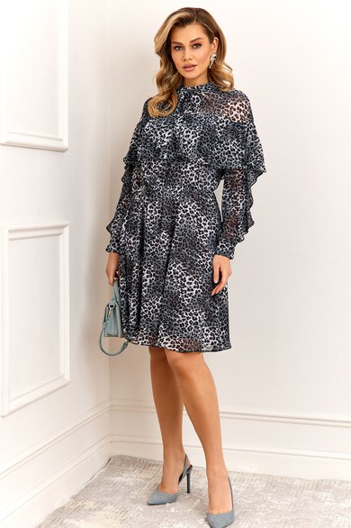 Эффектное и стильное платье, выполнено из мягкого креп-шифона с модным принтом. Платье полностью на трикотажной подкладке. Горловина стойка, которую можно завязать в бант, для придания модели особой нарядности. Платье А-силуэта, по талии на резинке. Спереди и по спинке с рюшей с небольшой сборкой, переходящей в рукав. Рукав полной длины, с манжетой и застежкой на металлическую пуговицу. Модель удобная и практичная, вы будете в нем выглядеть неотразимо и роскошно.