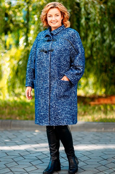 По переду застегивается на декоративные застежки. Рукава и перед украшены черным кантом. Пальто свободного кроя, рукав полу реглан. Длина пальто 96 см, длина рукава 63 см.