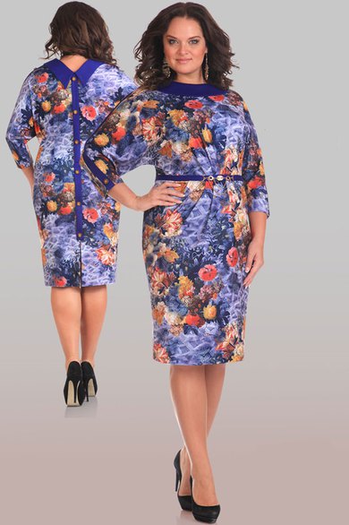 Платье женское полуприлегающего силуэта, с драпировкой по талии.Талия подчеркнута тонким поясом с декоративной отделкой. Спинка выполнена в форме V-образного выреза и украшена втачной планкой с пуговицами. Рукав цельнокроеный, трехчетвертной, летучая мышь”. Длина по спинке от выреза - 94см