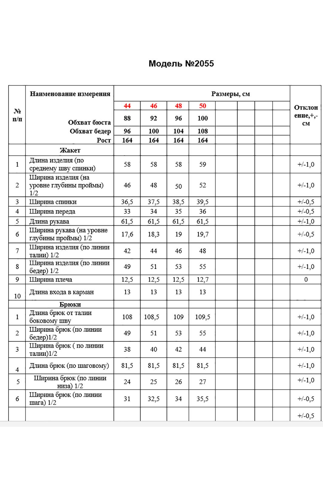 - Тип ткани: Жакет плательно-костюмного ассортимента «Фиона» 95%П/Э, 5%спандекс. Брюки плательно-костюмного ассортимента «Зара» 95%П/Э, 5%эластан
