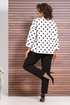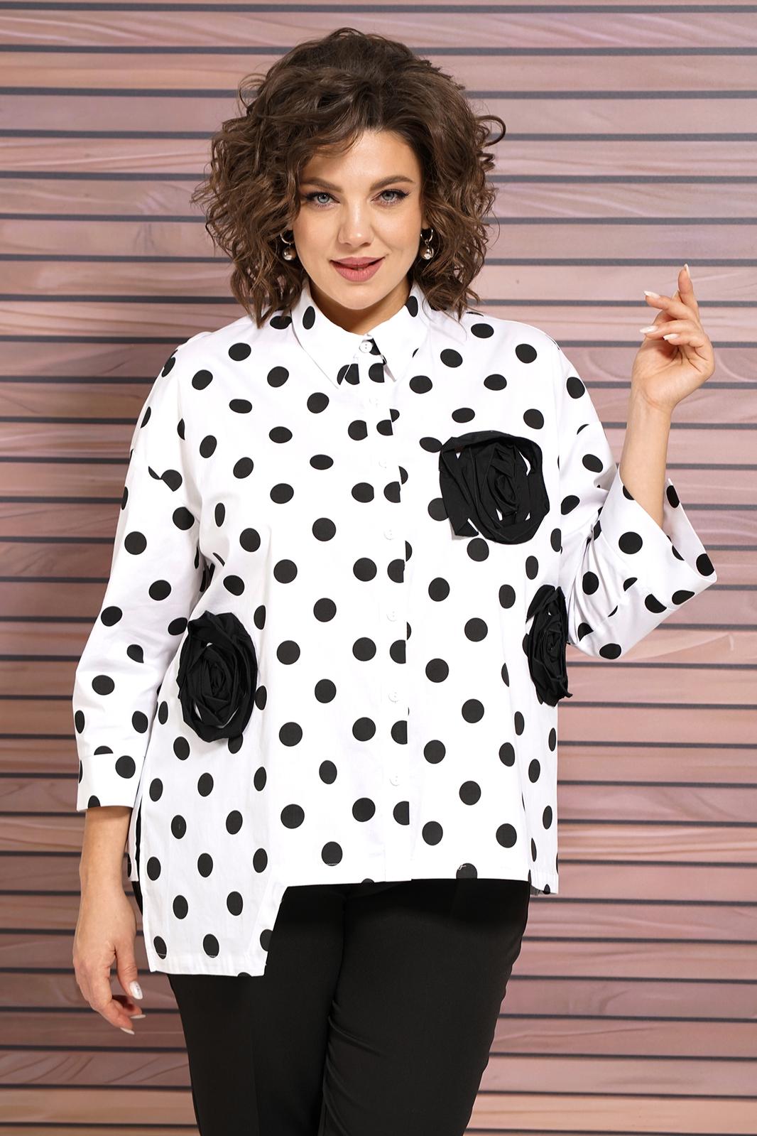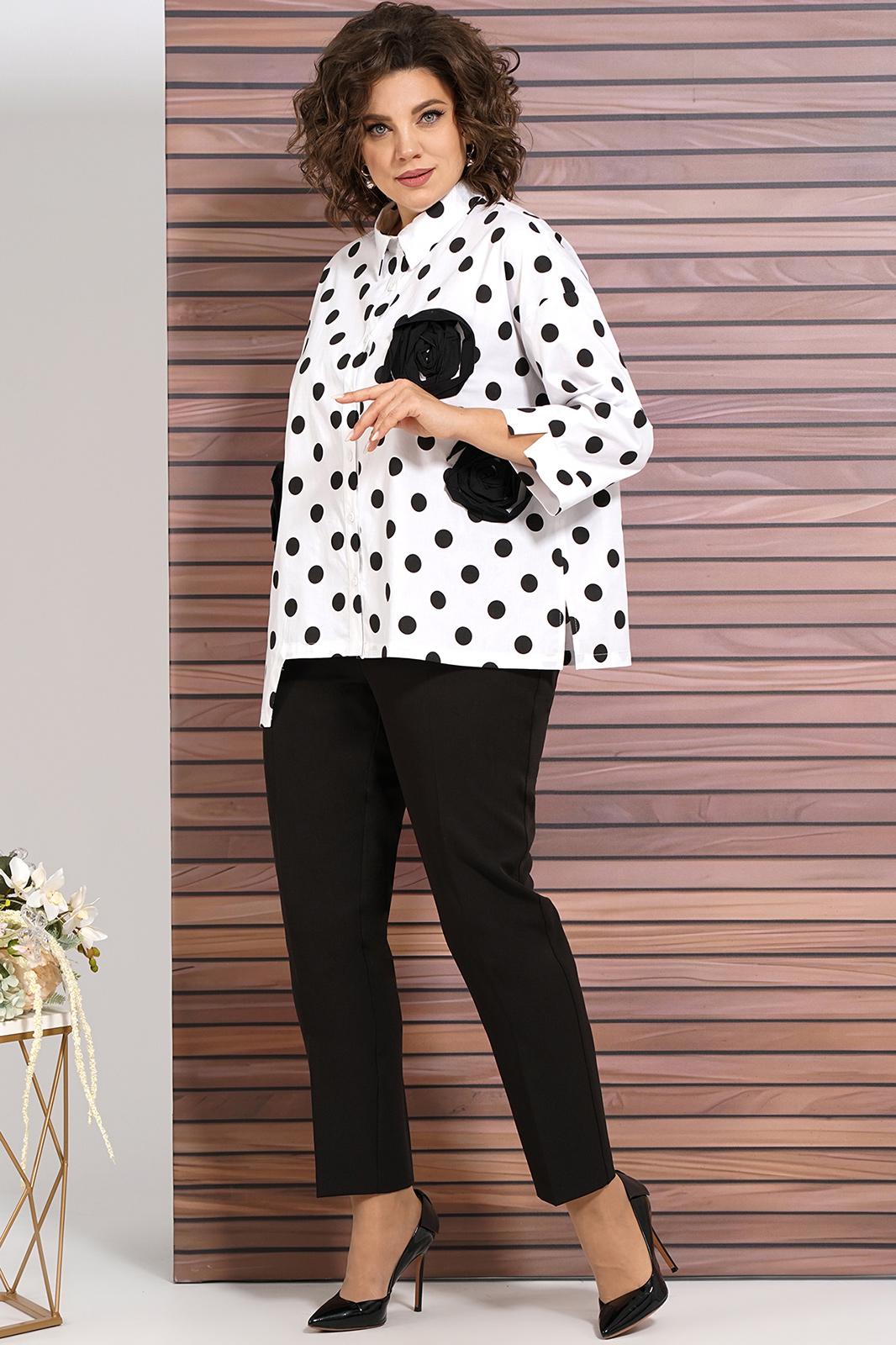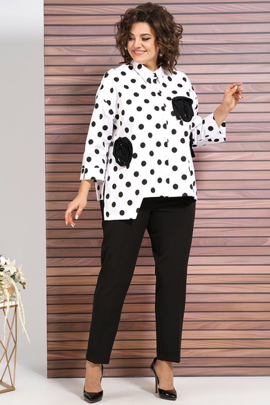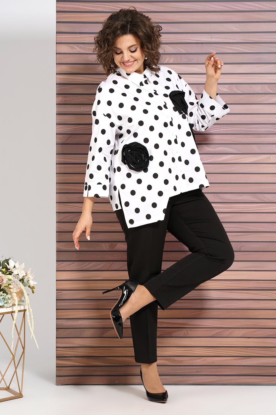 Блузка прямого, свободного силуэта, с центральной застёжкой по притачной планке на петли, пуговицы, со спущенной линией плеча, низ переда фигурной формы, по боковым разрезы. Декорирована по переду имитация настроченных цветов. Рукава втачные, одношовные, длиной ¾, понизу с притачными манжетами с разрезом. Воротник стояще-отложной на отрезной стойке.