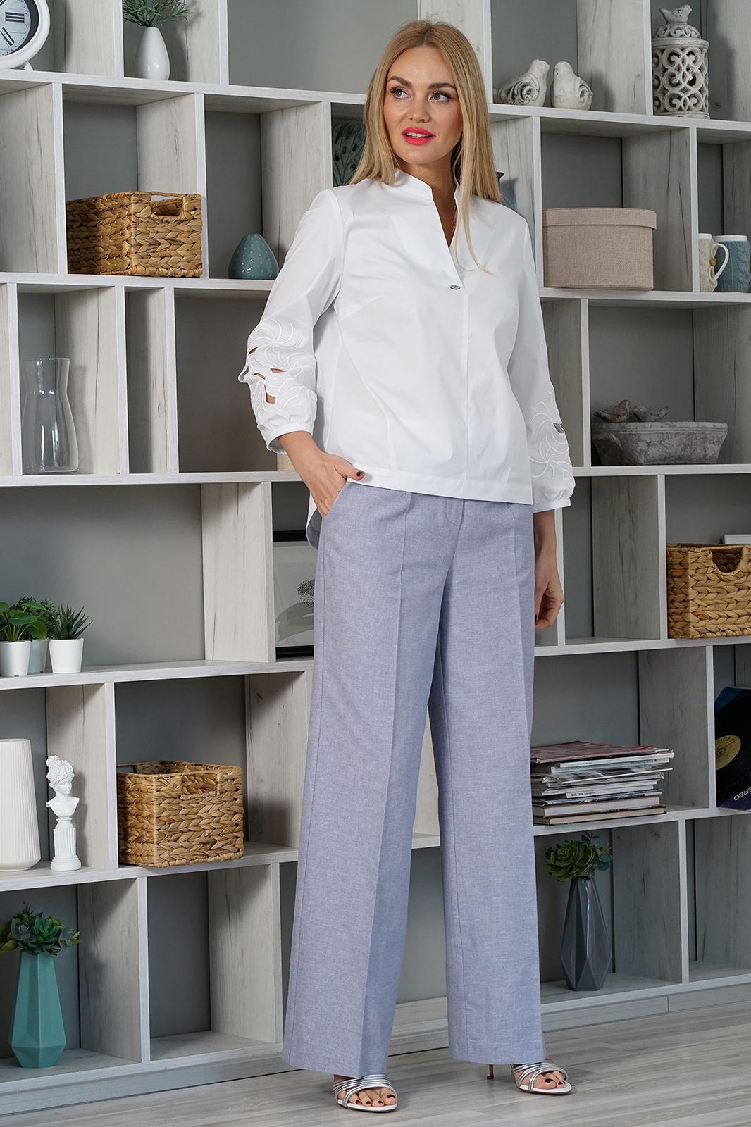 Воротник стойка. Брюки женские свободные, прямого силуэта, со сгибом, с притачным поясом (выполненный из отделочной ткани) по центру с отделочным кантом. Застёжка на тесьму-молнию типа «гульфик» и петлю и пуговицу по поясу.