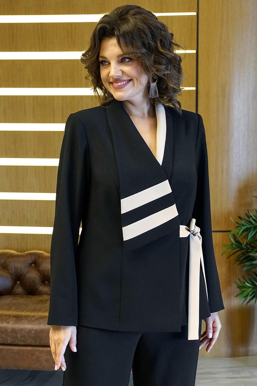 Жакет полуприлегающего силуэта, частично на подкладке (перед), с двух-бортной застёжкой с завязывающимся поясом (выполнении из отделочной ткани) и с внутренней застёжкой на петлю и пуговицу.