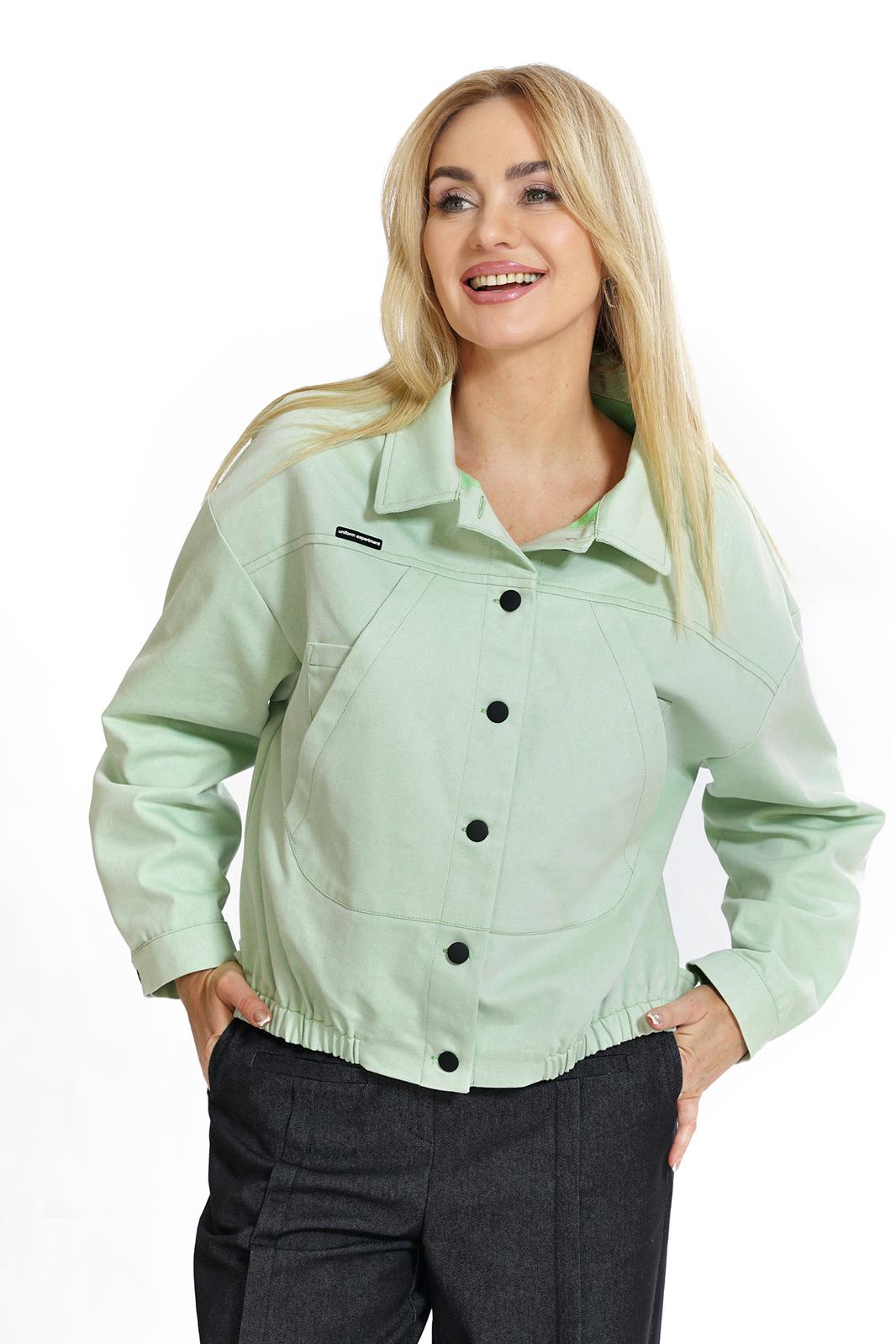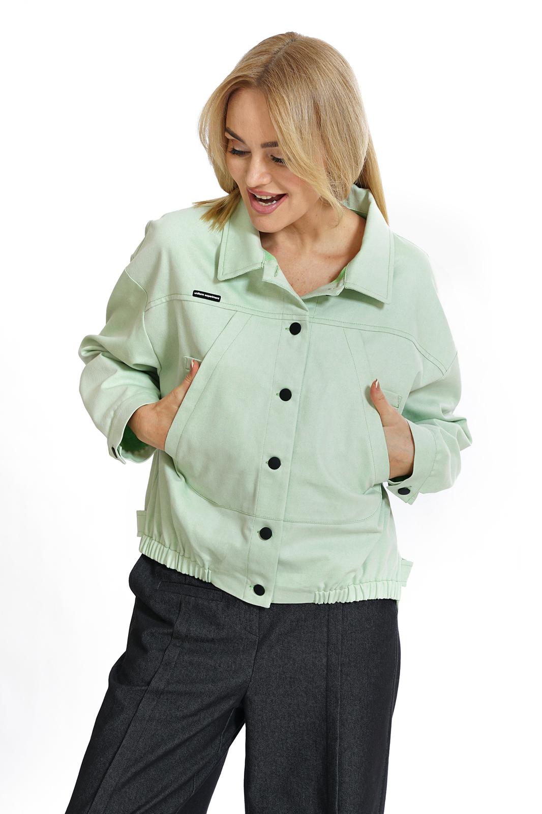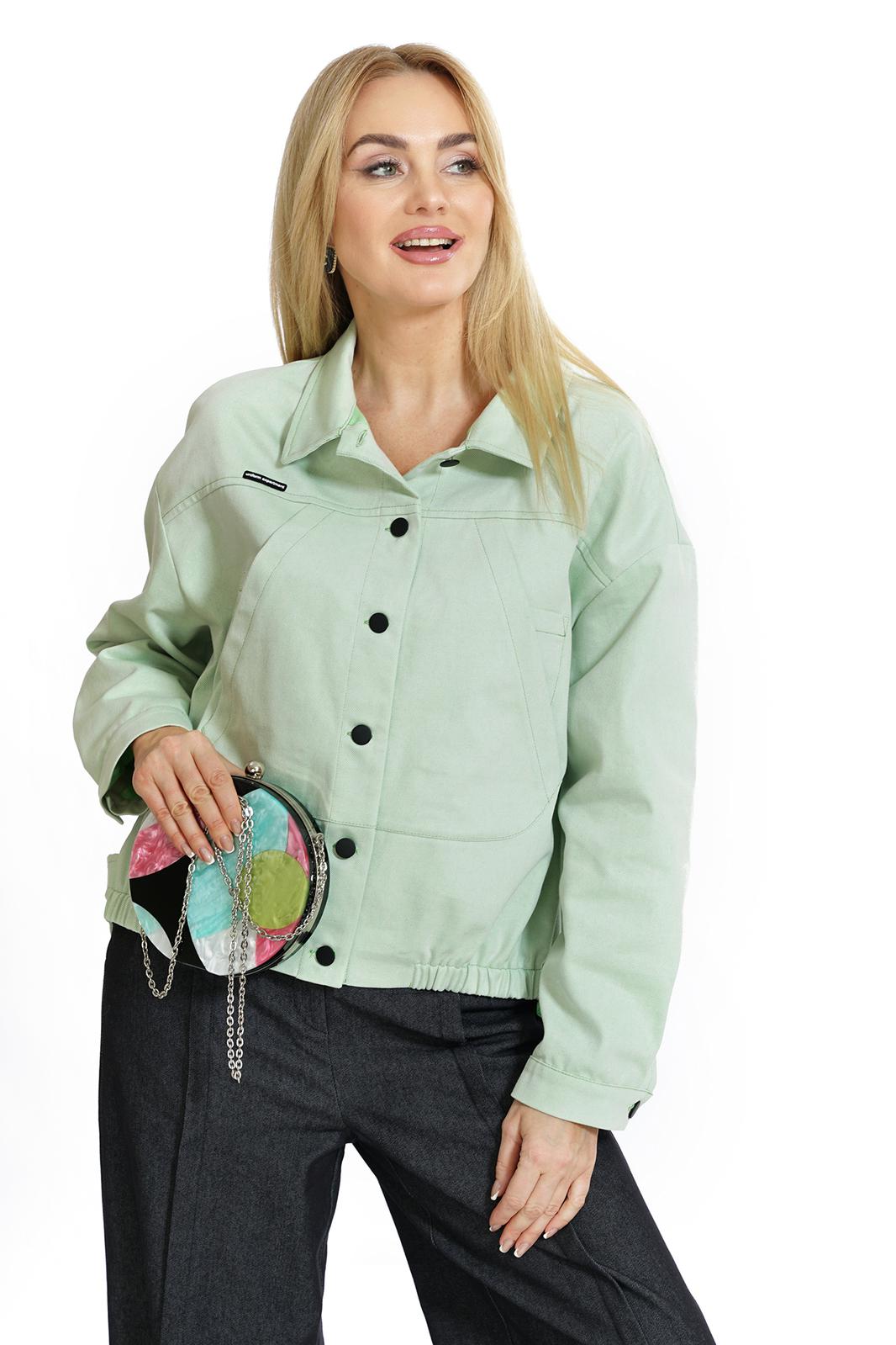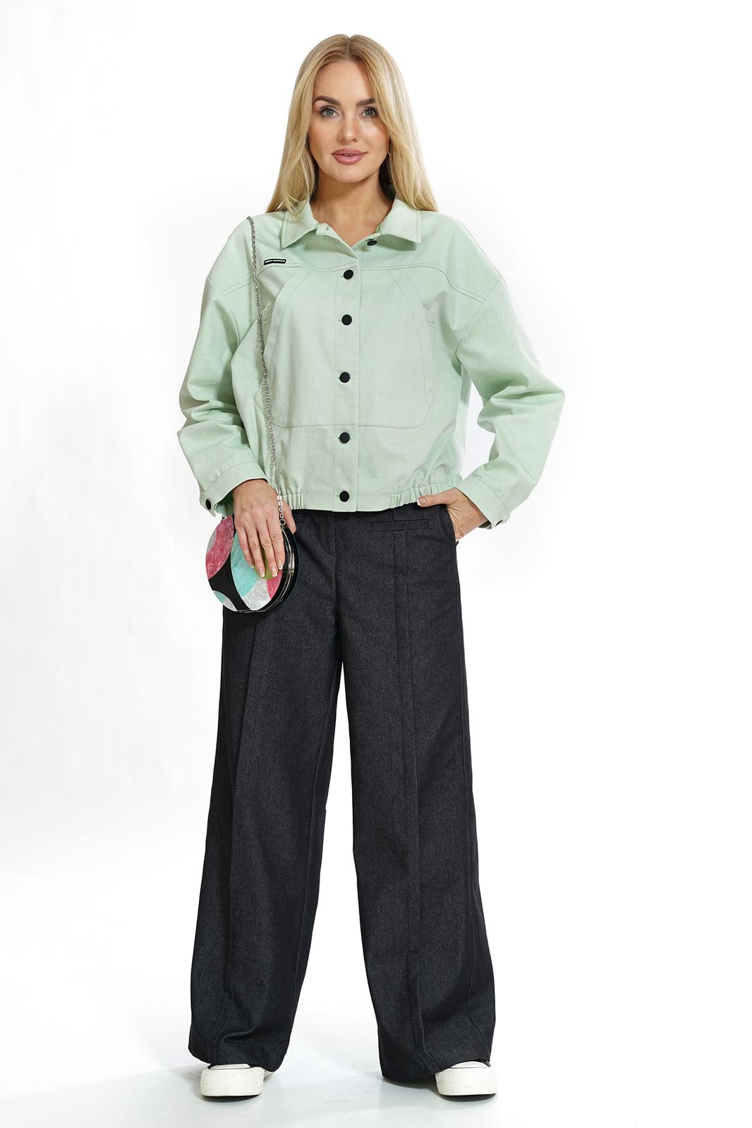 Жакет свободного прямого силуэта, со спущенной линией плеча, с разноуровневым низом, по низу переда резинке, с застёжкой по переду и спинке на пробивные петли и пуговицы, понизу боковых швов спинки паты, пристегивающиеся на пробивные петли и пуговицы. По переду и спинке притачные кокетки. Перед с накладными нагрудными карманами. Рукава втачные, двухшовные, длинные, понизу с разрезом, мягкой складкой и притачными манжетами на пробивную петлю и пуговицу. Воротник отложной.