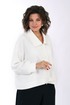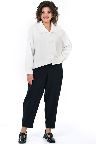 Жакет прямого, свободного силуэта, с застёжкой на петли, пуговицы, со спущенной линией плеча, с фигурной линией низа и притачным поясом. Рукава втачные, одношовные, длинные, понизу со сборкой, притачными манжетами. Воротник отложной.