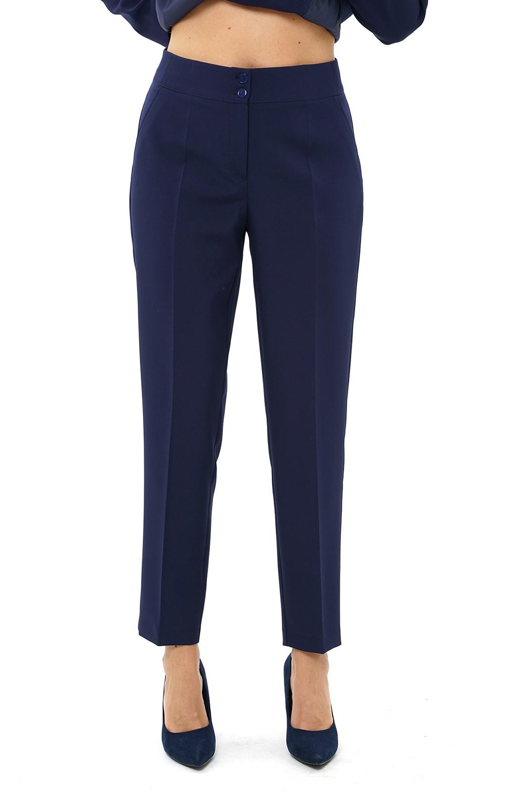 Брюки со сгибом, на широком притачном поясе состоящим из частей. Застежка типа «гульфик» на молнию и по краю пояса на петли, пуговицу. Передние части имитацией боковых косых карманов с отрезным бочком. Задние части с талевыми выточками.