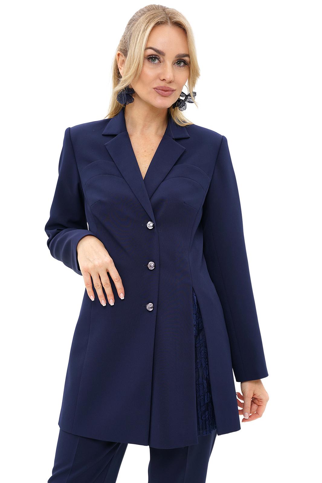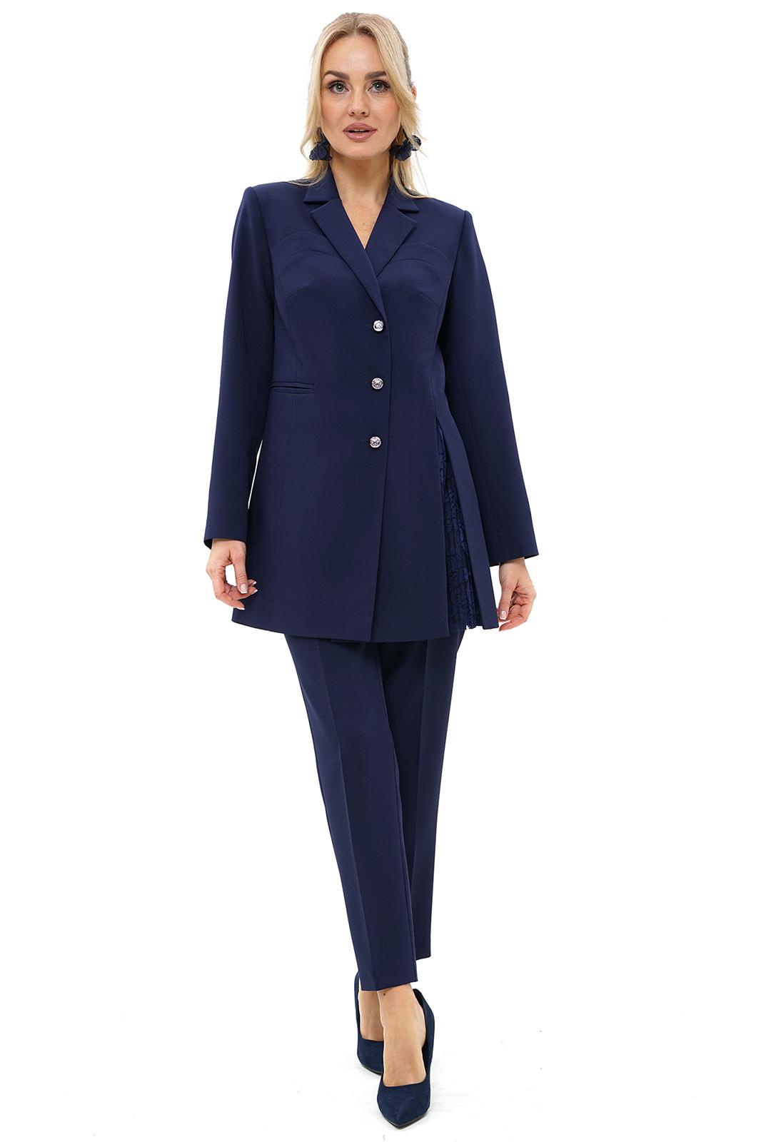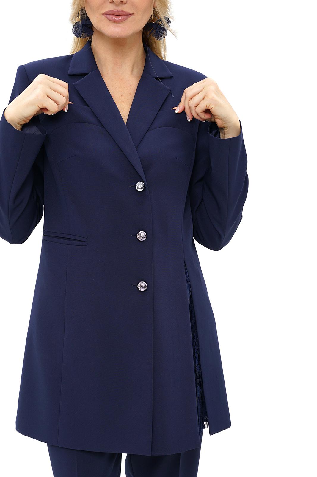 Жакет полуприлегающего силуэта, на подкладке, с центральной застёжкой слегка смещённой влево на петли, пуговицы. Перед с отложными лацканами, с рельефными швами и нагрудными выточками, вверху с конструктивным подрезом и отделочной деталью. По правой части прорезной карман с двумя обтачками, по левой части разрез в рельефном шве с отделочной деталью (отделочная ткань плиссе). Спинка с рельефными швами и средним швом. Рукава втачные, двухшовные, длинные. Воротник отложной.
