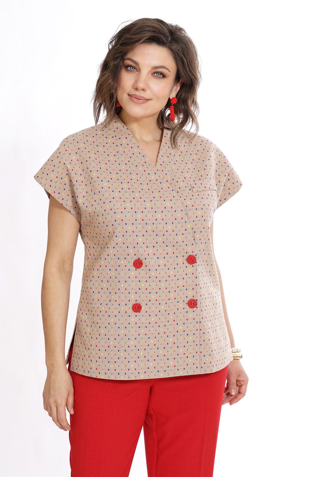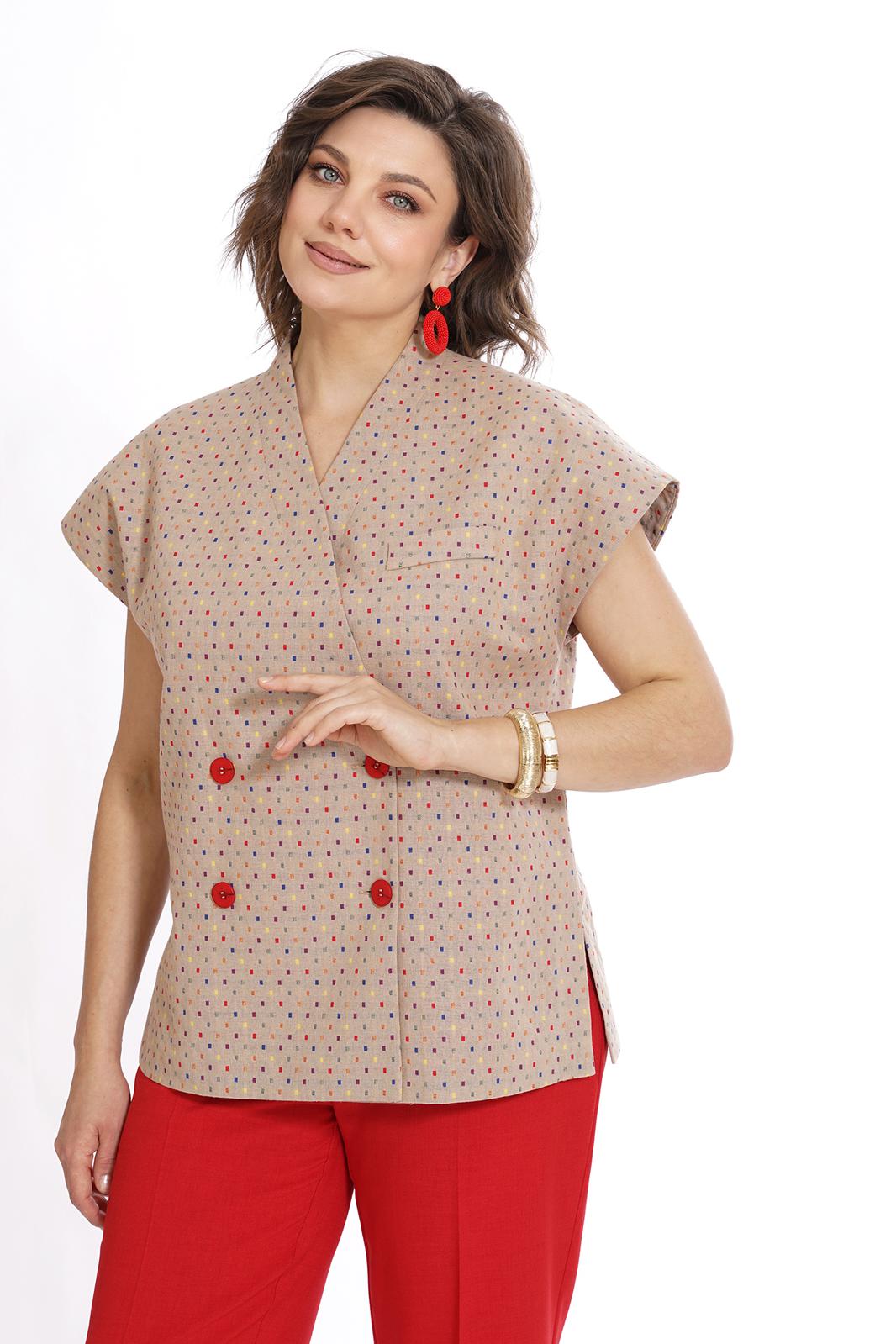 Жилет полуприлегающего силуэта, с двух-бортной застёжкой на петли, пуговицы и с внутренней застёжкой на петлю, пуговицу, со спущенной линией плеча, с разрезами по боковым швам. Перед по левой части с верхним декоративным карманом. Воротник по переду цельнокроеная стойка переходящая на спинку.