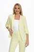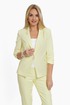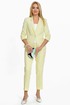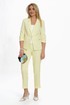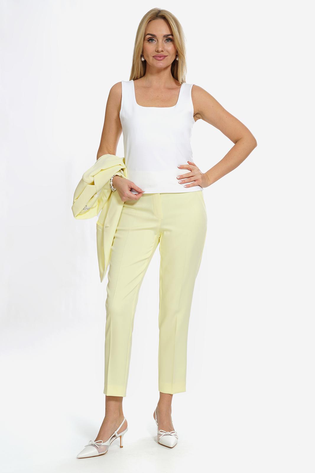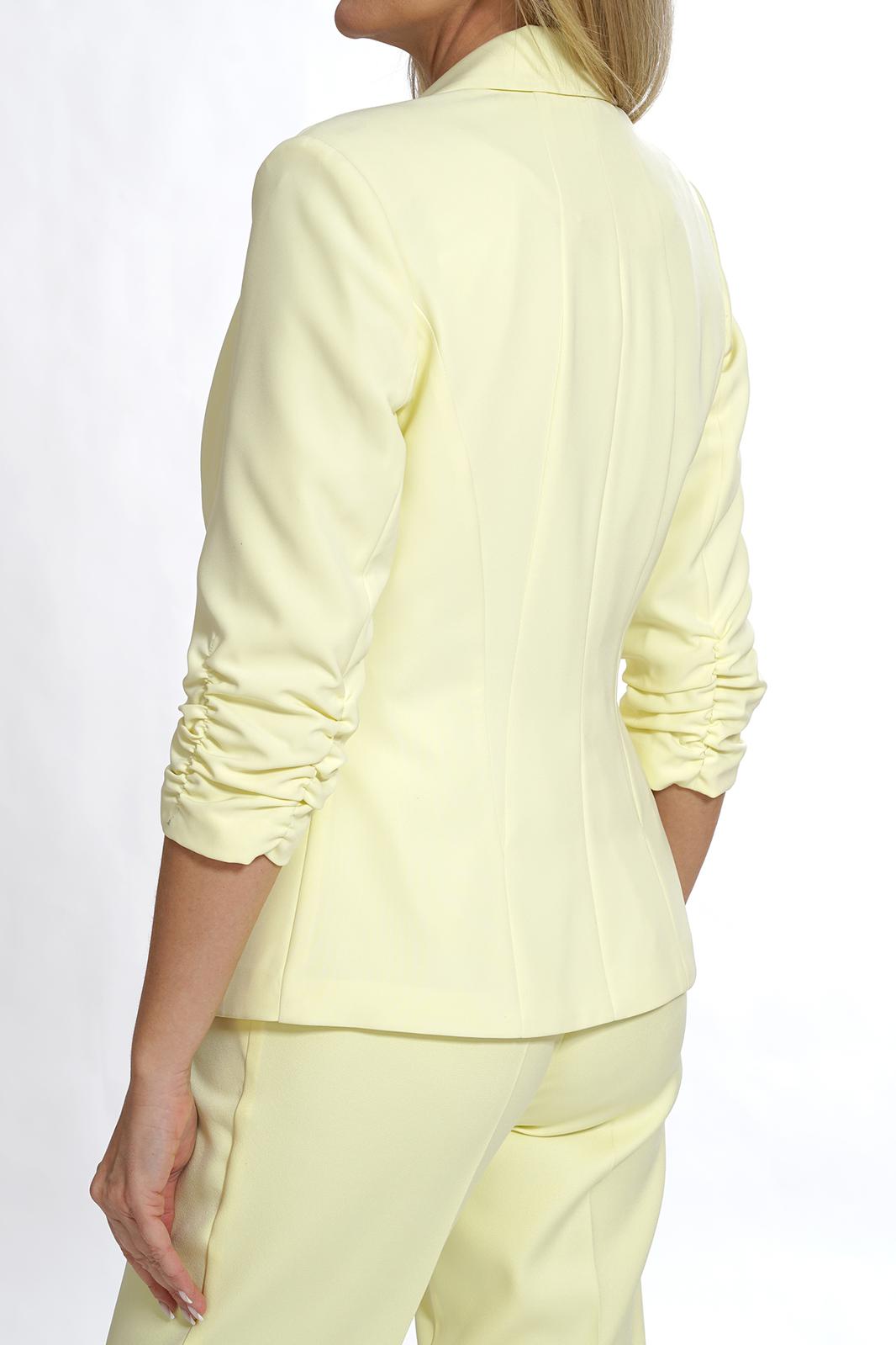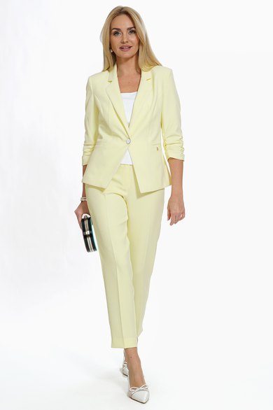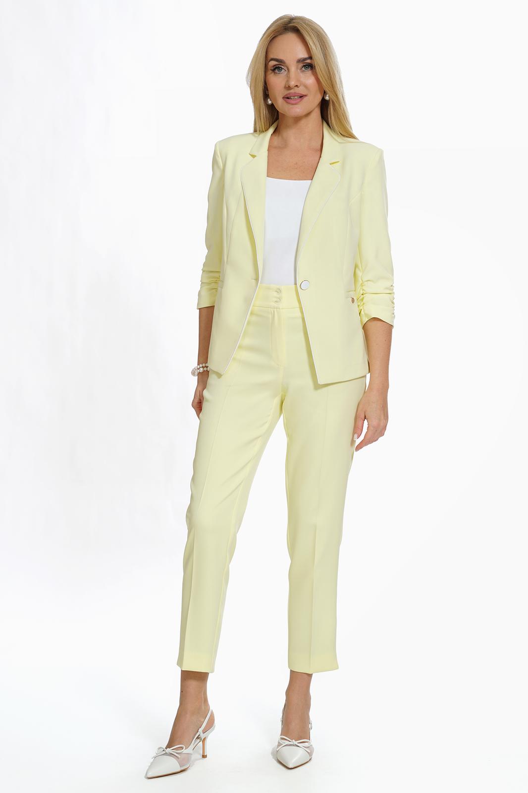 Комплект женский 3-х предметный состоит из жакета, топа и брюк. Жакет полуприлегающего силуэта, на подкладке, с отложными лацканами с центральной застёжкой на петлю, пуговицу, по лацкану, краю борта вставлен отделочный кант. Перед с фигурными рельефными швами с прорезными карманами с листочкой. Спинка со средним швом и фигурными рельефными швами. Рукава втачные, двухновные, длиной ¾, понизу со сборкой. Воротник отложной с отворотом.