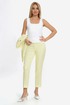 Брюки длиной 7/8, со сгибом, на широком притачном поясе, с застежкой типа «гульфик» на молнию и петлю, пуговицу по краю пояса. Понизу боковых швов разрезы.