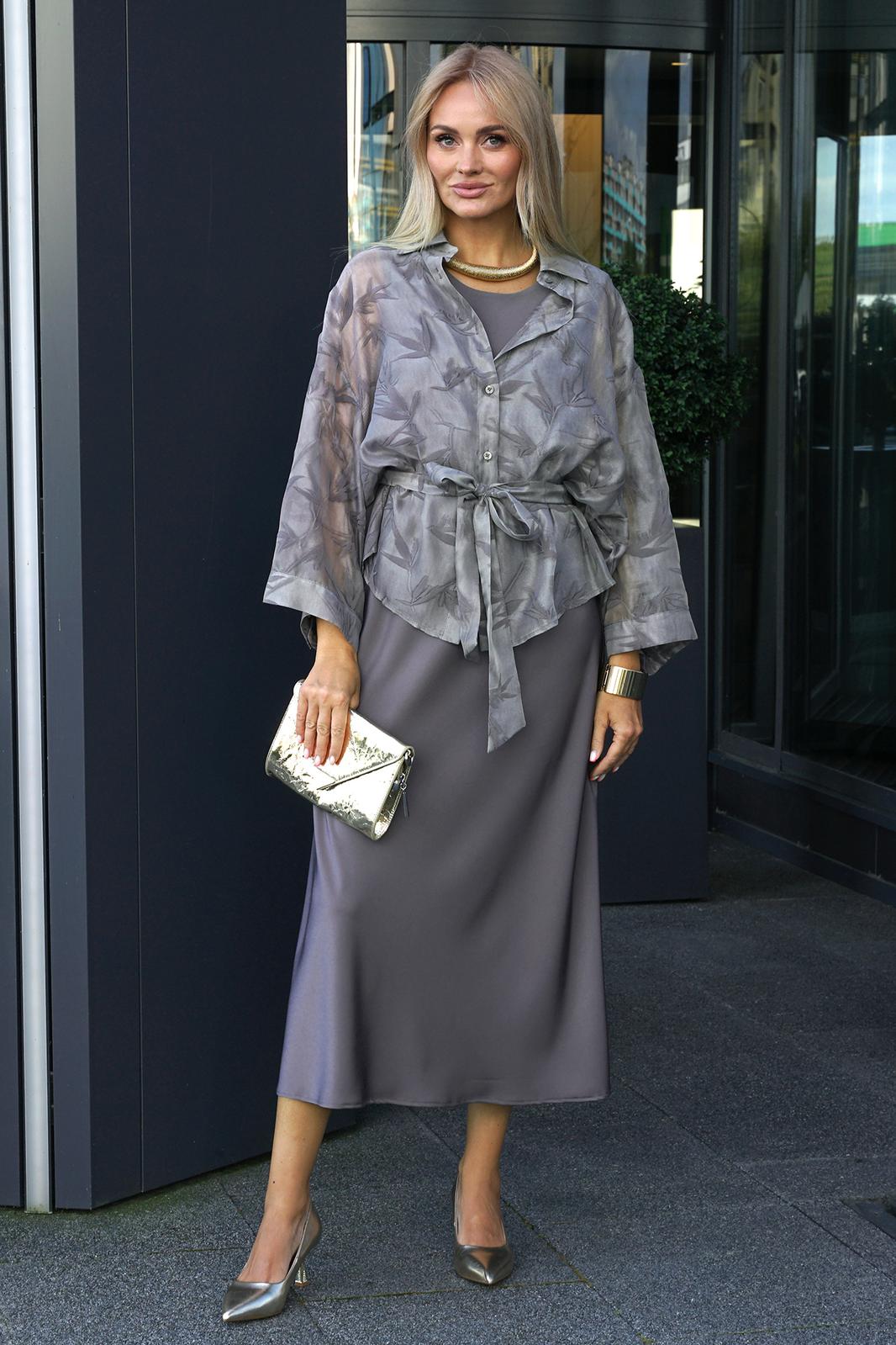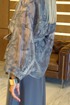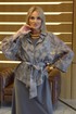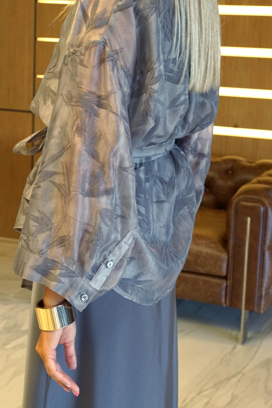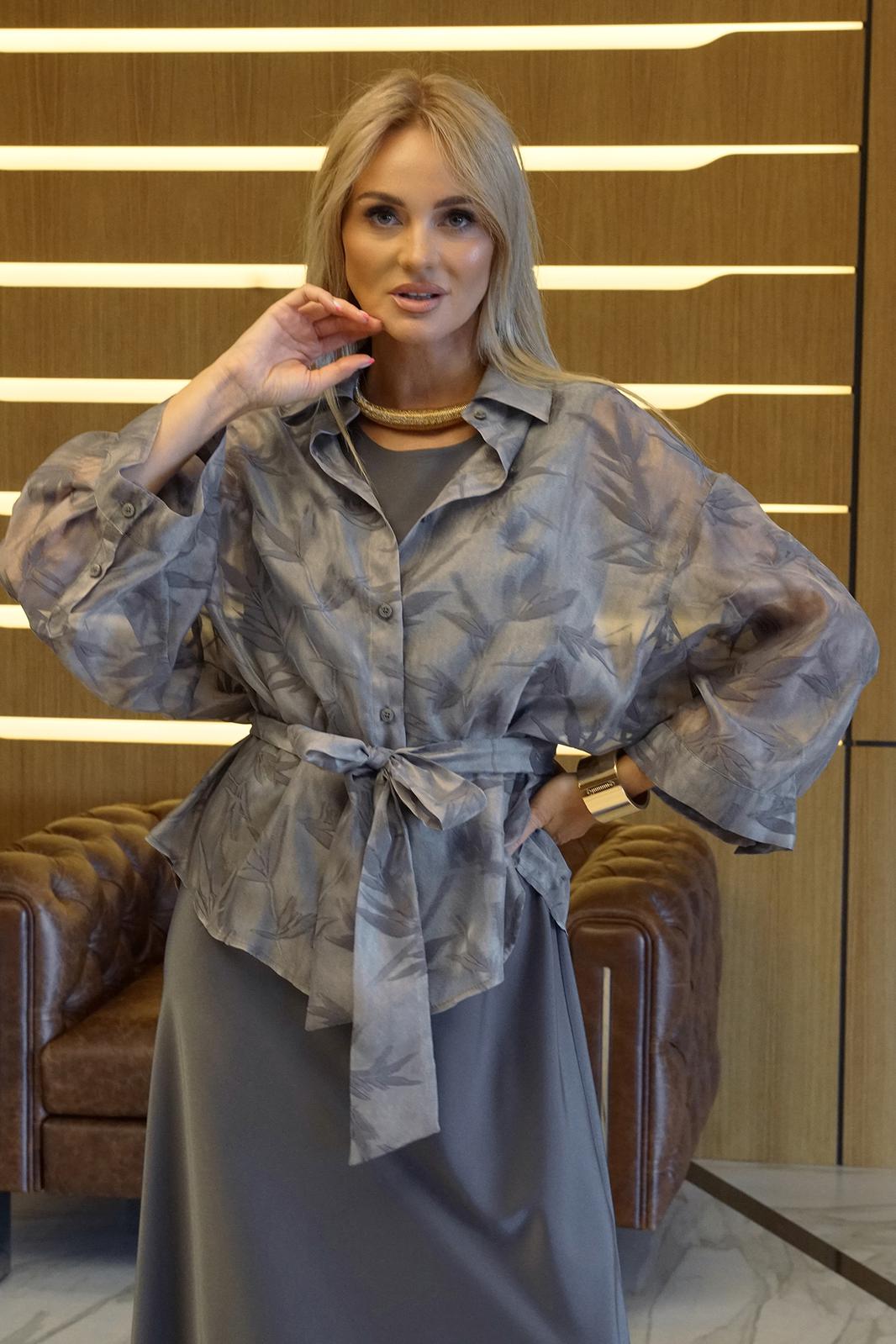 Блузка прямого, свободного силуэта, с завязывающимся поясом, с застёжкой на петли, пуговицы, с разно-уровневым низом (спинка длиннее переда). Спинка с притачной кокеткой и бантовой складкой. Рукава втачные, одношовные, длиной ¾, понизу вдоль разреза планка, мягкие складки и притачные манжеты, застёгивающиеся на петли, пуговицы.