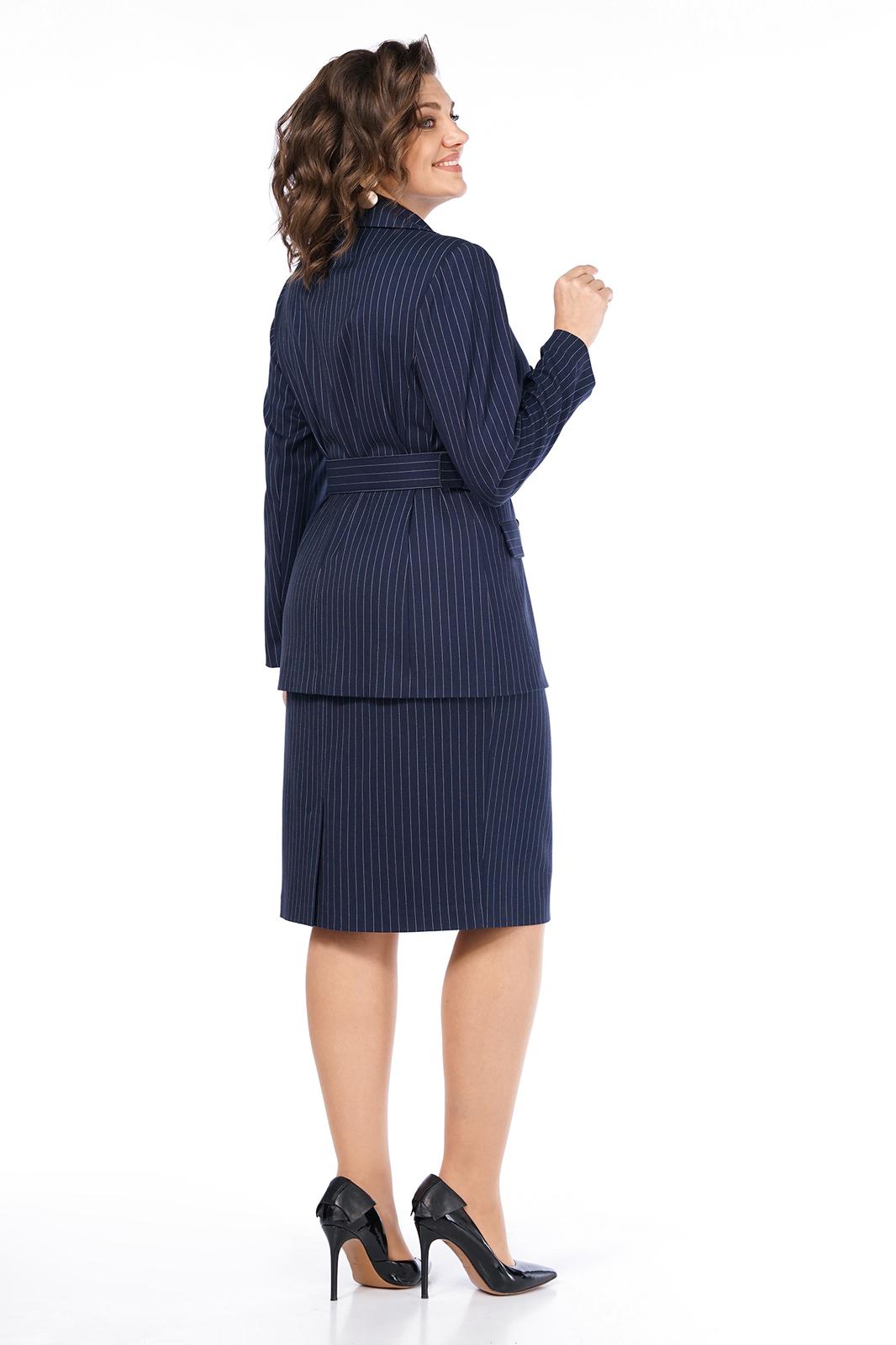 Жакет полуприлегающего силуэта, перед на подкладке, с двух-бортной застёжкой на петли, пуговицы и отделочными симметрично расположенными пуговицами и с внутренней застёжкой на петлю и пуговицу. В дополнении ремень из основной ткани.