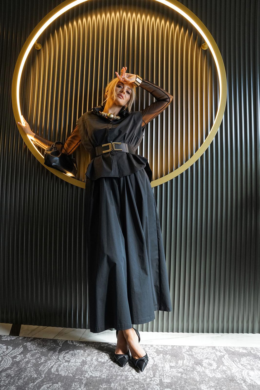 Перед с притачными кокетками. Спинка с притачной кокеткой и мягкой складкой по шву соединения. Воротник стояче-отложной на отрезной стойке застёгивающийся на петлю, пуговицу.