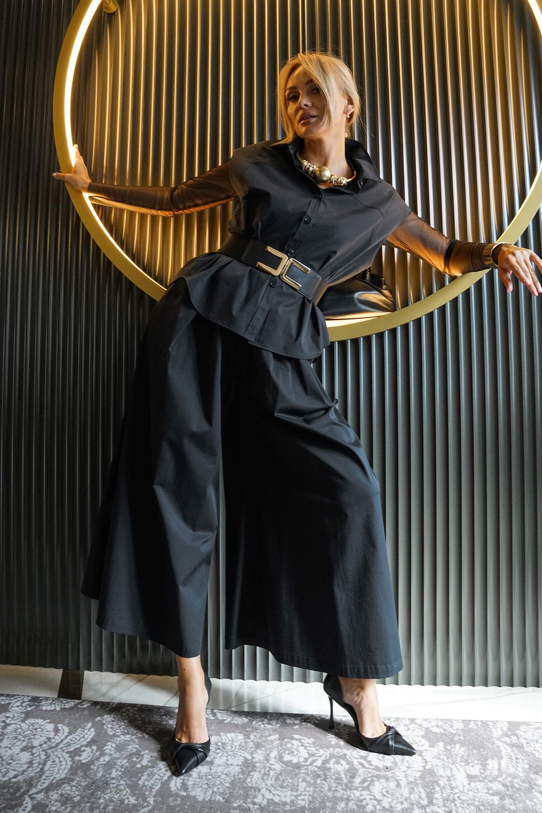 Юбка-Брюки широкие свободного силуэта, с притачным поясом на резинке. Передние части с мягкими складками от пояса и косыми боковыми карманами.