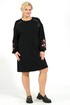 Платье женское прямого силуэта, со спущенной линией плеча, рукава понизу декорированы вышивкой. Перед с притачными каскетками в шве соединения с отделочной тесьмой «кружево». Горловина с втачной бейкой. Рукава длинные, одношовные, понизу с притачными манжетами. Бейка горловины, манжеты рукава выполнены из отделочной ткани «довяз».