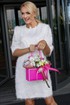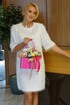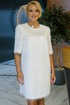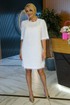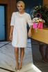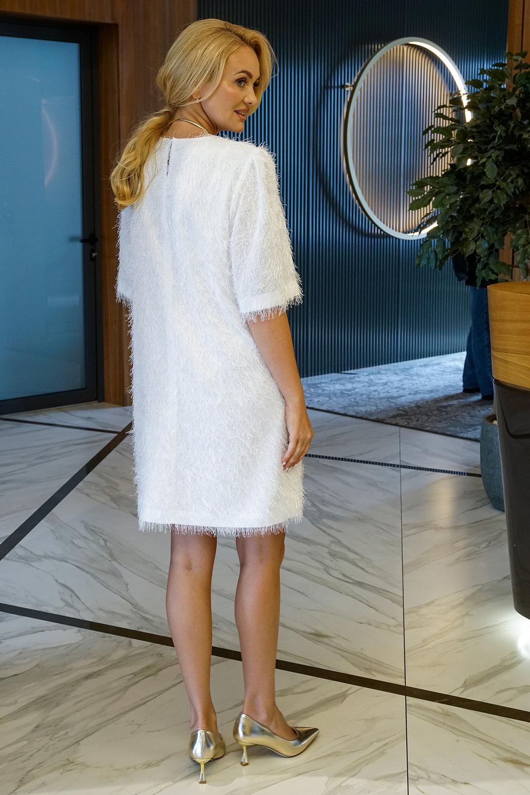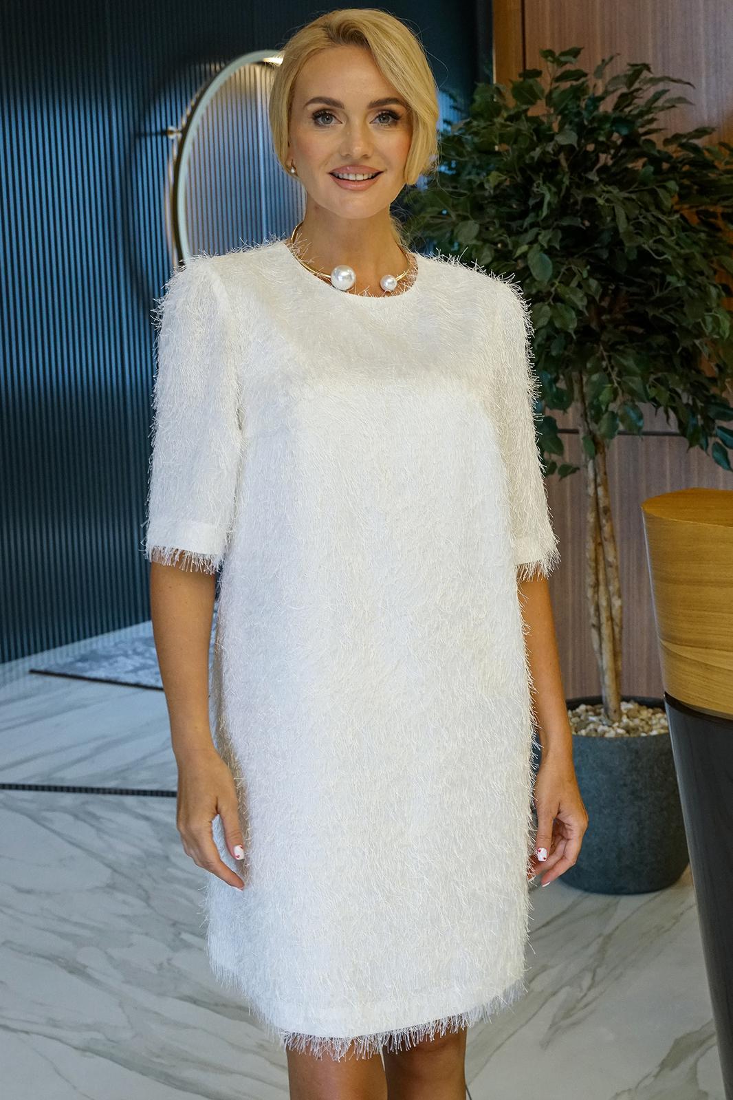 Платье А- образного силуэта, на подкладке. Перед с нагрудными выточками. Спинка со средним швом с разрезом и застёжкой на навесную петлю и пуговицу. Рукава втачные, одношовные, короткие.