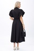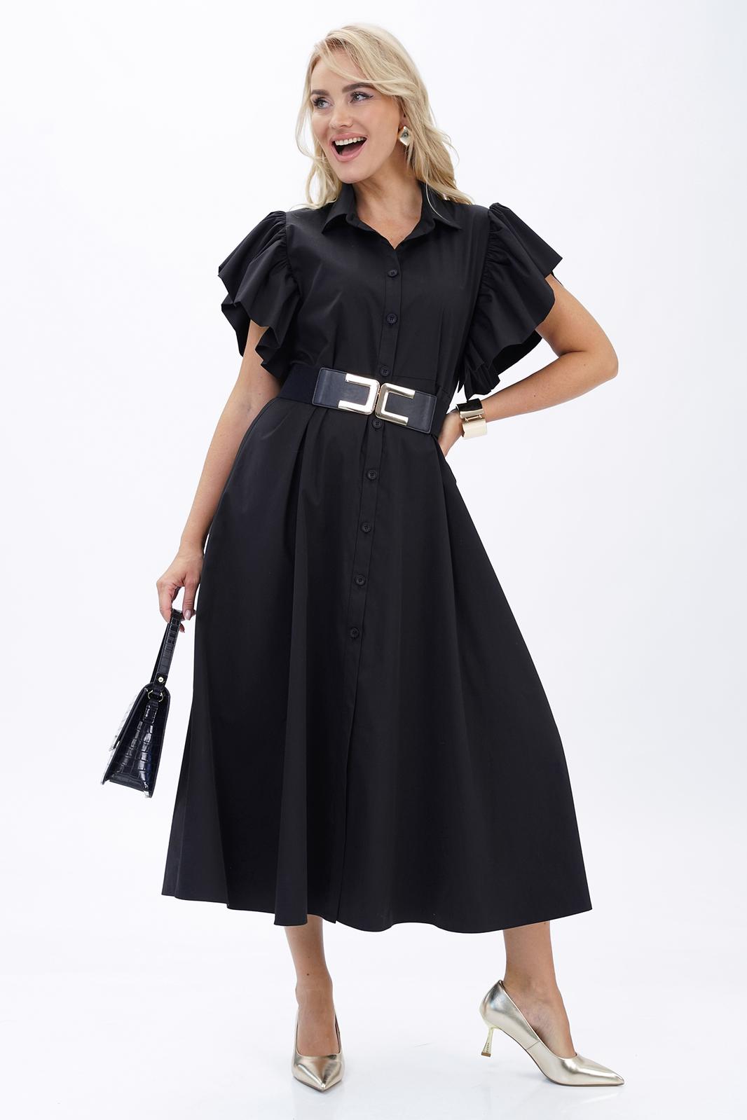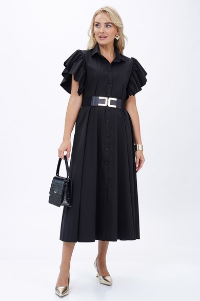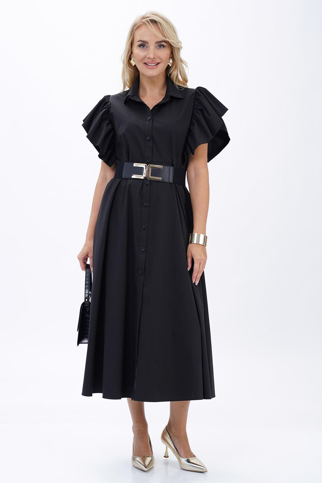 Платье женское полуприлегающего силуэта вверху с расширением книзу, отрезное по линии талии, в дополнении ремень. С застёжкой по притачной планке на петли, пуговицы. С короткими рукавами «крылышко» собраны на сборку. Воротник стояче-отложной на отрезной стойке, застёгивающейся на петлю, пуговицу.