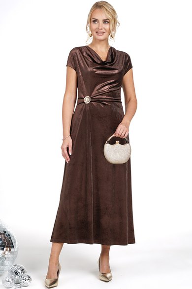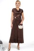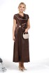 Платье полуприлегающего верху силуэта с расширением книзу, со спущенной линией плеча. Перед отрезной по линии талии, с драпировками выходящие от правого бокового декорированные пришивным украшением. Спинка со средним швом. Вырез по переду оформлен драпированной «качелей».