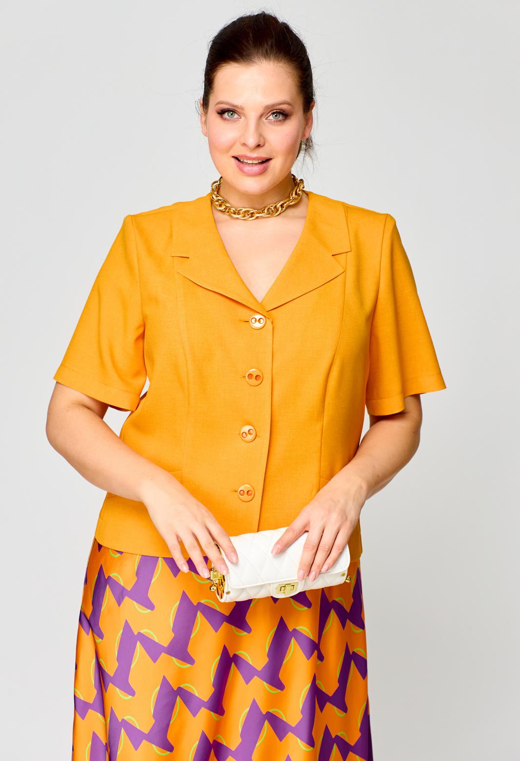 Костюм женский состоящий из жакета и юбки. Жакет полуприлегающего силуэта с центральной застёжкой на 4 петли и пуговицы и округлым вырезом горловины с имитацией воротника фигурной формы, перед с вертикальными рельефами, спинка со средним швом и отрезными бочками. Юбка полусолнце на подкладке с притачным поясом с резинкой.