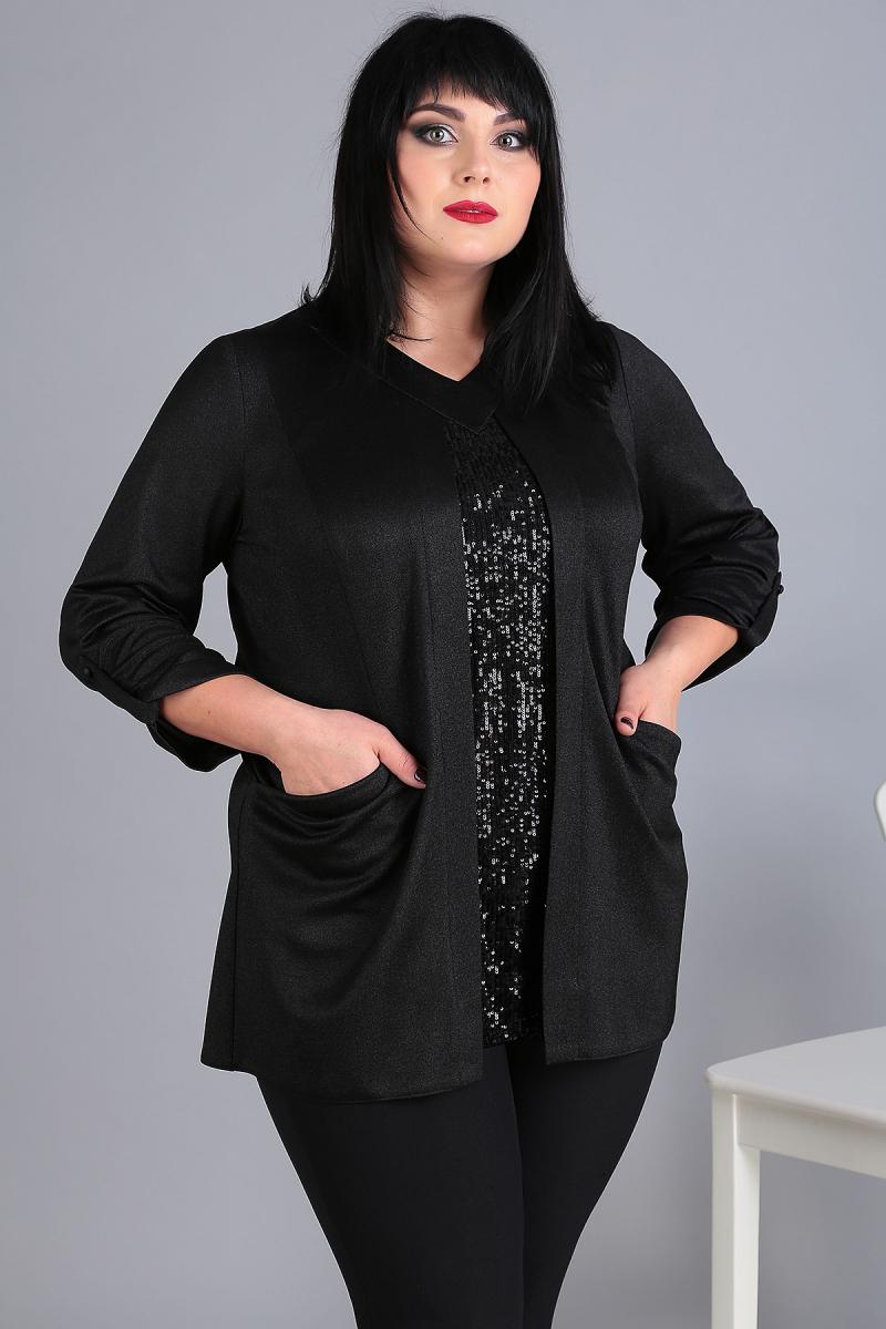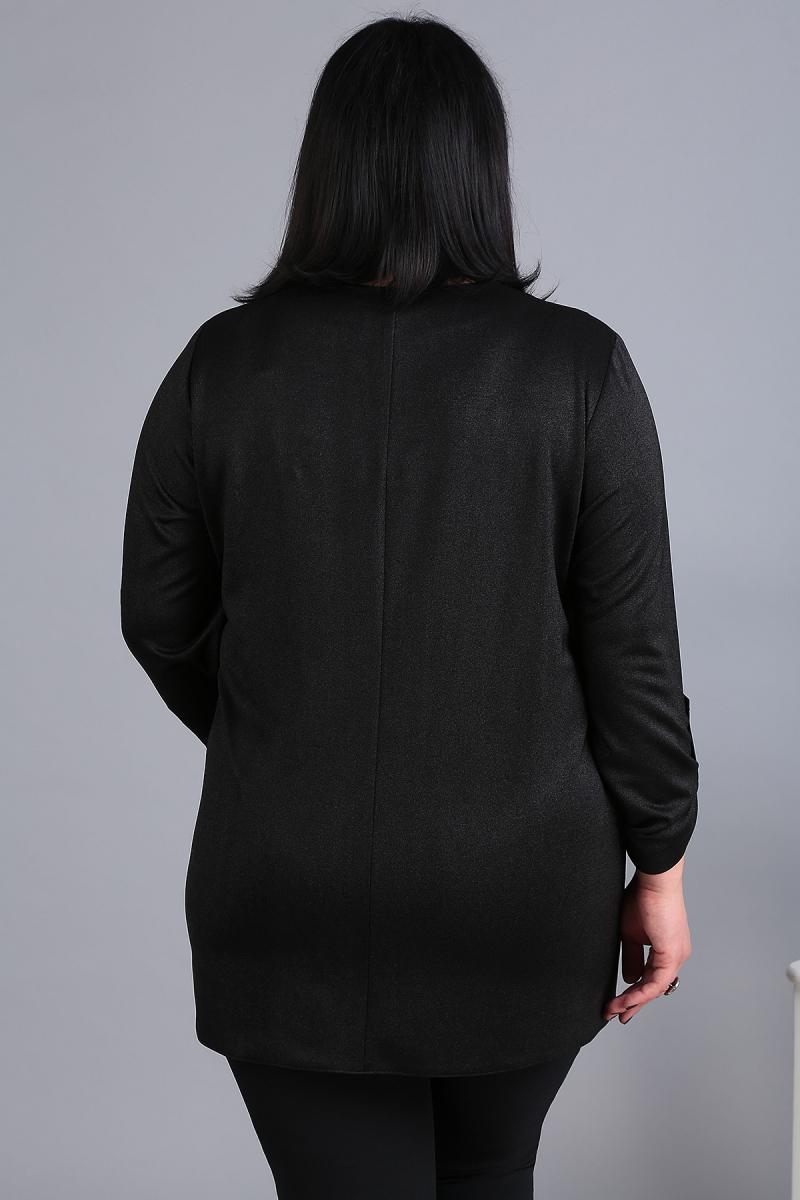 Блуза из трикотажного полотна с легким блеском и вставкой из пайеток станет настоящей палочкой–выручалочкой для торжественных случаев. Перед с рельефами, выходящими из плечевого шва, заканчивающимися функциональными карманами. По центру декоративная вставка из пайеток. Горловина v-образная с планкой. Спинка со средним швом. Рукав одношовный, длинный с патой и пуговицей.