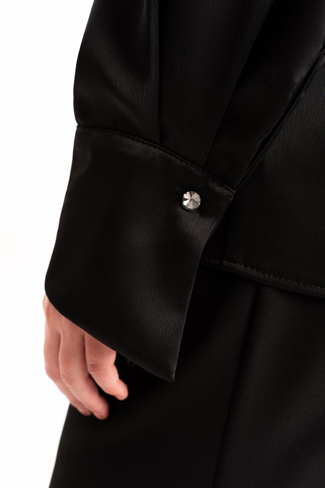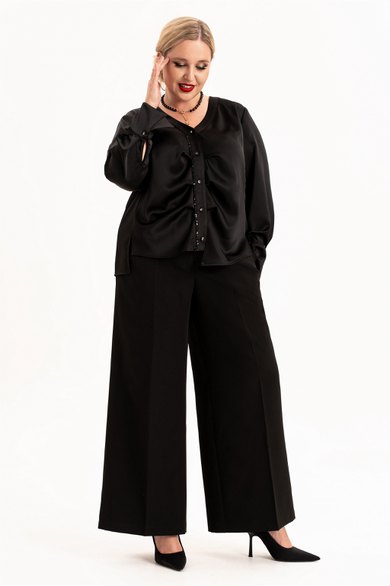 Элегантный женский брючный костюм — настоящая находка для тех, кто ищет идеальный образ на праздник, свадьбу или важный вечер. Классический крой и свободные брюки палаццо подчёркивают достоинства фигуры и дарят комфорт. Нарядный и вечерний стиль — безупречно смотрится на большом мероприятии, создавая образ, полный уверенности и шарма. Блуза выполнена из шелковистой ткани с приятной фактурой. Блузка с длинными струящимися рукавами выглядит очень изящно и очаровательно. Блузка без воротника, застежка на петли и пуговицы по планке, с V – образным вырезом горловины. Спинка с декоративным элементом из паеток. По переду вдоль планок заложены складки и обработан кант из паеток. Изделие асимметрично по низу. Боковые швы перенесены в линию рельфа полочки и спинки. В рельефах полочки обработаны разрезы. Рукав со складкой по шву притачивания манжеты. Прямого силуэта с втачным , длинным рукавом. Брюки с широкими штанинами палаццо выгодно подчеркивают женственные формы, а свободный крой обеспечивает удобство в любой ситуации. На брюках обработаны карманы в боковых швах, по талии пояс с застежкой на молнию и частично на резинке. Красивая двойка строгого силуэта — идеальное сочетание для торжеств и даже для делового офисного дресс кода. Подходит для женщин больших и полных размеров, продуманный крой визуально стройнит, подчёркивает талию и скрывает лишнее. Создайте идеальный образ — выберите стильный женский нарядный костюм с брюками палаццо и подчеркните свою индивидуальность!