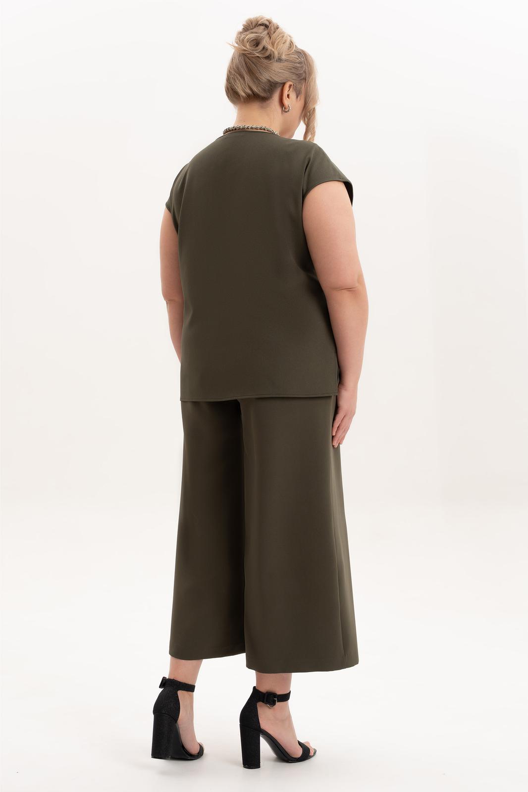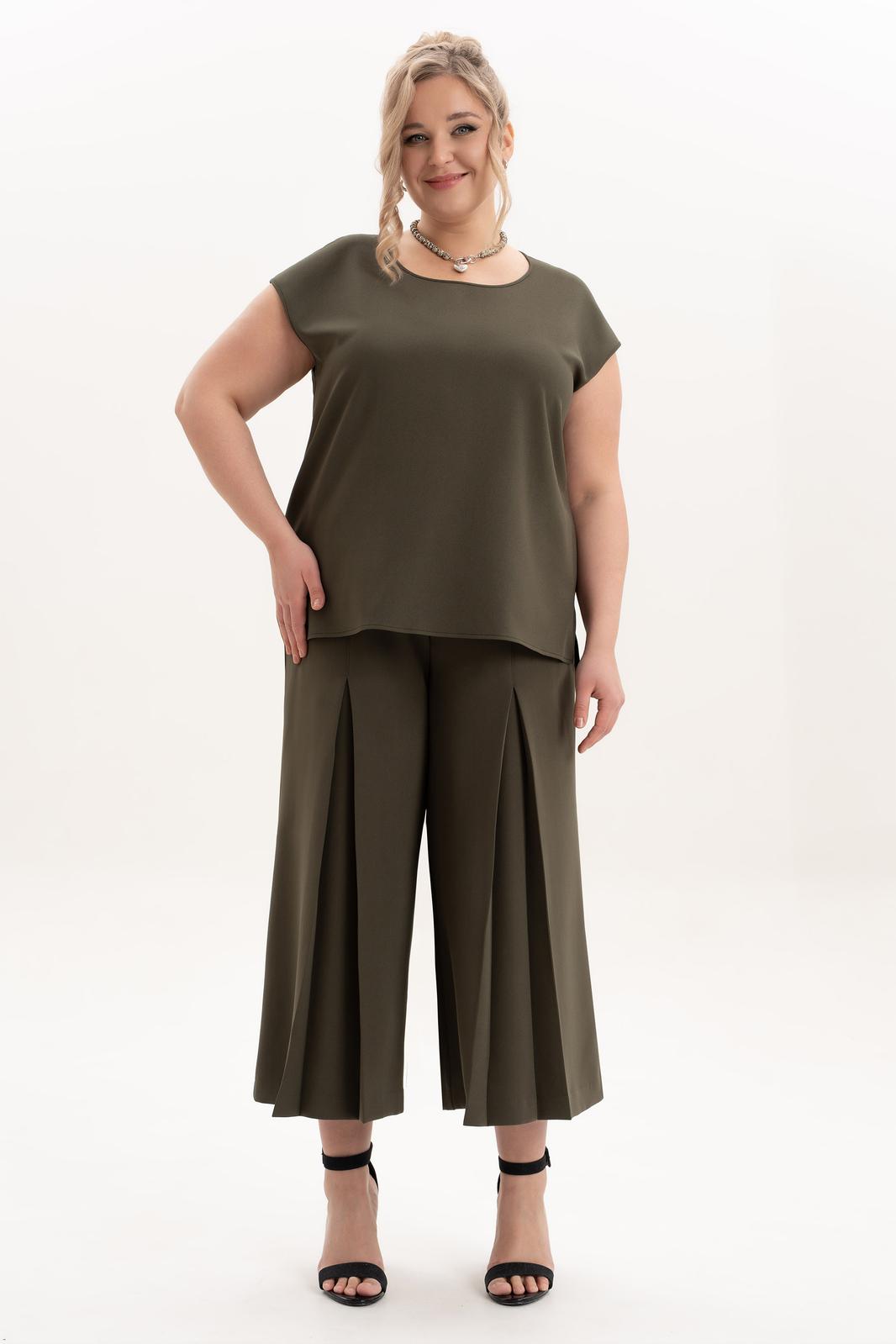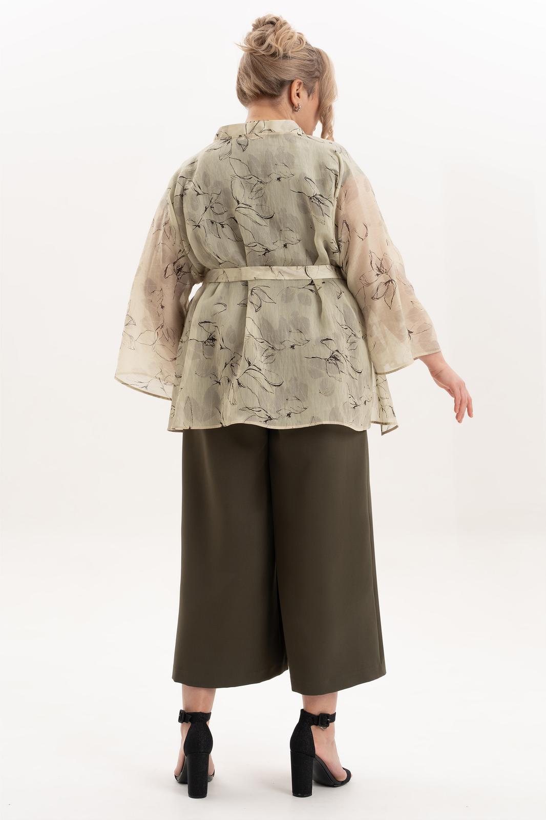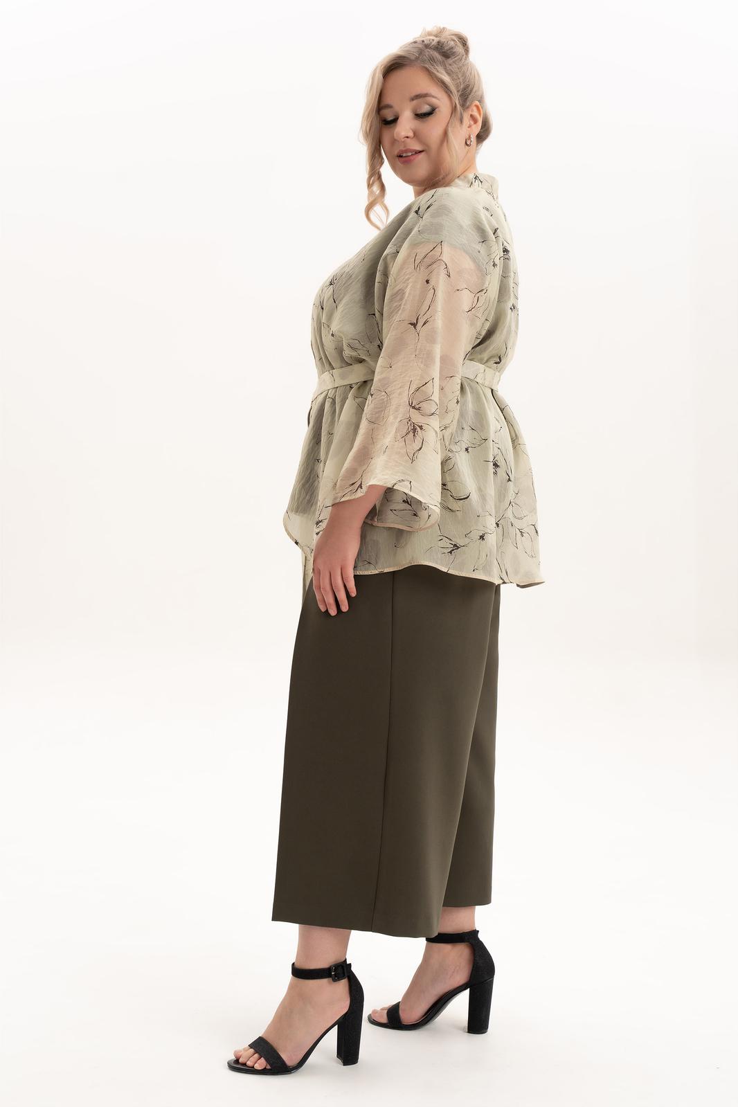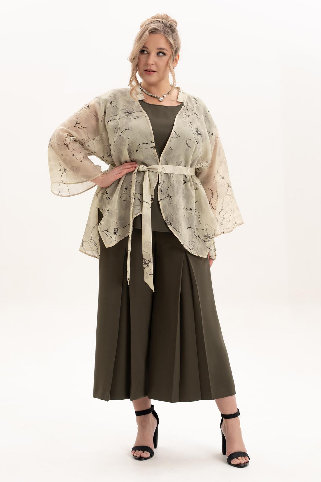 Прекрасный комплект, в состав которого входят брюки кюлоты, блуза и шифоновый кардиган. Лёгкая удлинённая накидка, блуза и кюлоты подходит для девушек любого возраста. Это универсальный комплект, который станет незаменимым в вашем гардеробе. Костюмная ткань, c которой пошиты кюлоты с хорошим стрейч-эффектом добавит комфорта при носке изделия. Кюлоты выполнены в стиле палаццо с укорочённой длиной, что делает её идеальной для любой поры года. Кардиган из шифона свободного силуэта с воротником стойка. В комплект к накидке идёт съёмный пояс. В боковых швах накидки есть небольшие, слегка переходящие на перёд разрезы. Блуза выполнена с приятной на ощупь ткани. Спущенная линия плеча в сочетании с круглой горловиной невероятно женственная и изящна. В боковых швах также есть разрезы. Удобные и комфортные брюки кюлоты в этом комплекте- незаменимая в гардеробе вещь, которая подчеркнёт всю утончённость женской натуры и позволит всегда чувствовать себя комфортно. Перёд с застёжкой «молния», карманами в боковых швах, по линии предполагаемой стрелки разведена встречная складка, которая застрочена до линии бедра. Пояс в области боковых швов дополнен эластичной тесьмой. Они идеально сидят на фигуре благодаря свободной резинке, завышенной посадке. Укорочённый свободный крой брюк прекрасно сочетается с различными верхами, позволяя создать повседневные, так и более нарядные образы на свадьбу, день рождения и другие торжества,