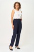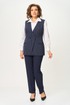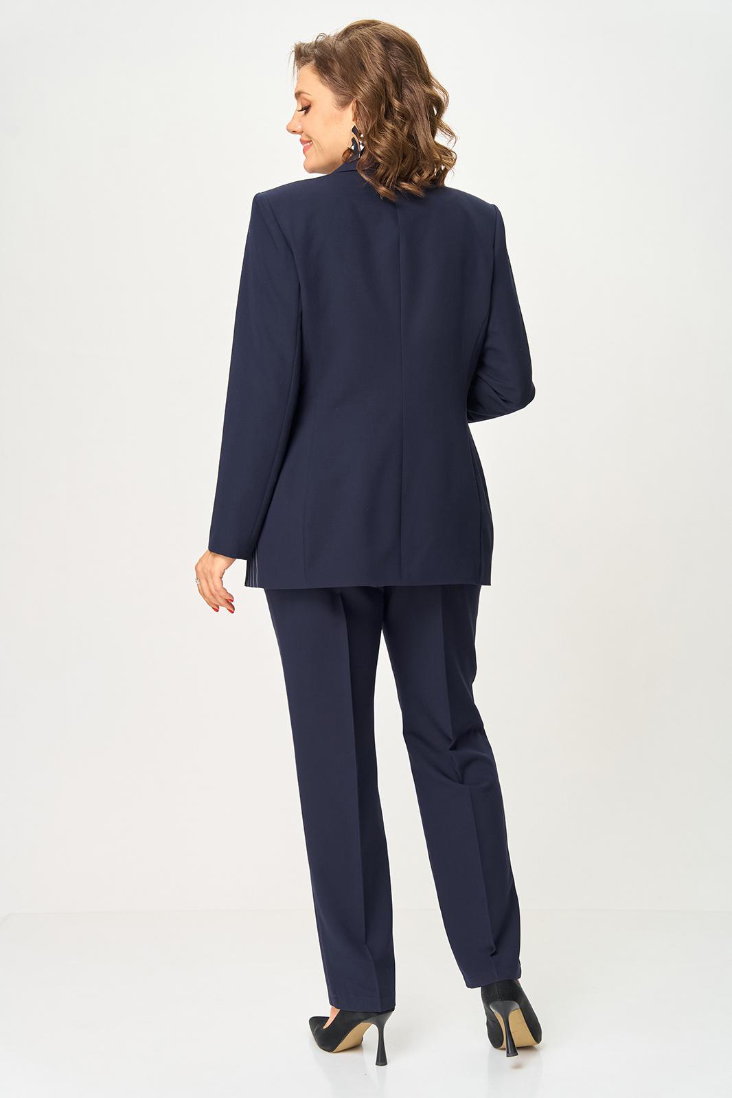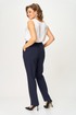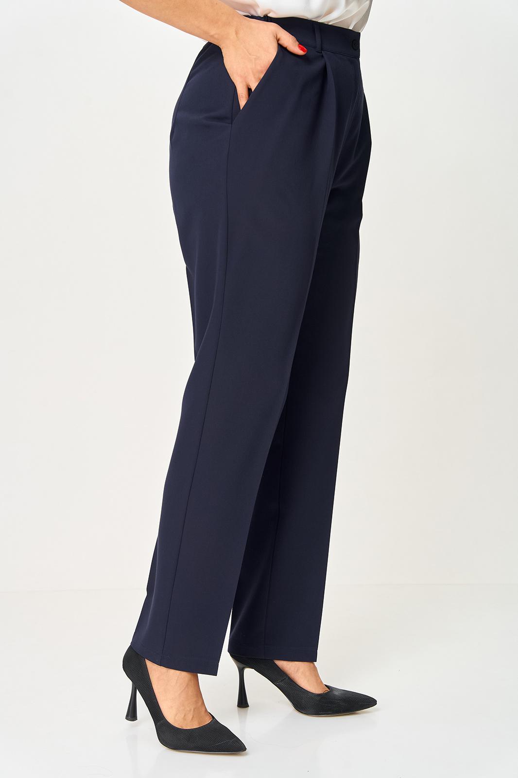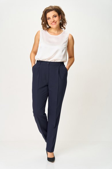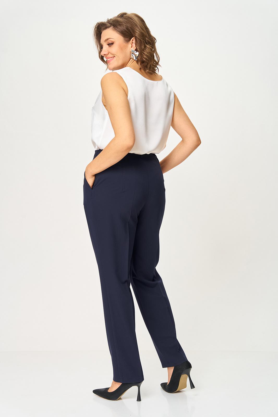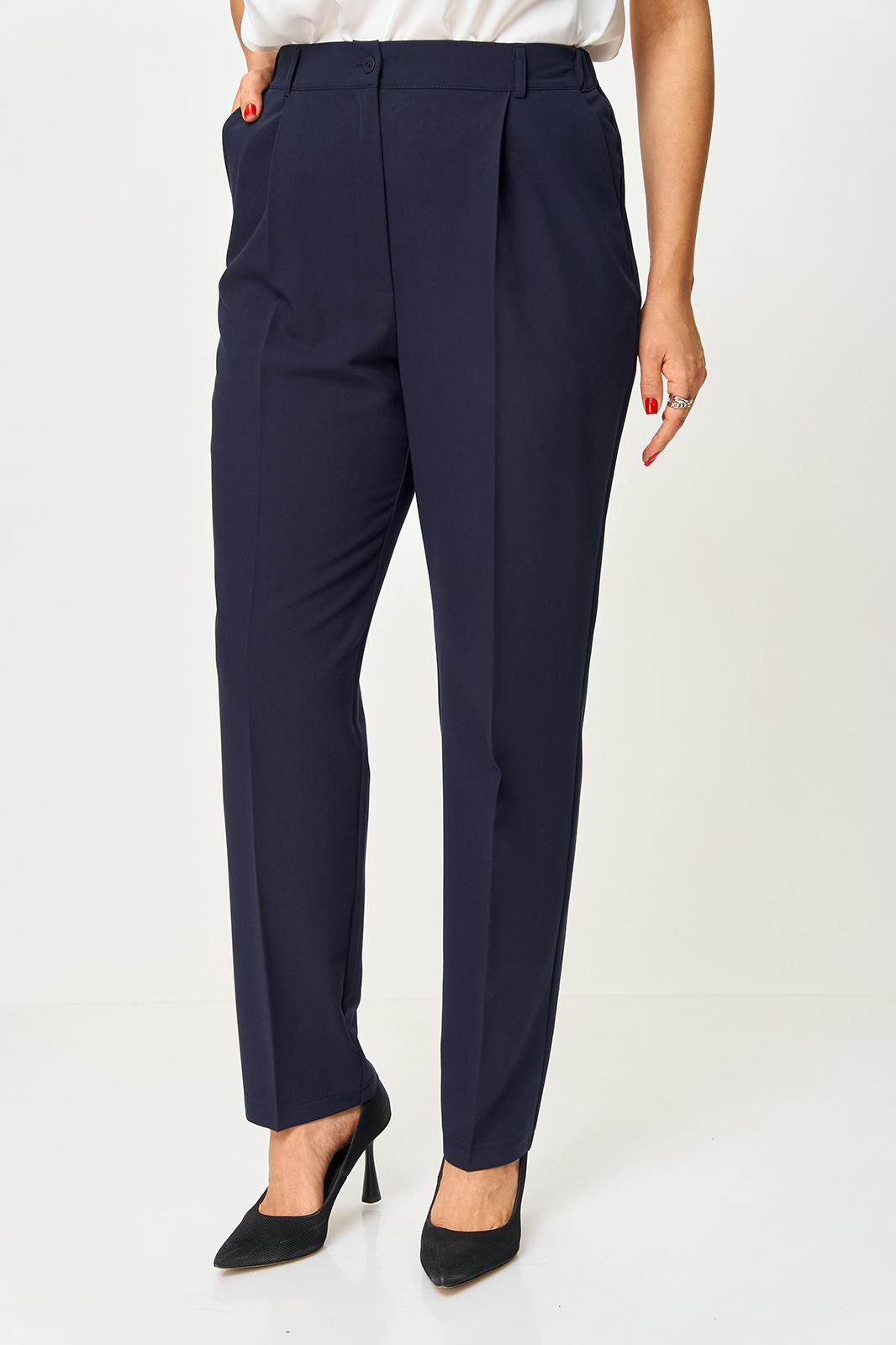 Брюки классические, со стрелками, полной длины, выполнены из однотонной ткани. В области бедер полуприлегающие, в колене и по низу прямые. По передним половинкам обработаны складки по линии талии и наклонные карманы, в среднем шве застежка на молнию. По задним половинкам обработаны талиевые вытачки. Брюки на притачном поясе с эластичной тесьмой и застежкой на петлю и пуговицу.