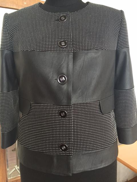 Костюм женский, выполнен из плотного трикотажа, жакет декорирован вставками из эко-кожи. Рукав 3/4