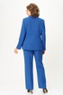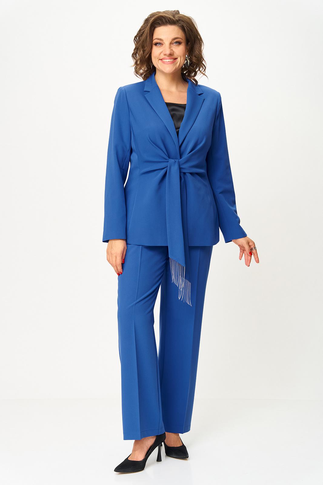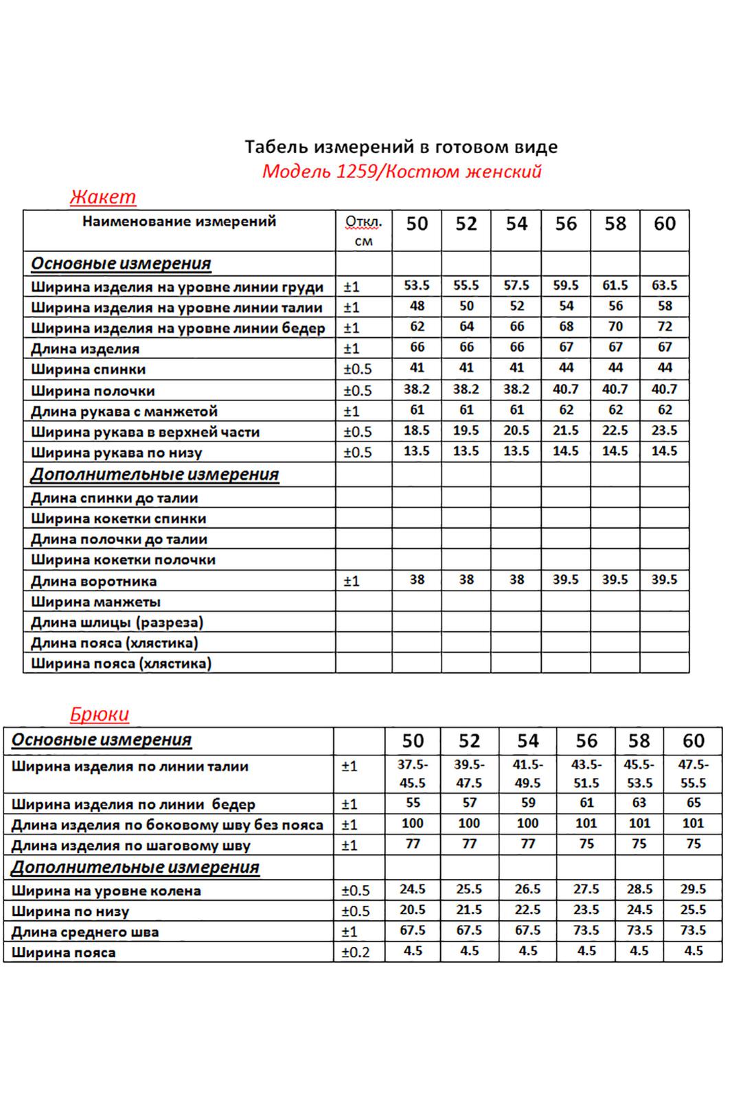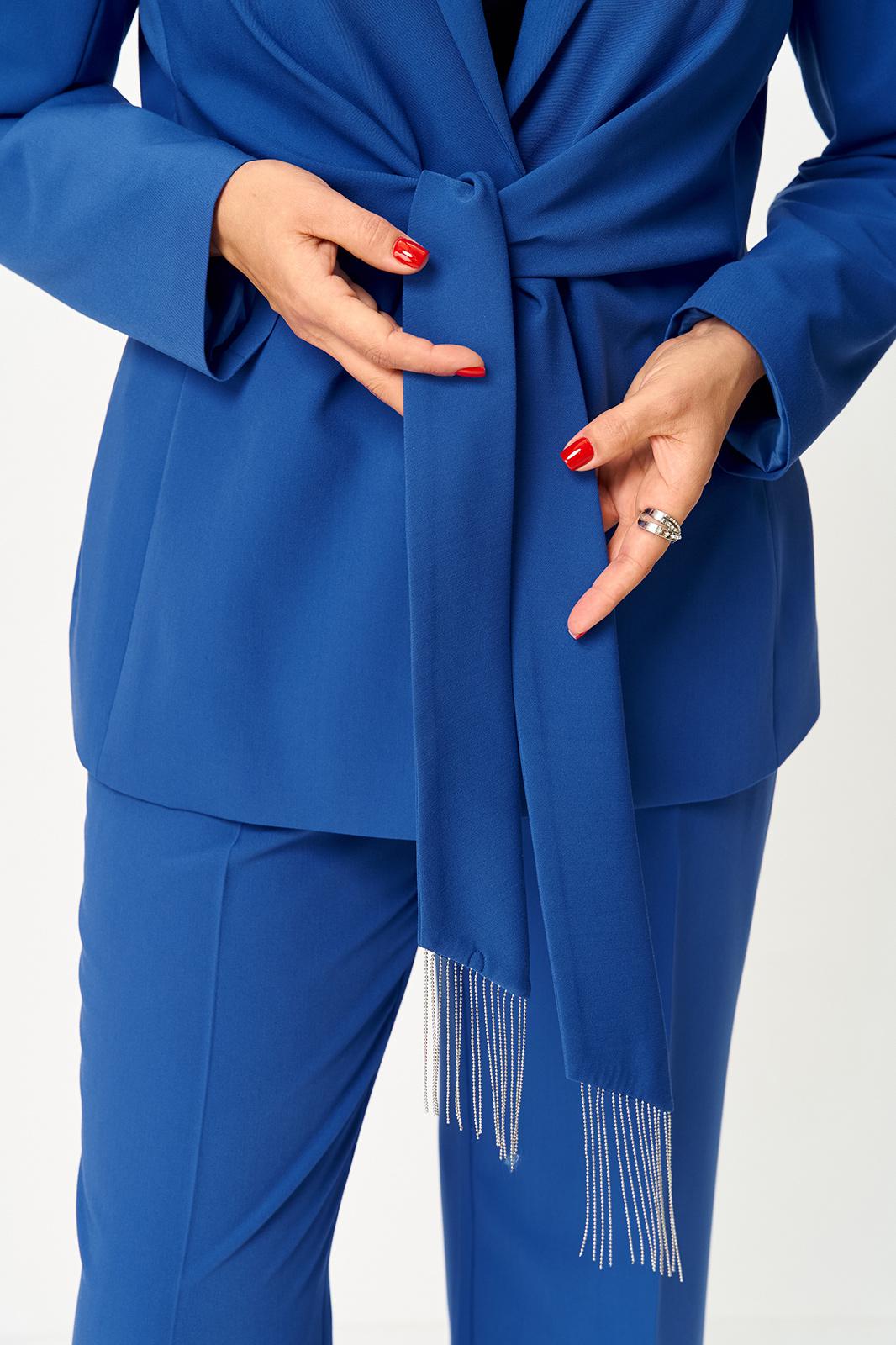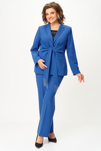 Костюм состоит из жакета и брюк, выполнен из гладкоокрашенной ткани. Жакет полуприлегающего силуэта, на подкладке. Полочка жакета с вертикальными рельефами, с застежкой на две петли и пуговицы. Воротник стояче-отложной пиджачного типа, лацканы отложные. В области талии по центру полочки обработан декоративный элемент в виде цельного пояса, завязывающегося спереди. На концах пояса втачана декоративная тесьма в виде бахромы с бусинами. Спинка со средним швом и вертикальными рельефами. Брюки со стрелками, в верхней части прилегающие к бедрам, в колене и по низу свободные. Брюки на притачном поясе с эластичной тесьмой и застежкой на петлю и пуговицу