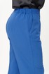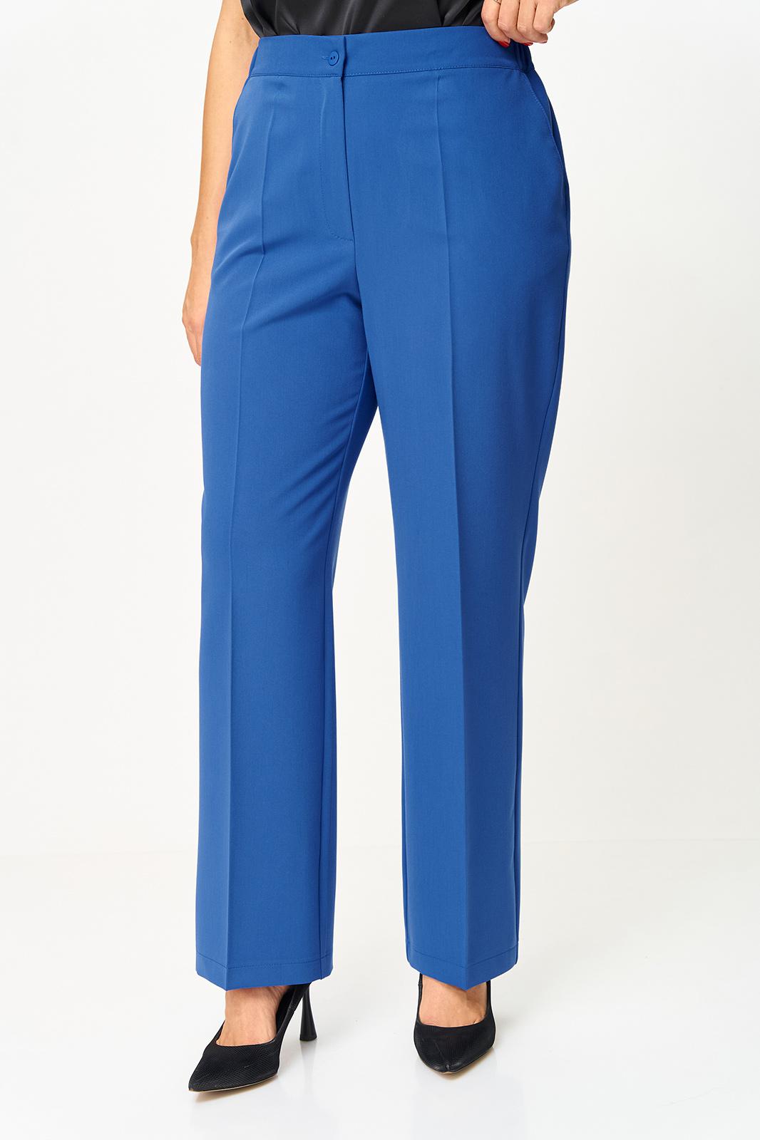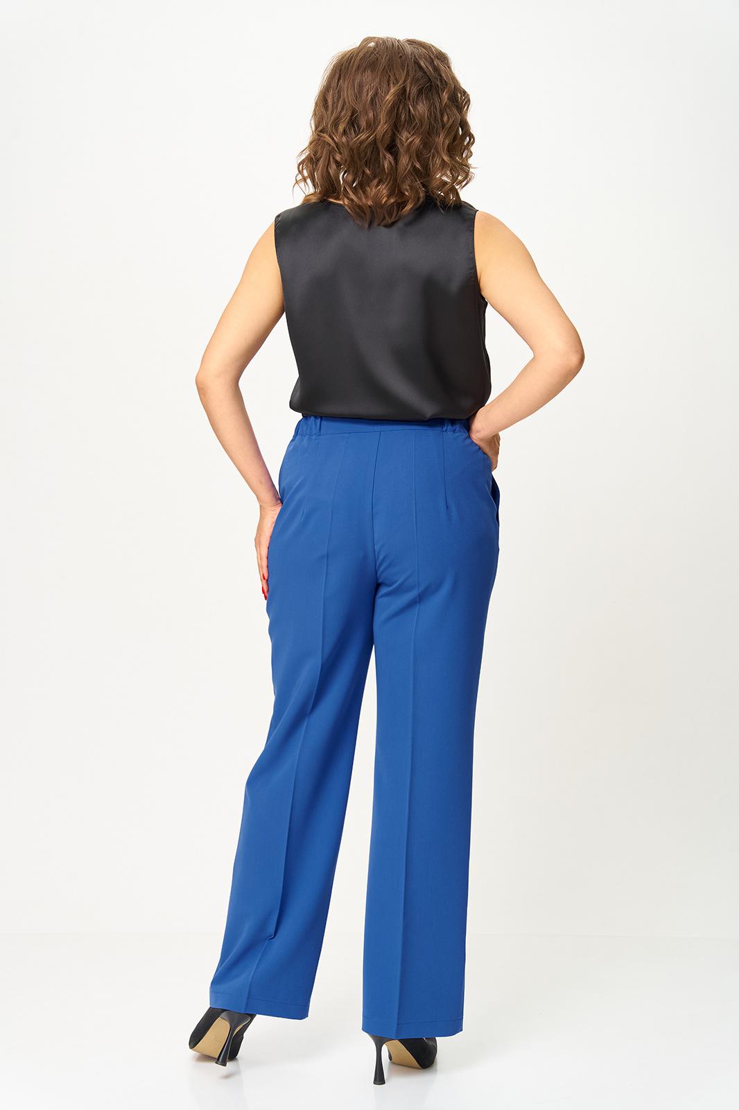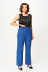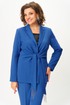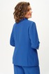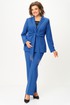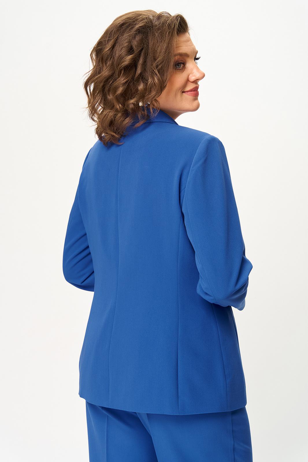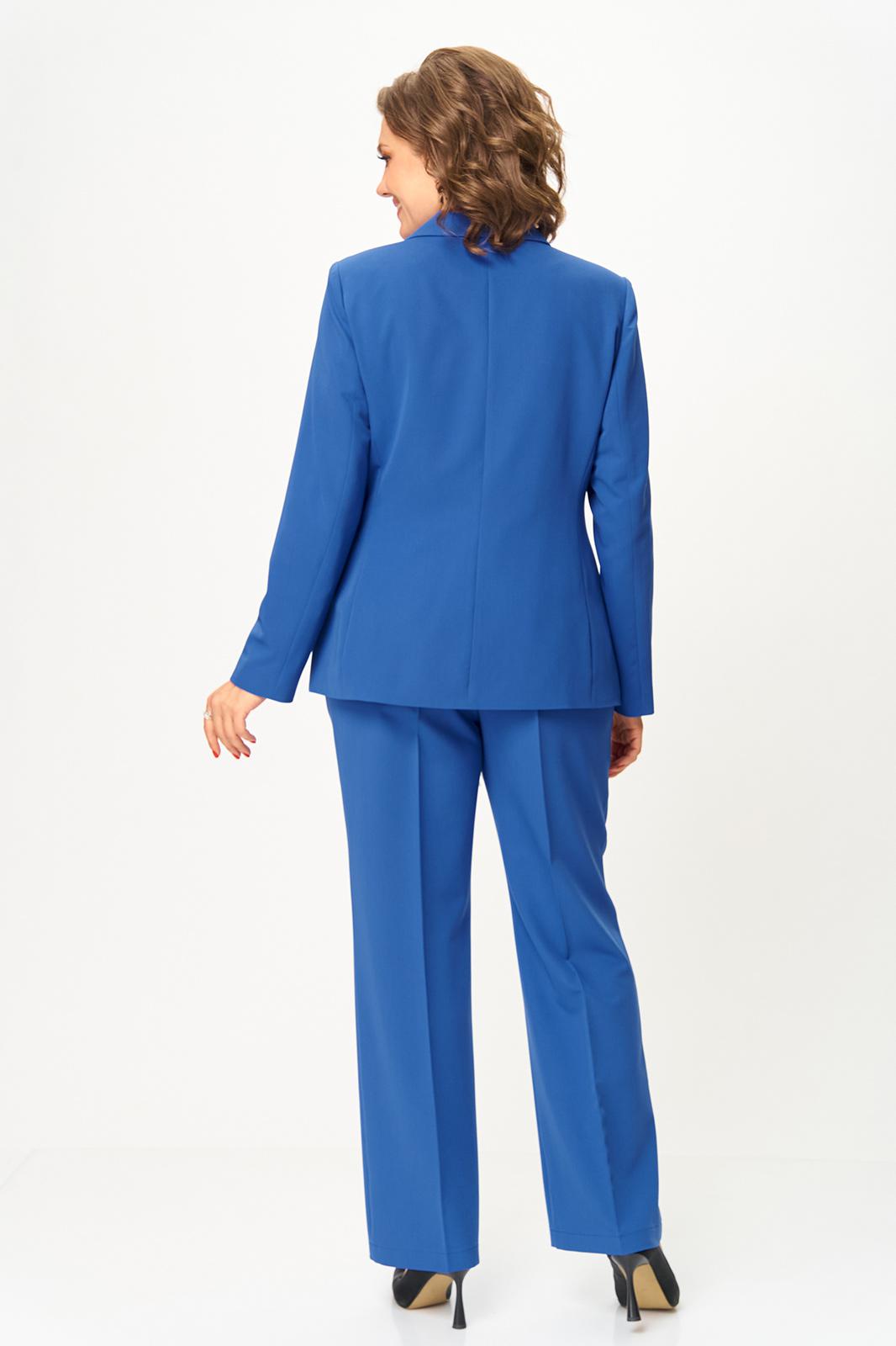 Костюм состоит из жакета и брюк, выполнен из гладкоокрашенной ткани. Жакет полуприлегающего силуэта, на подкладке. Полочка жакета с вертикальными рельефами, с застежкой на две петли и пуговицы. Воротник стояче-отложной пиджачного типа, лацканы отложные. В области талии по центру полочки обработан декоративный элемент в виде цельного пояса, завязывающегося спереди. На концах пояса втачана декоративная тесьма в виде бахромы с бусинами. Спинка со средним швом и вертикальными рельефами. Брюки со стрелками, в верхней части прилегающие к бедрам, в колене и по низу свободные. Брюки на притачном поясе с эластичной тесьмой и застежкой на петлю и пуговицу