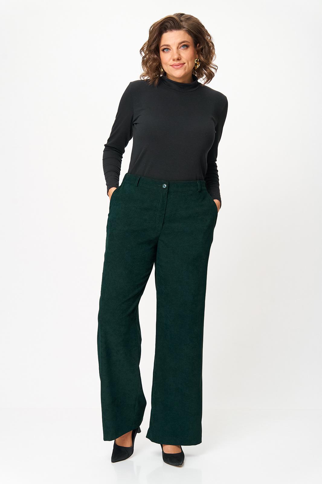 Брюки прилегающие по бедрам и свободные в области колена и по низу. На передних половинках выполнены наклонные карманы. По задним половинкам талиевые вытачки. В среднем шве передней половинки обработана застежка на молнию. Брюки на притачном поясе с эластичной тесьмой и застежкой на петлю и пуговицу.